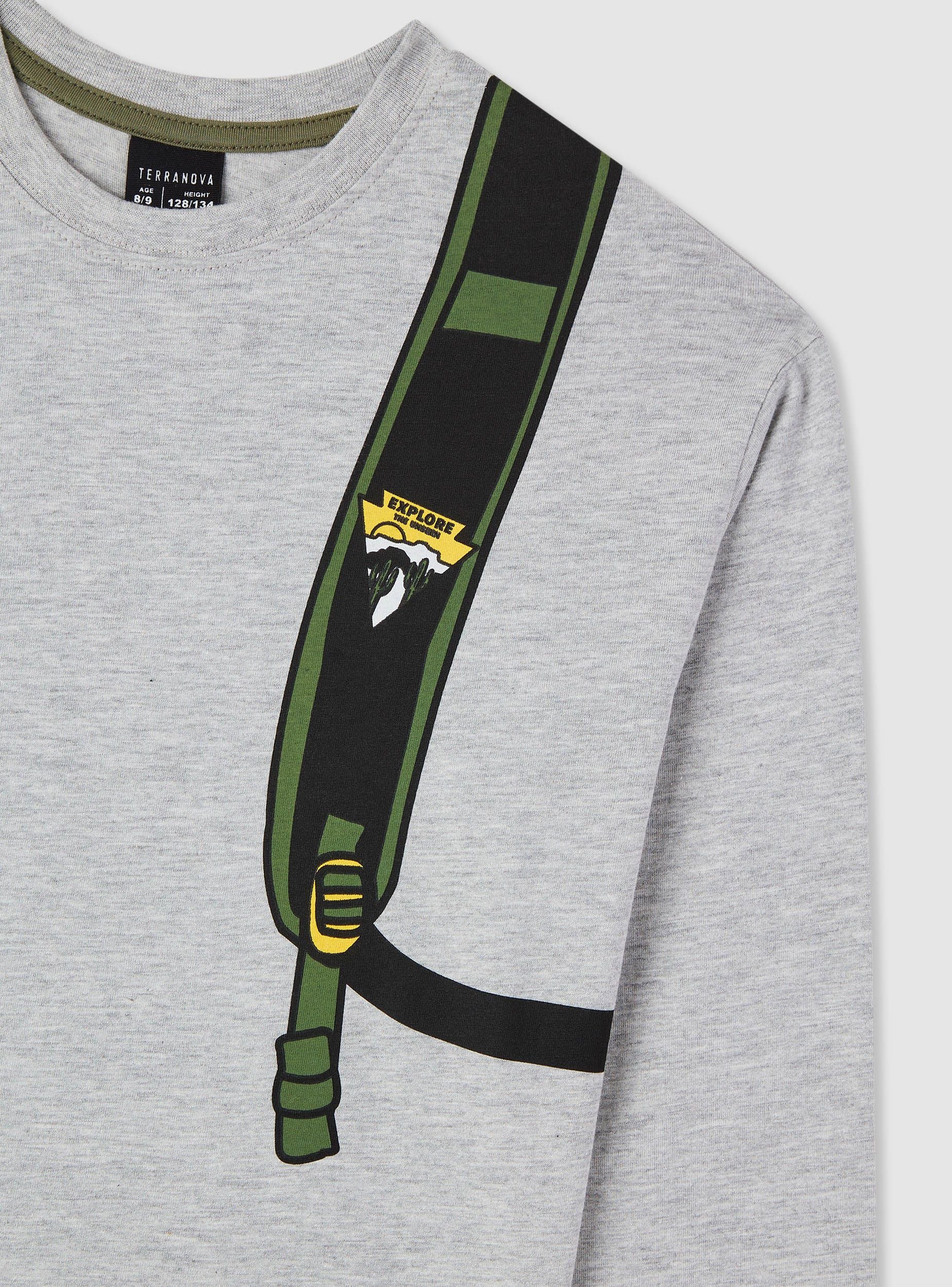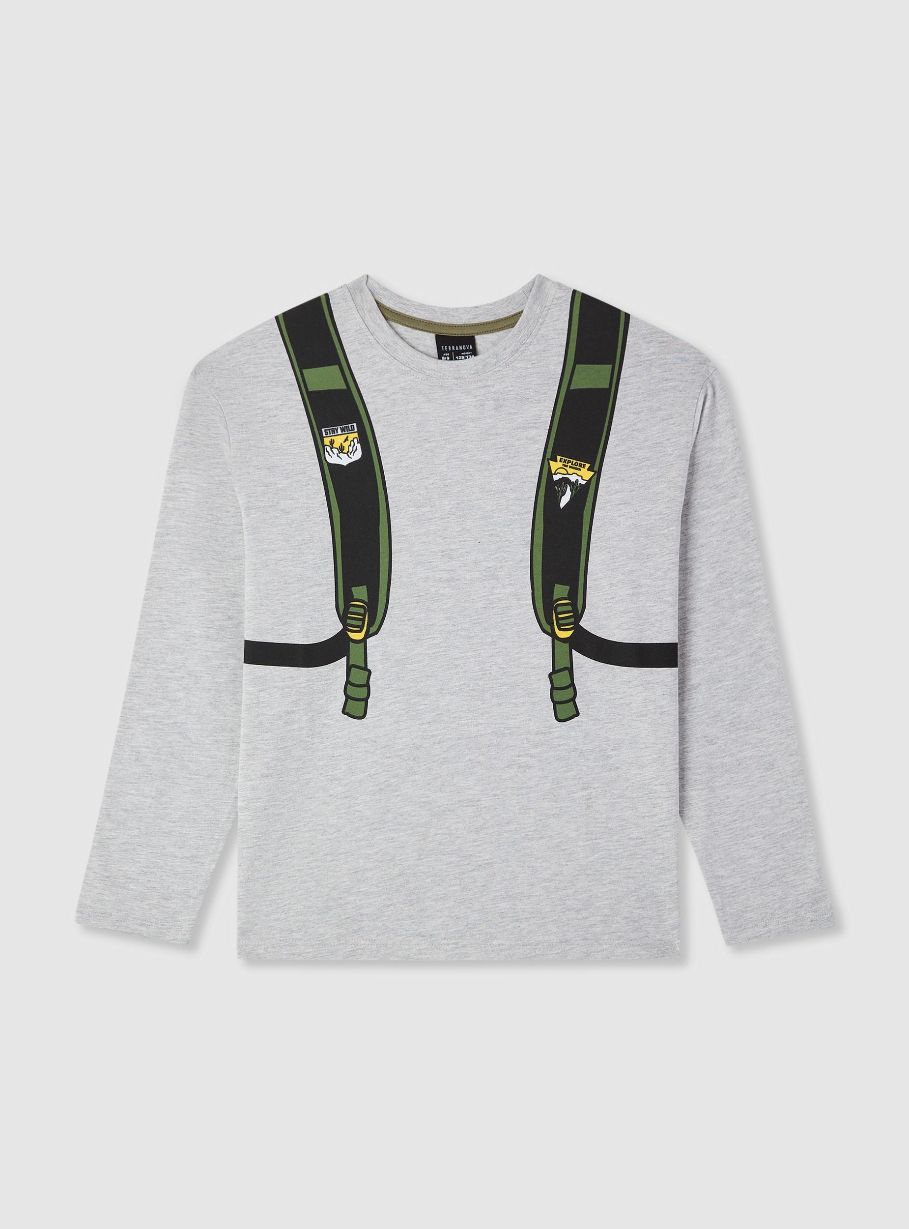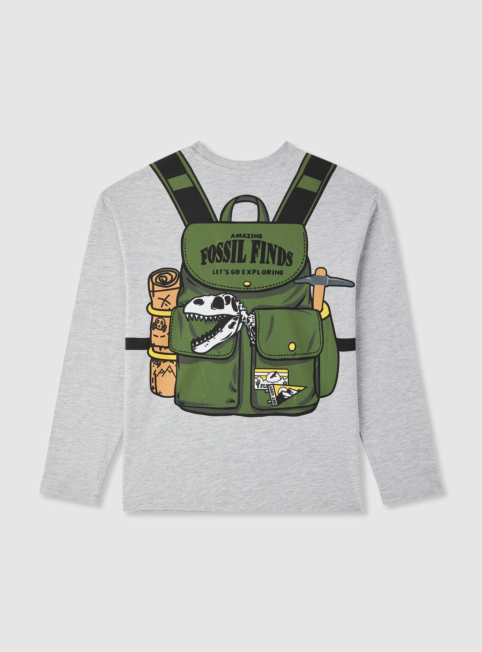 Dětské tričko s dlouhými rukávy, kulatým výstřihem a výrazným potiskem zobrazujícím batoh. Ideální pro ležérní a zábavný vzhled, toto tričko se skvěle hodí k džínům nebo sportovním kalhotám. Jedinečný design ho činí perfektním na školní dny nebo volný čas, poskytuje pohodlí a styl. Rovný střih zajišťuje volnost pohybu.Detaily