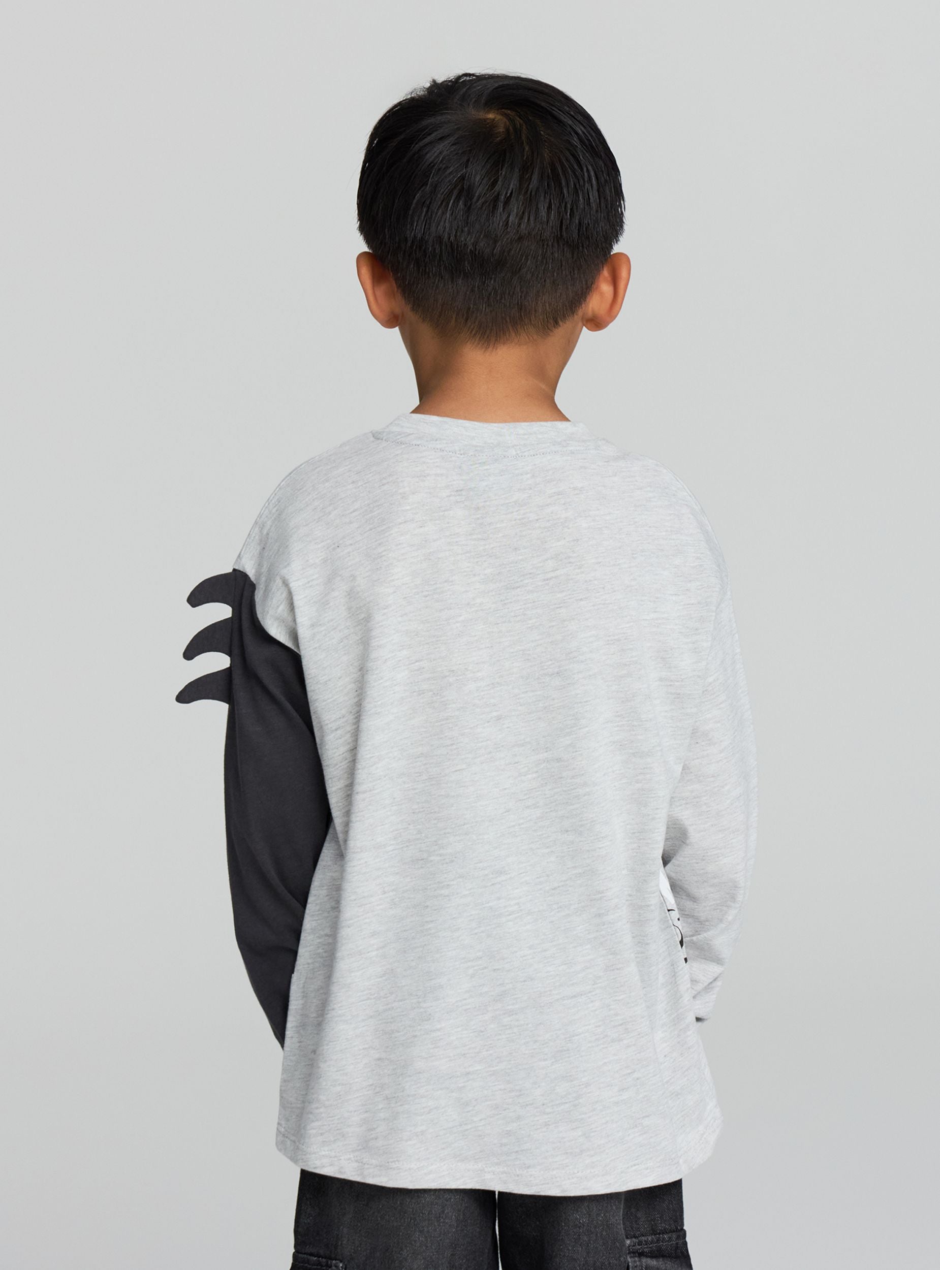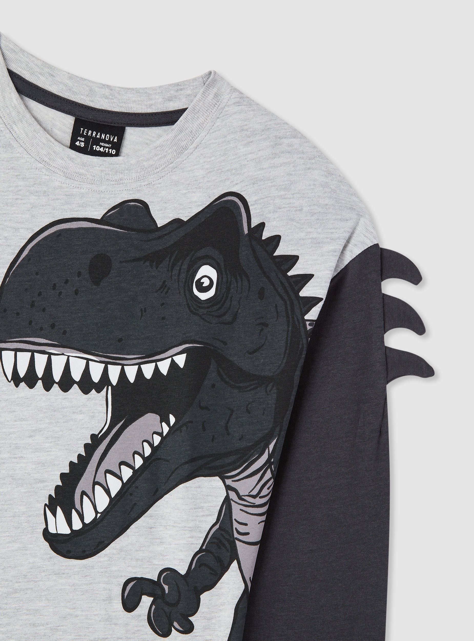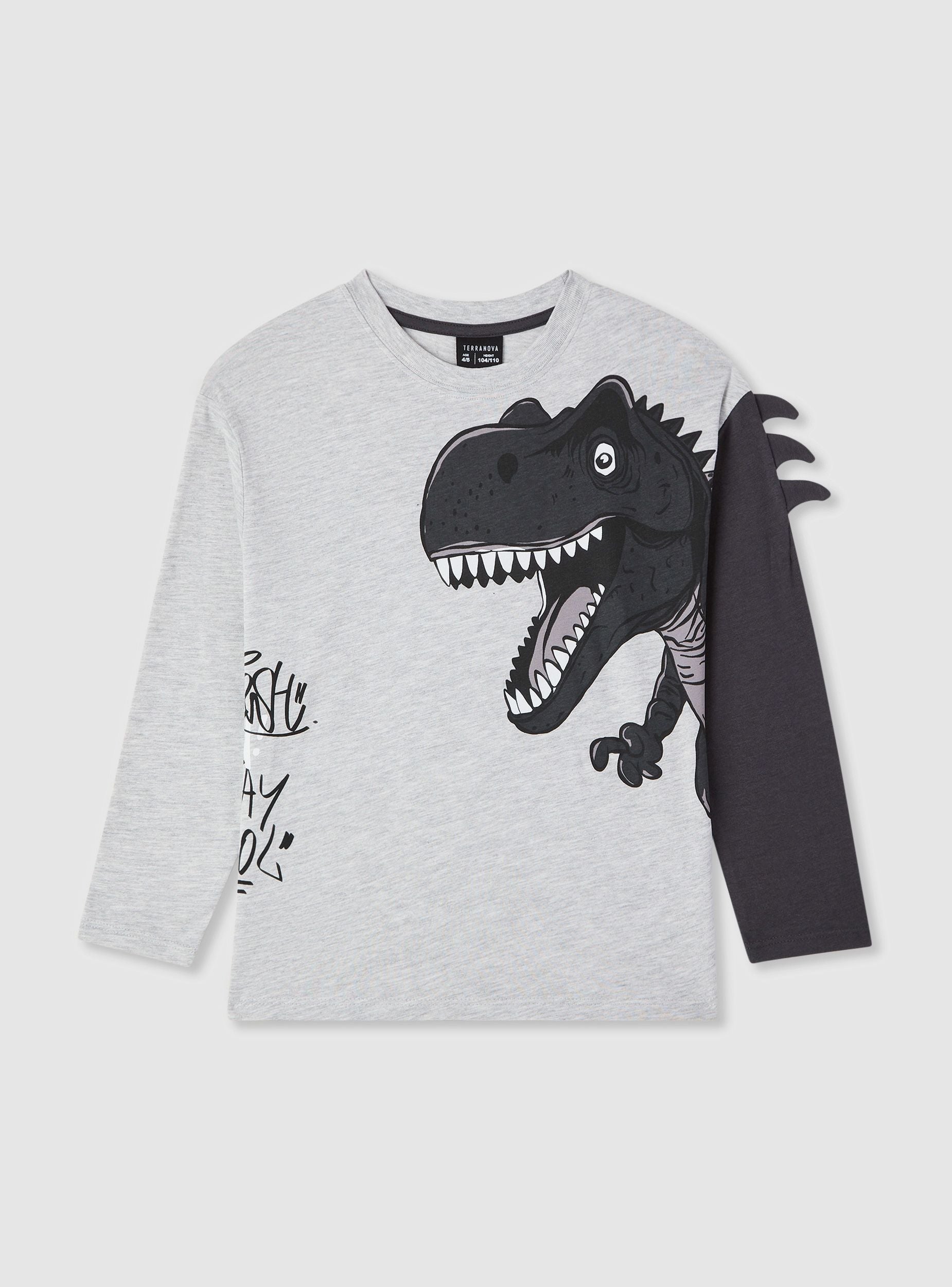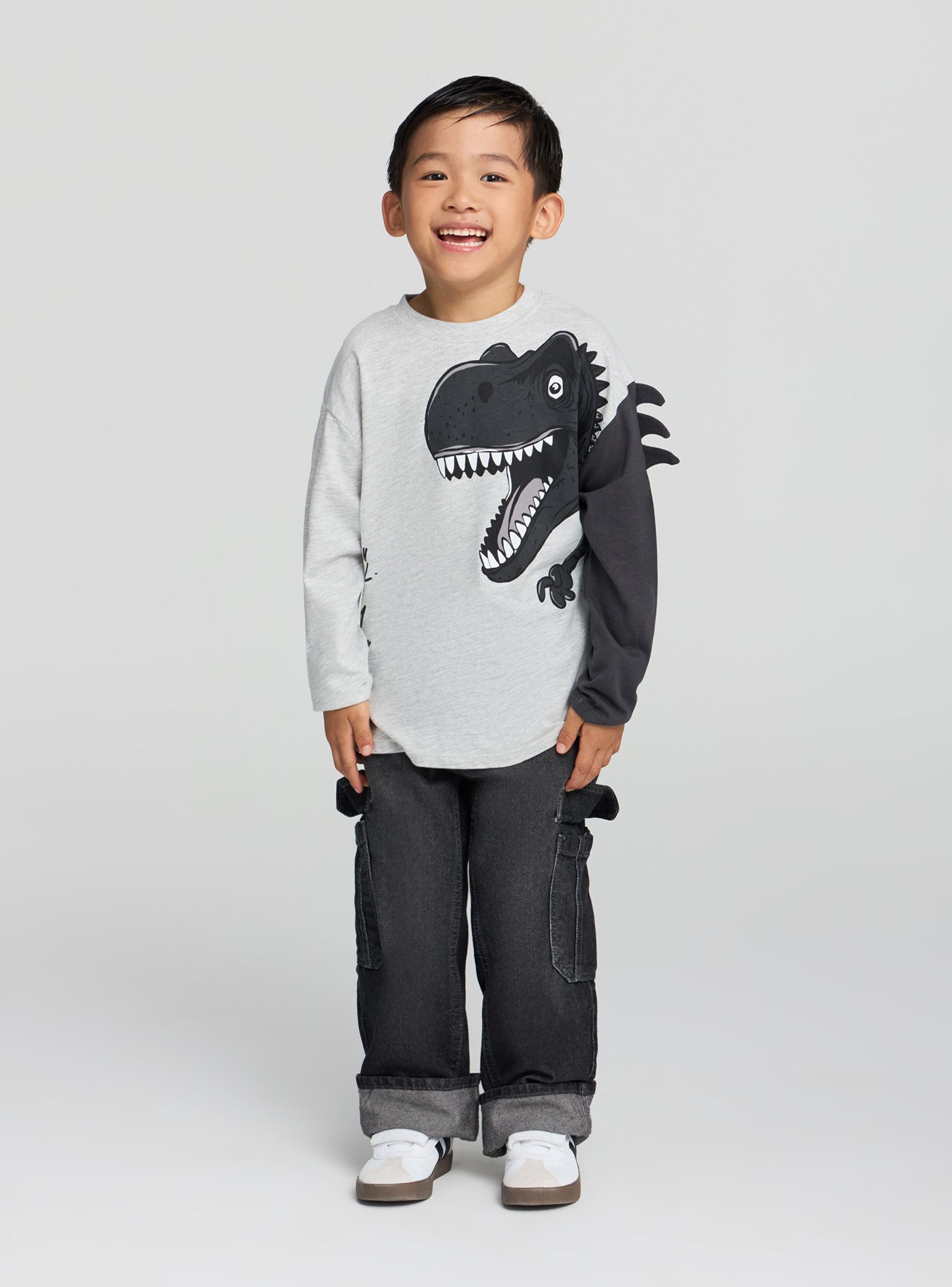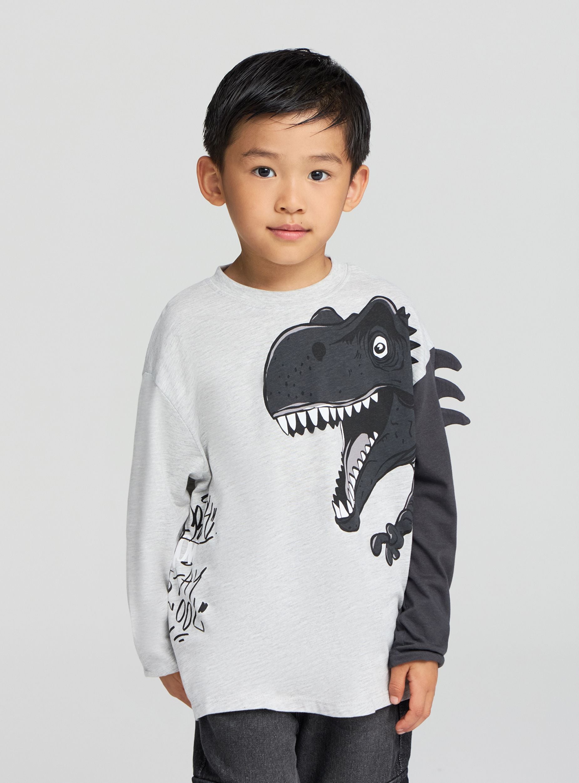 Dětské dlouhámanžestové tričko s výraznou grafikou, ideální pro malé průzkumníky. Hlavním motivem designu je velký dinosaurus vytištěný na přední straně, který se rozšiřuje až na rukáv a vytváří hravý a originální trojrozměrný efekt. Detaily s přidanými hřebeny na rameni dodávají překvapivý akcent, který podněcuje představivost. Pohodlný střih a kulatý výstřih z něj činí ideální volbu pro každodenní nošení, od školy po volný čas. Perfektní v kombinaci s džínami, tepláky nebo cargo kalhotami pro dynamický a zábavný vzhled.Detaily