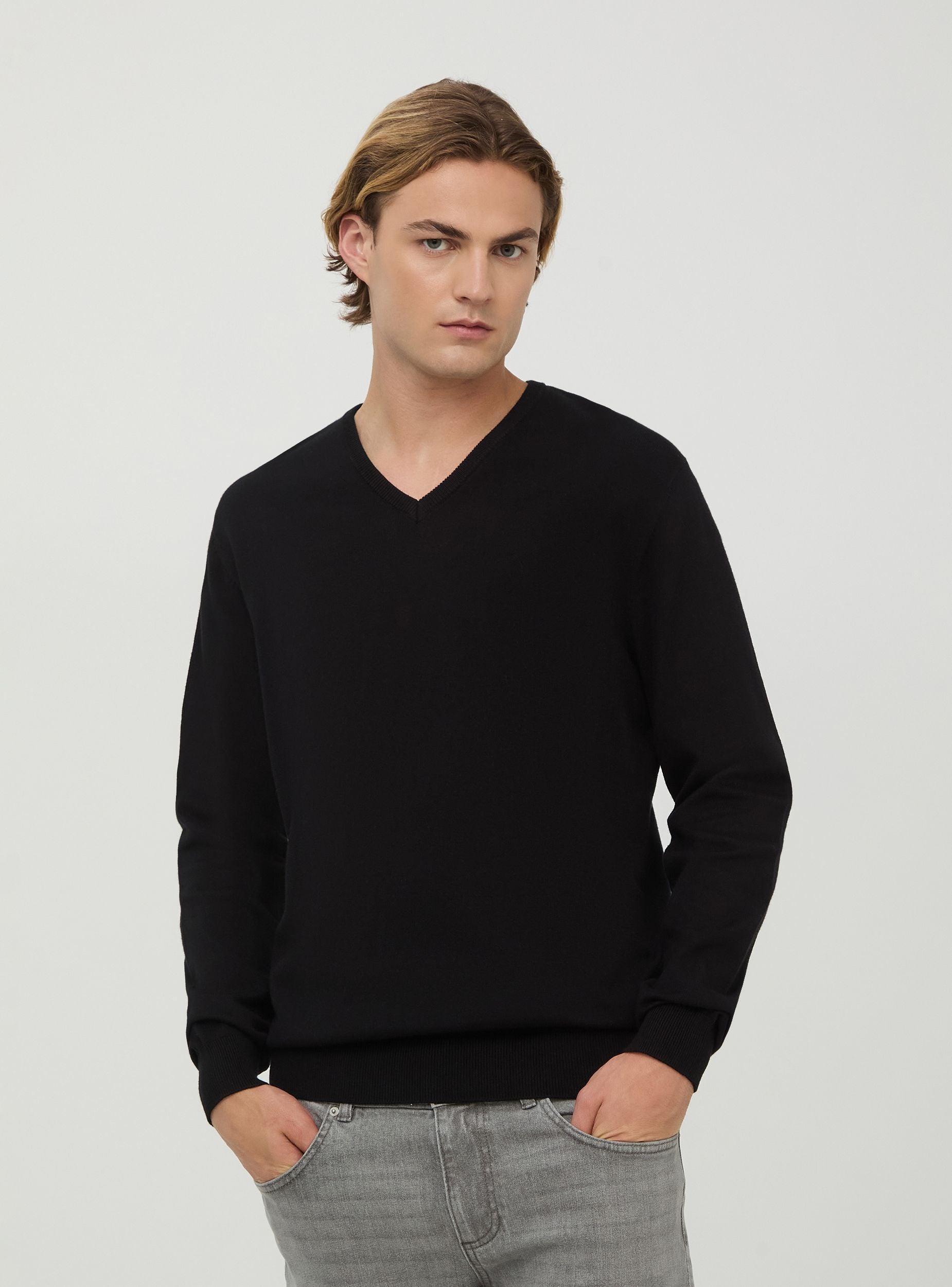 Pánský jednobarevný svetr s decentním výstřihem do V, který dodává elegantní a univerzální vzhled. Dlouhé rukávy a žebrované manžety zajišťují dokonalé přilnutí, zatímco regular fit činí kus vhodným pro neformální i formální příležitosti.Detaily