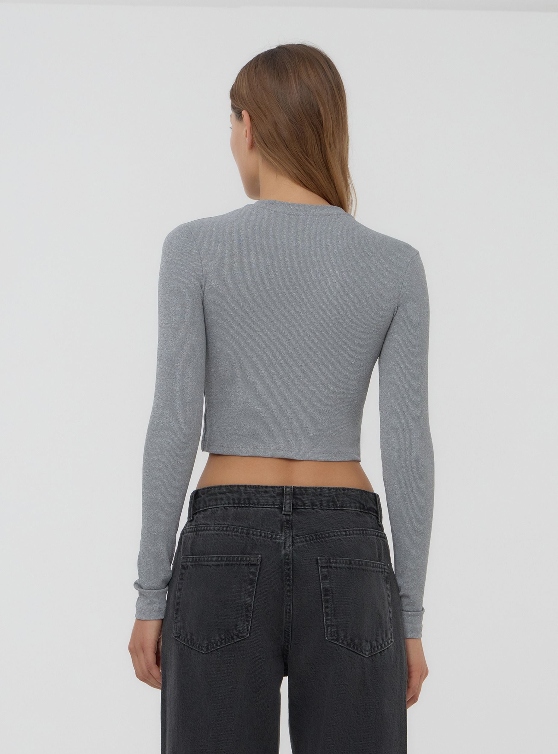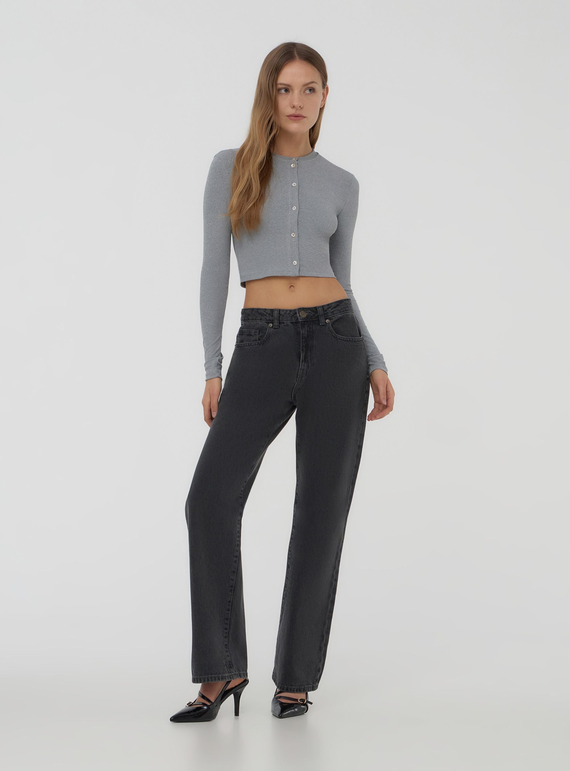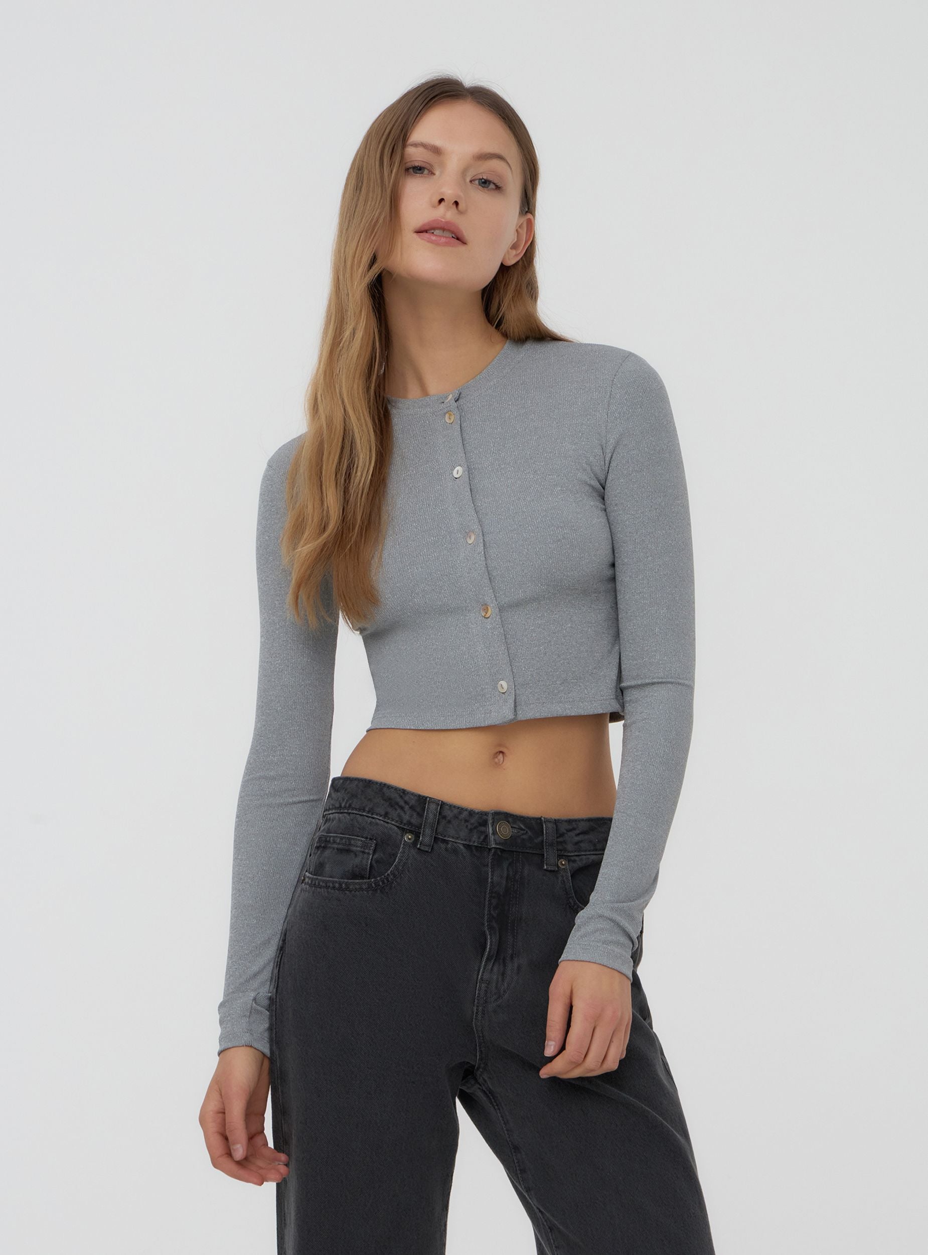 Dámský dlouhý rukáv cropped cardigan s žebrovanou texturou, která zvýrazňuje siluetu. Přední knoflíky dodávají elegantní a praktický dotek, ideální pro přidání versatility do vašeho stylu. Perfektní pro vytváření moderních a módních outfitů.