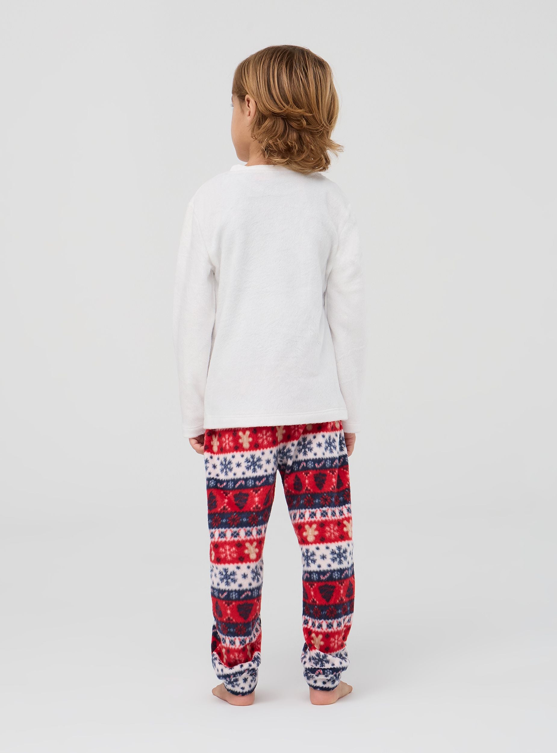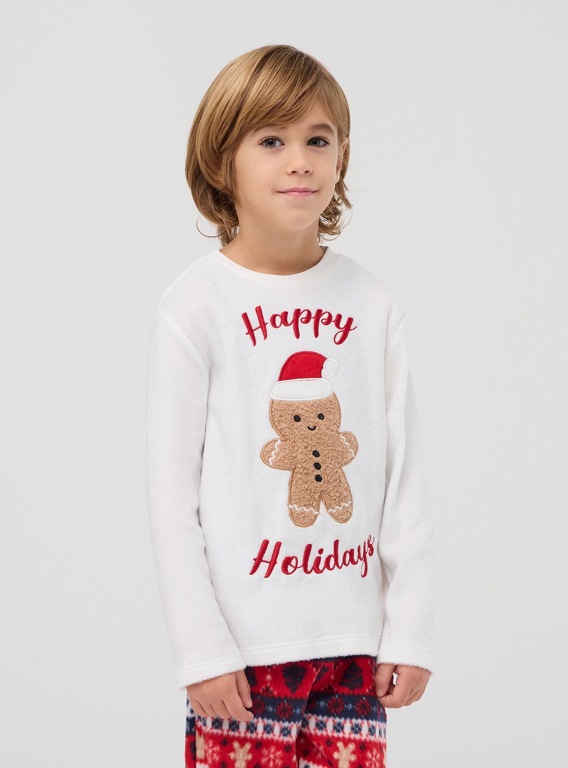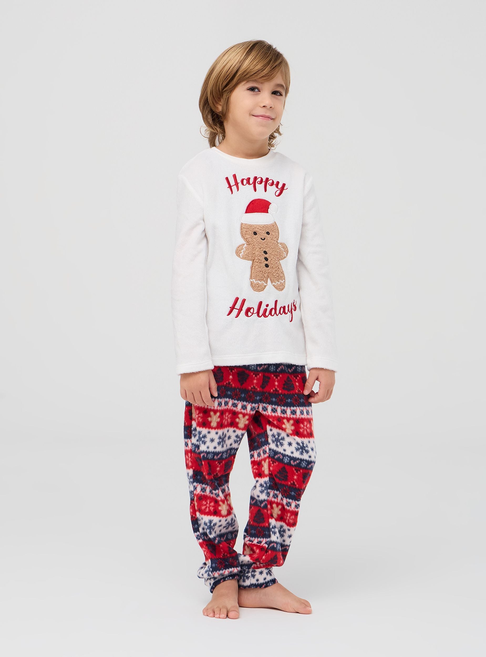 Tento dětský pyžamo se skládá z dlouhého rukávu a dlouhých kalhot, ideálních pro chladné zimní noci. Tričko má sváteční potisk s roztomilým perníkovým mužem z sherpy se třpytivým srdíčkem, obohacené o čepičku Santa Clause a nápis "Šťastné svátky". Kalhoty, které jsou také zdobeny vánočními motivy po celém povrchu, dokonale doplňují sváteční vzhled. Oba kusy jsou vyrobeny z měkkého a teplého materiálu, který zaručuje pohodlí a útulnost během spánku. Perfektní pro přidání nádechu radosti a vánočního ducha do nočního šatníku.Detaily