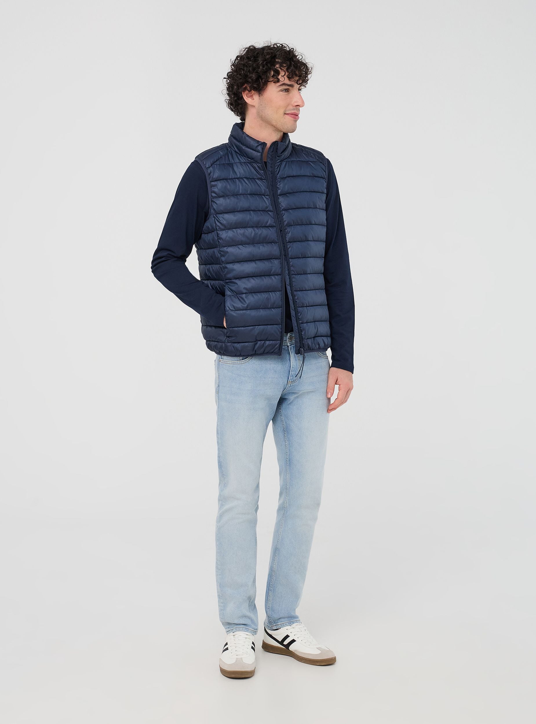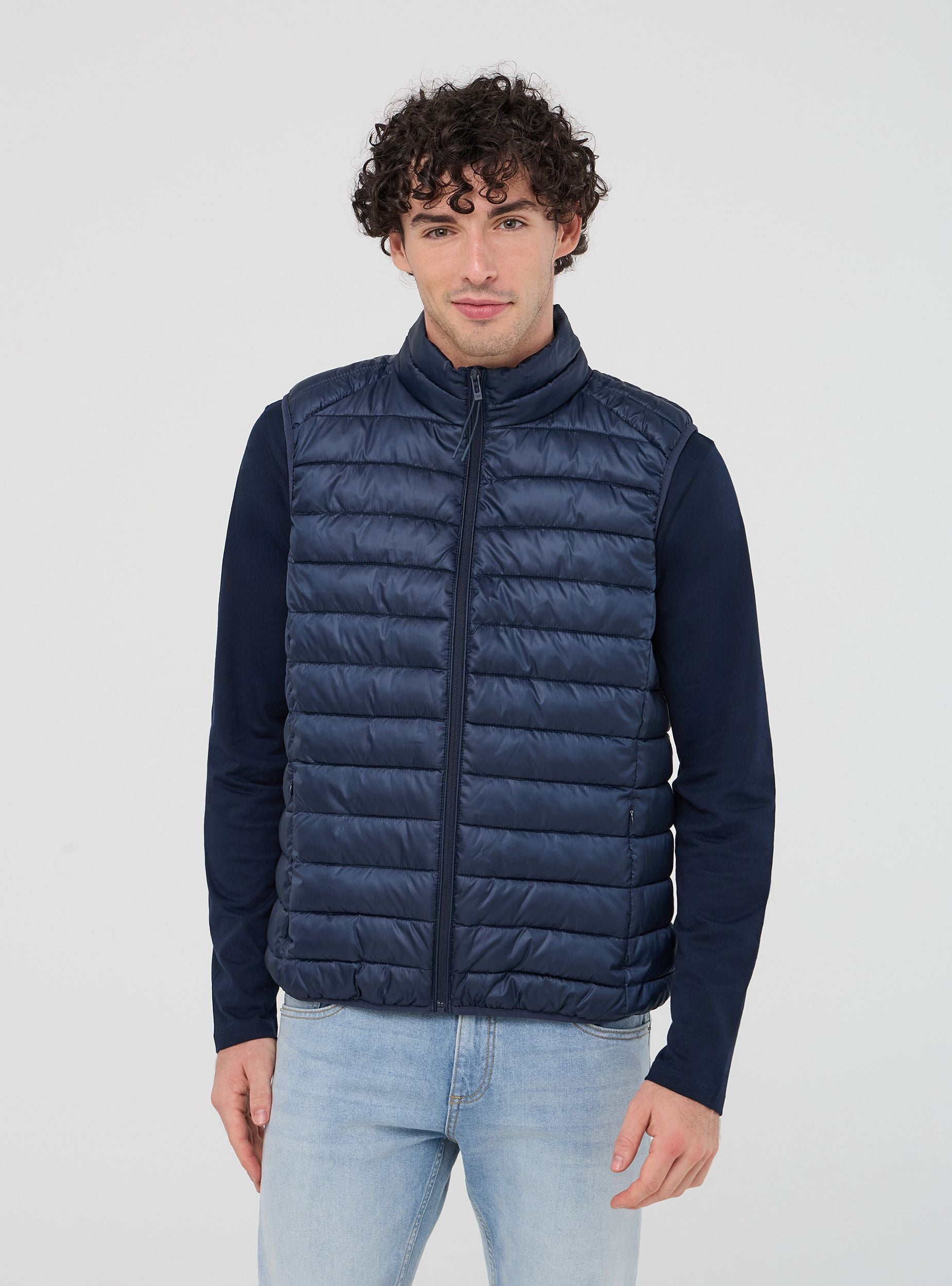 Pánská jednobarevná bezrukávová bunda s lehkým zateplením, ideální na přechodná období. Model bezrukávového vesty s vysokým límcem a předním zipem. S praktickými bočními kapsami je tento kousek ideální pro neformální a funkční vzhled. Díky své lehkosti je vhodný na venkovní aktivity, jako jsou túry nebo procházky po městě, aniž by omezoval volnost pohybu. Snadno se kombinuje s mikinami, svetry nebo tričky a je perfektní na jaro a podzim. Univerzální kousek do šatníku každého muže.Detaily