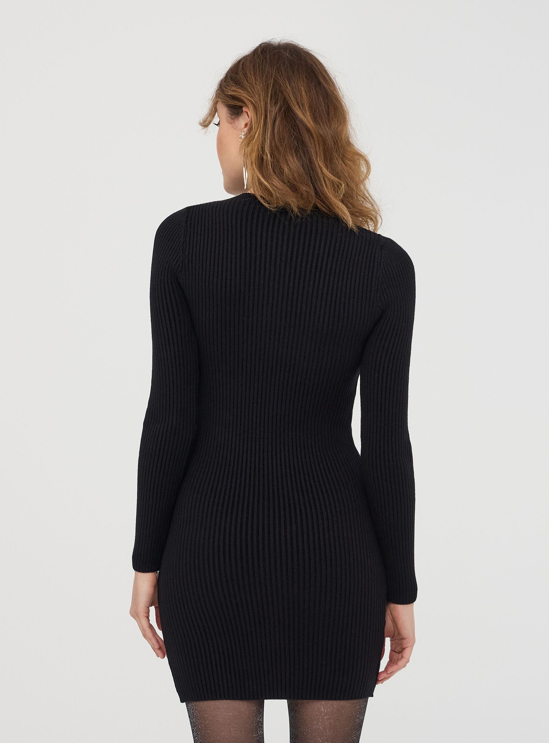 Kleid für Damen im minimalistischen und eleganten Stil, aus einfarbiger Strickware gefertigt, die ein umhüllendes und komfortables Gefühl vermittelt. Dieses lange Etuikleid mit enganliegenden Ärmeln folgt den Linien des Körpers und betont sie dezent. Das Besondere ist der kleine Schlitz vorne, der dem Design einen Hauch von Weiblichkeit und Bewegung verleiht. Perfekt, um raffinierte und vielseitige Looks zu kreieren, passt es sowohl zu einem lässigen Outfit mit einfachen Accessoires als auch zu einer eleganteren Kombination für den Abend. Ein essentielles Teil für eine zeitgenössische Garderobe.Details