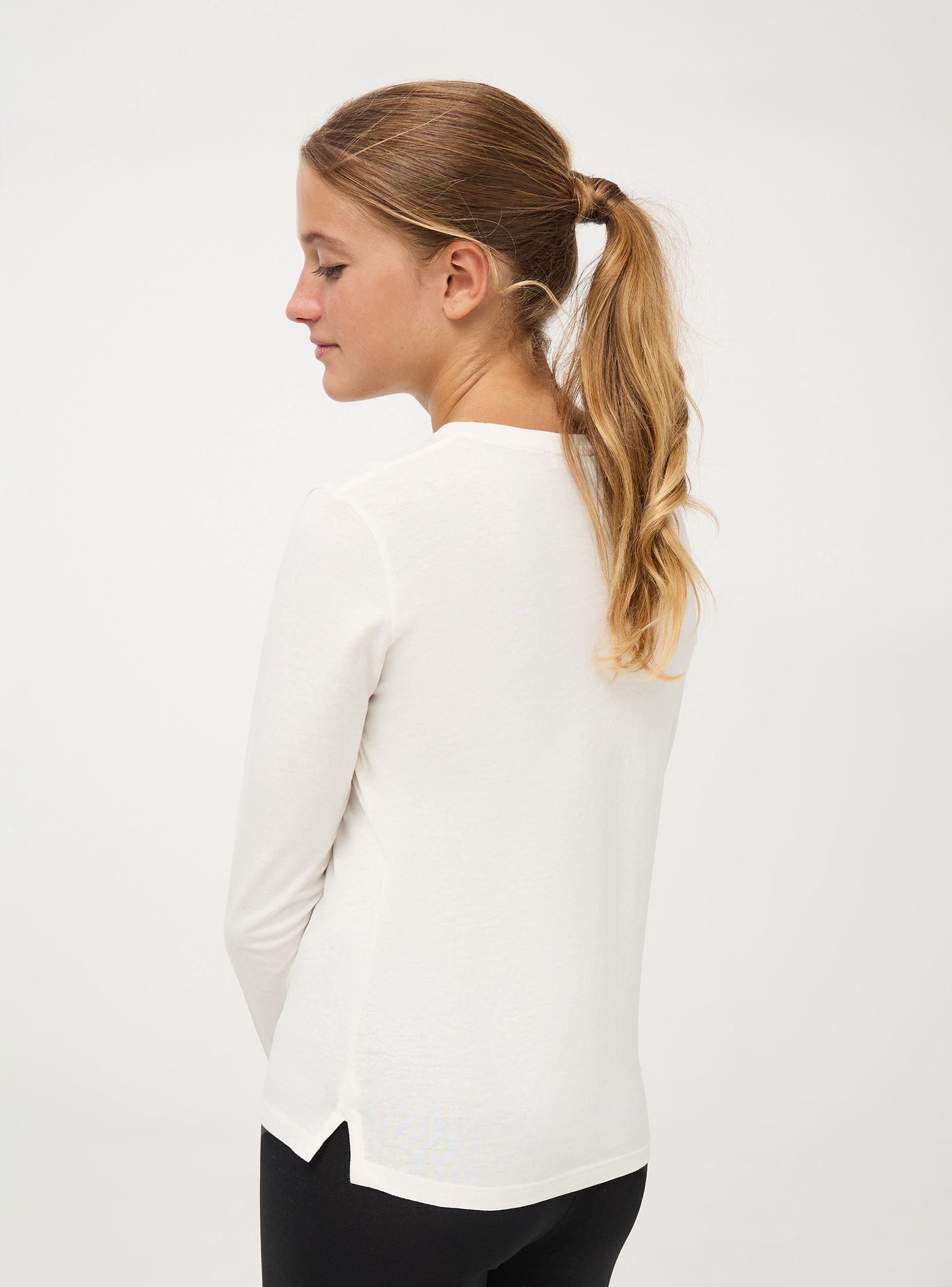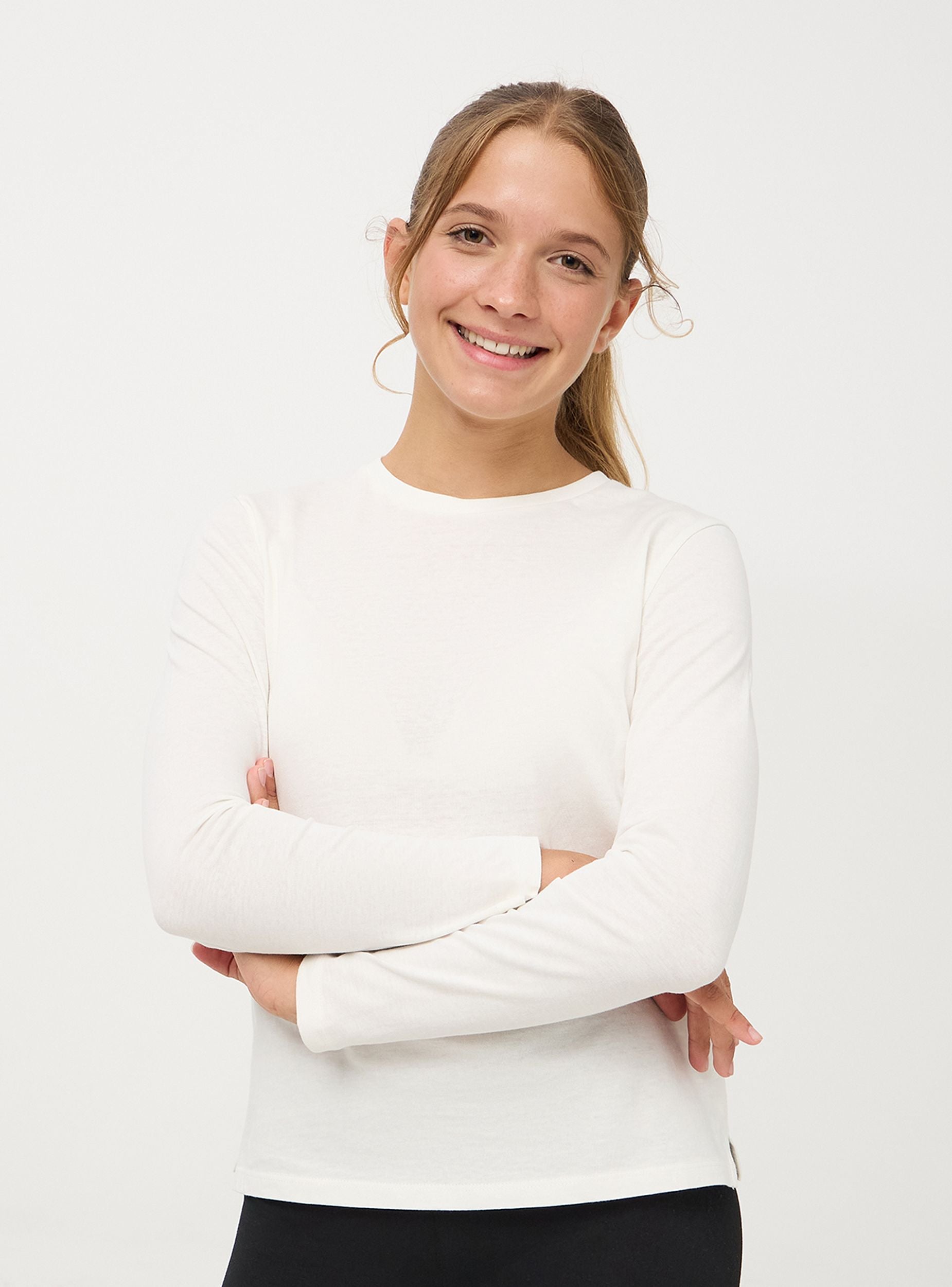 Verpackung mit 3 Langarm-T-Shirts für Mädchen mit Rundhalsausschnitt, aus einfarbigem Baumwollstoff. Unentbehrliche Casual-Teile, die man im Kleiderschrank haben sollte, leicht mit jedem Outfit zu kombinieren. Reguläre Passform.Details