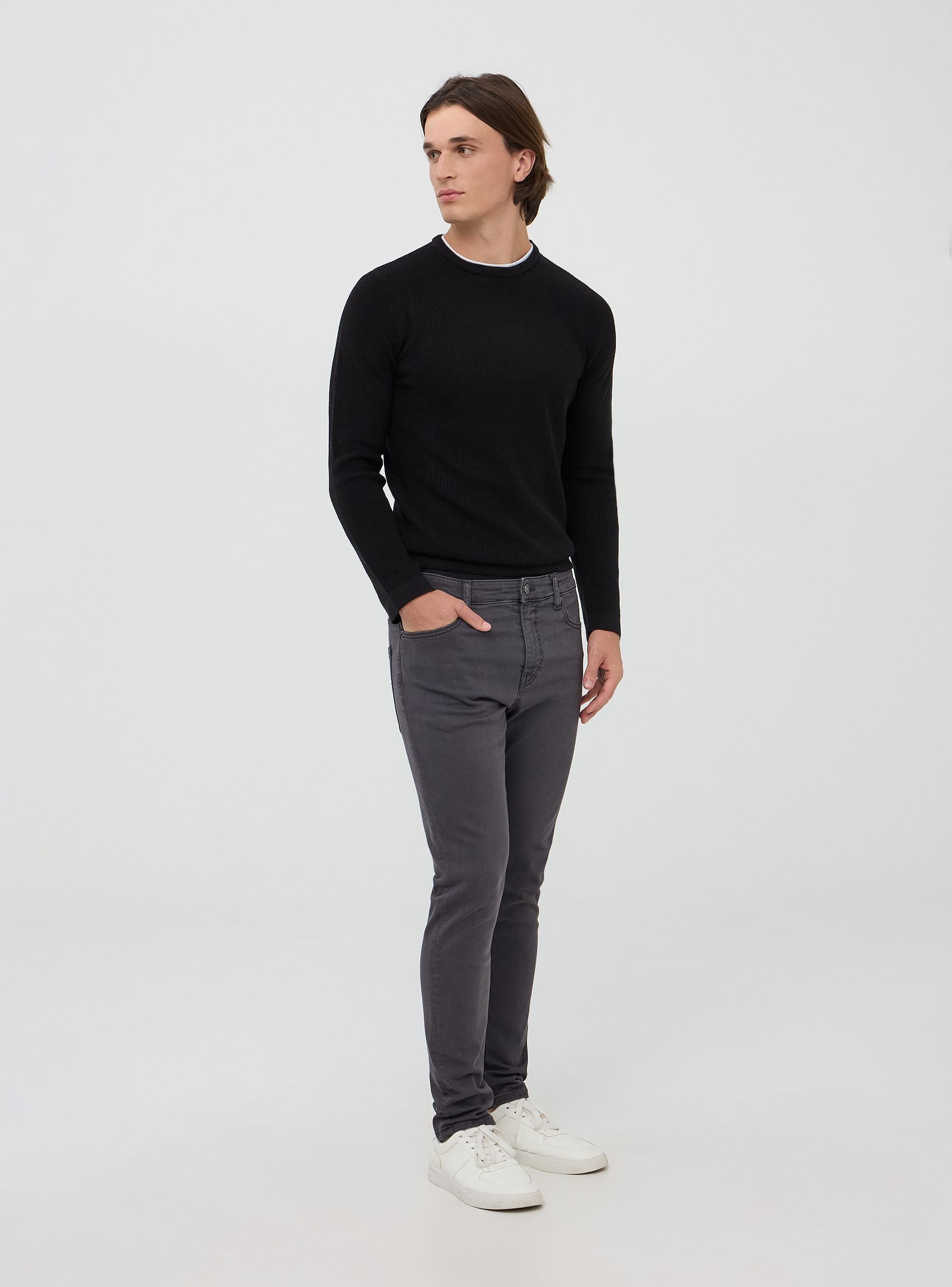 Herrenhose, 5-Taschen-Modell, mit Knopf- und Reißverschluss, Gürtelschlaufen. Einfarbiger, elastischer Stoff. Enganliegende Passform.