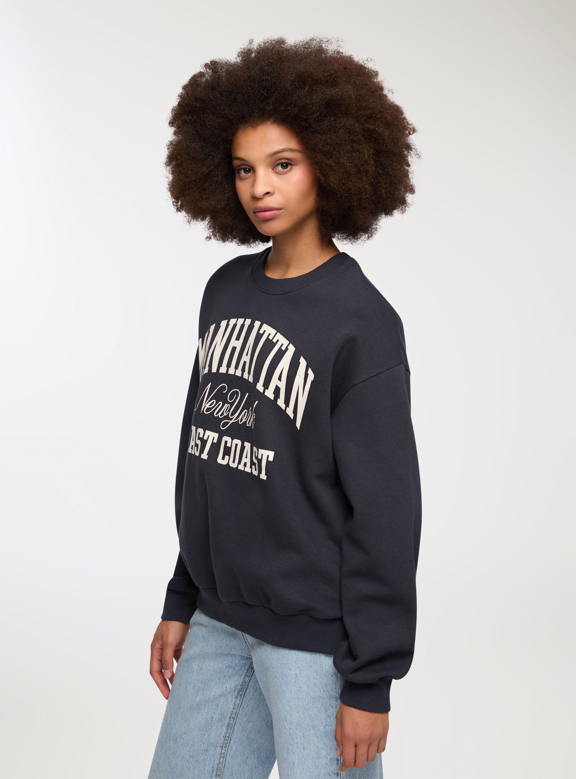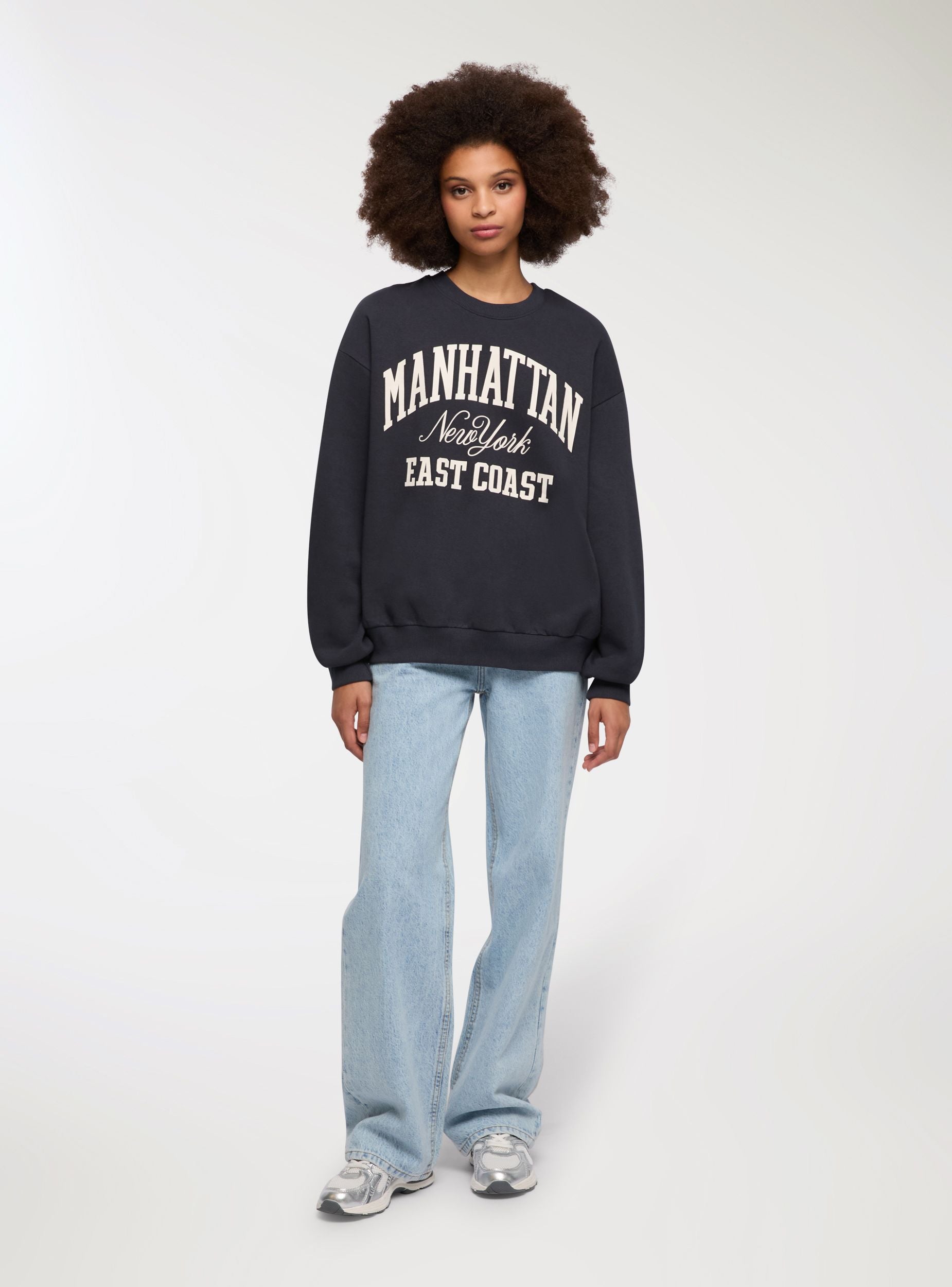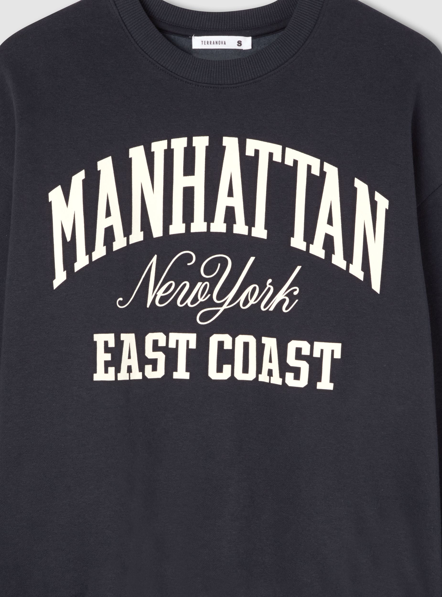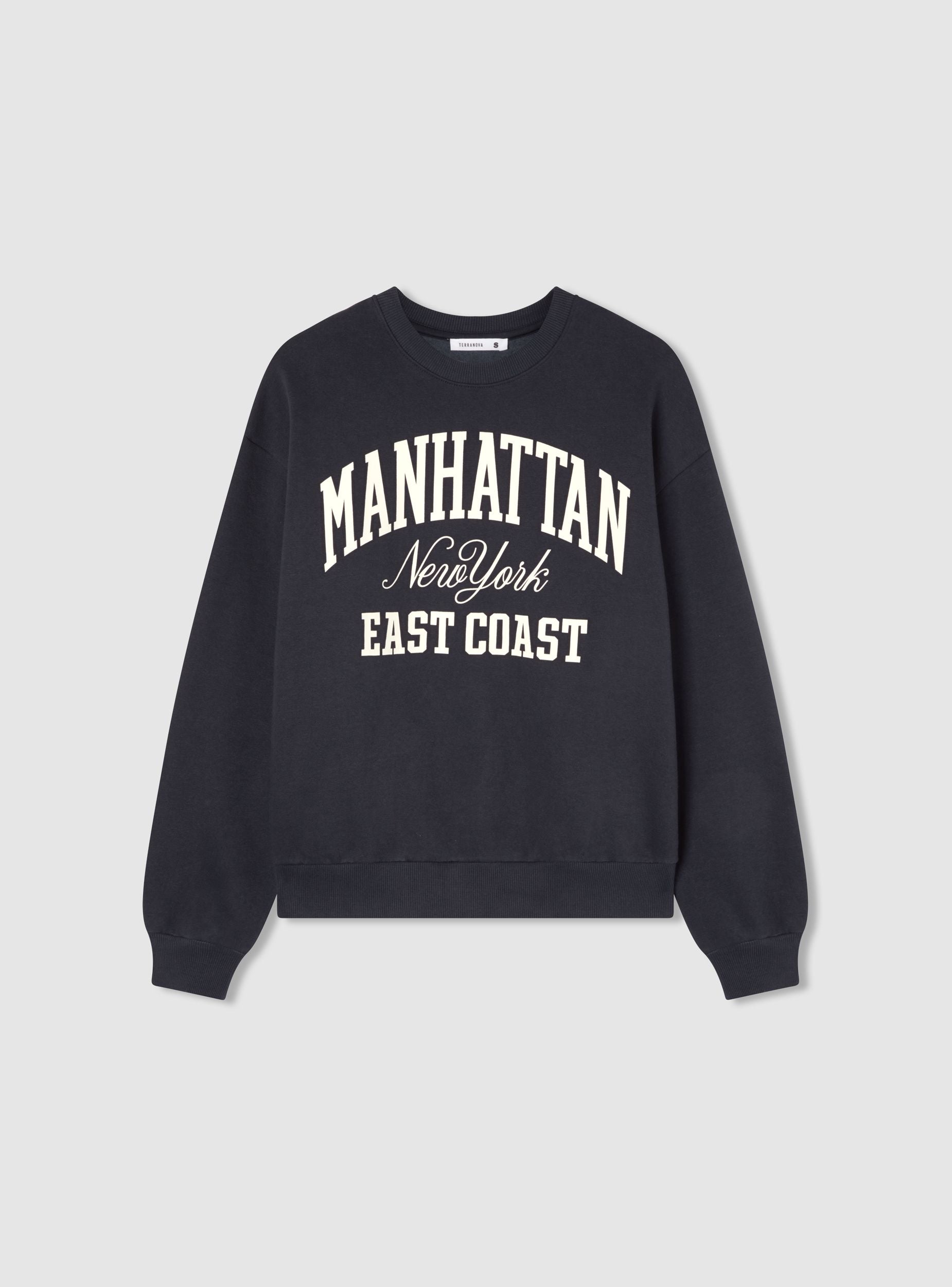 Dicke Damen-Fleecejacke mit College-Druck „Manhattan New York East Coast“. Das design mit Rundhalsausschnitt, ohne Kapuze und ohne Reißverschluss, mit gerippten Bündchen und Saum sorgt für einen bequemen und umschmeichelnden Sitz, ideal um den Winter stilvoll zu meistern. Hergestellt aus Fleece-Stoff, ist sie perfekt für einen lässigen und sportlichen Look. Kombinierbar mit Jeans, weiten Hosen oder Leggings, um urbanen Outfits mit einem markanten Charakter und amerikanischer Inspiration zu kreieren.Details