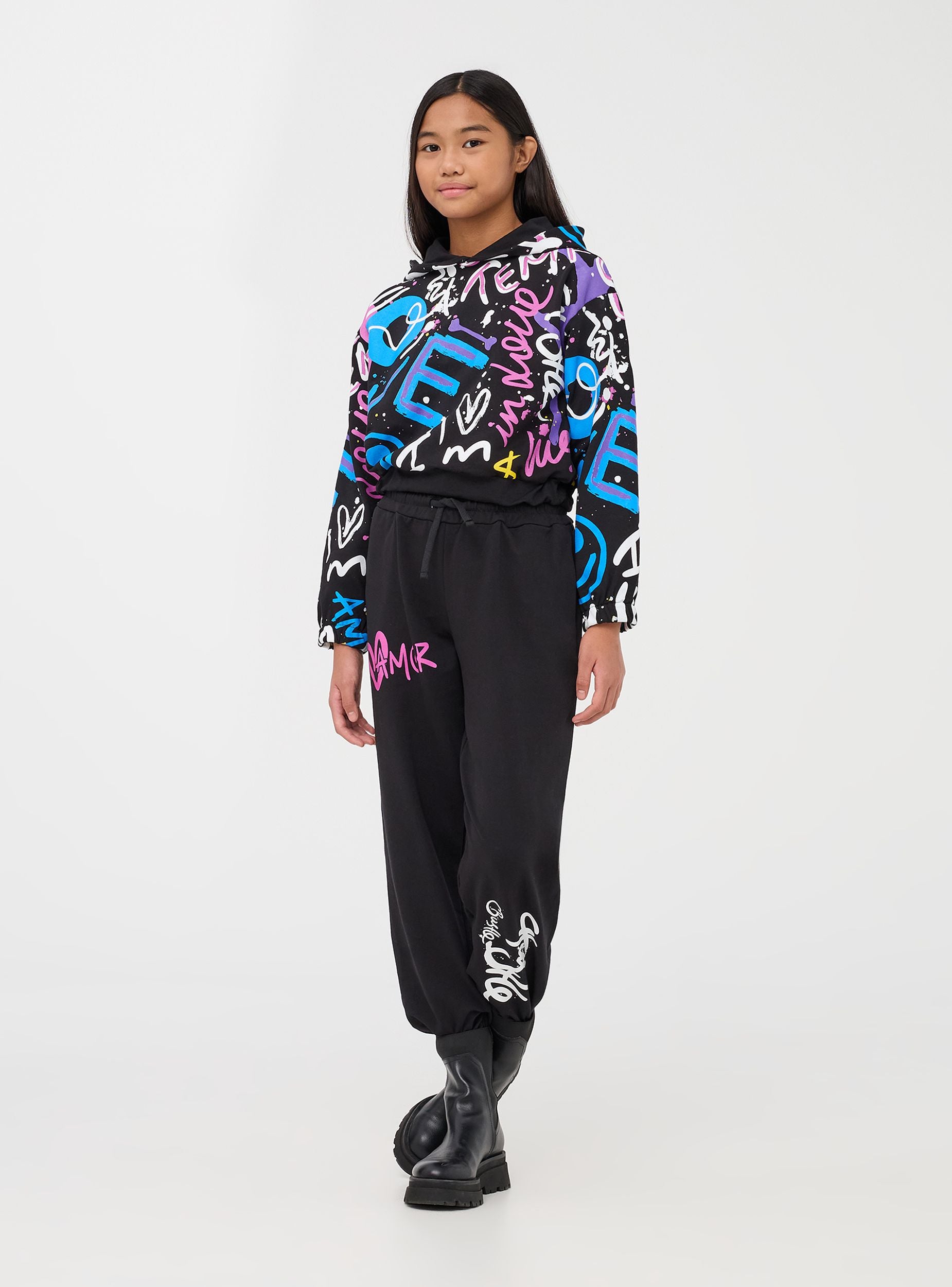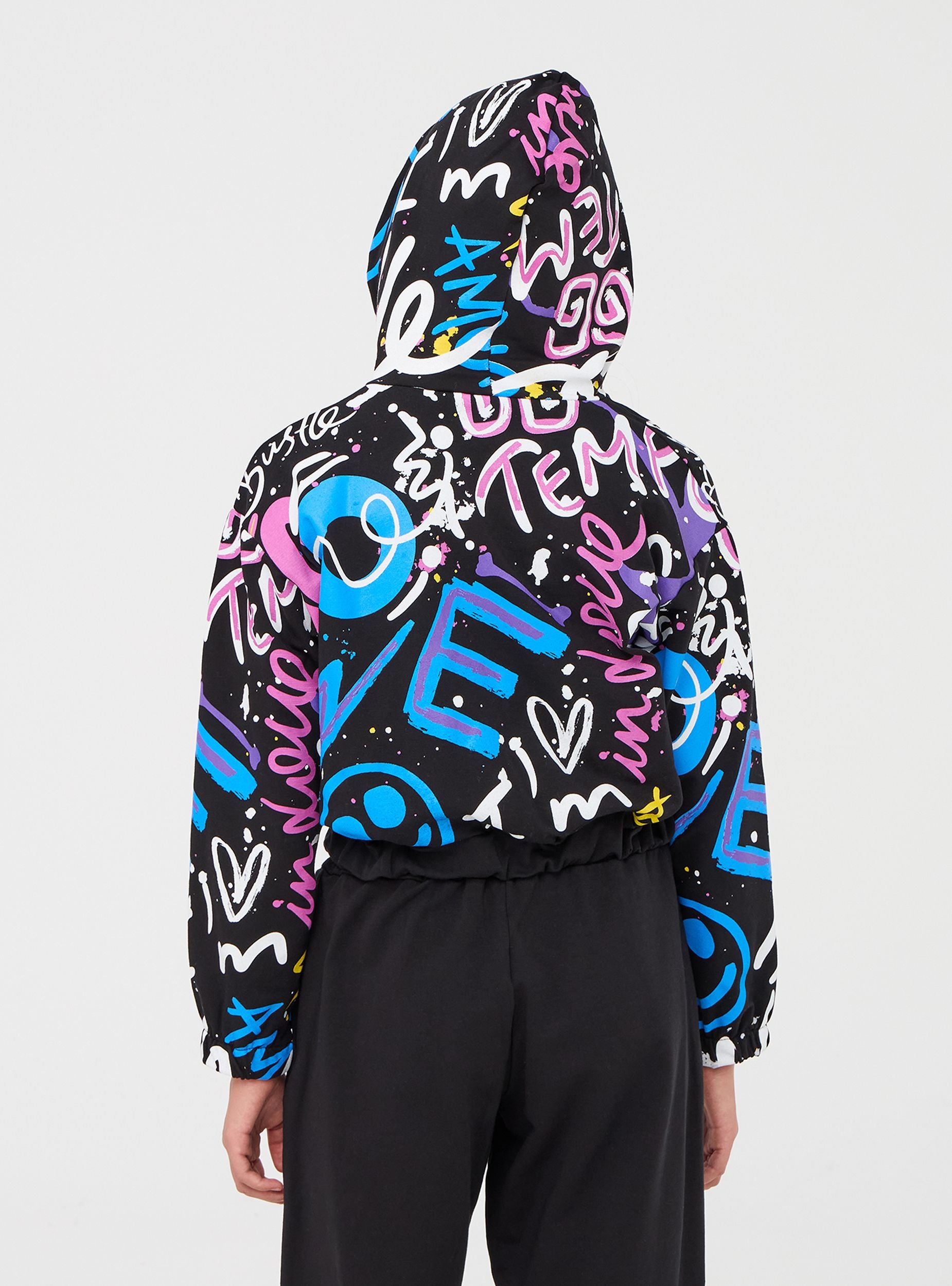 Mädchen Sweatshirt mit Kapuze, gekennzeichnet durch einen kurzen Schnitt und einen lebhaften Allover-Druck mit Graffiti-Motiven, die Schriftzüge, Symbole und künstlerische Skizzen enthalten. Es ist ein ideales Kleidungsstück für diejenigen, die einen urbanen und kreativen Look wünschen, perfekt, um einen Hauch von unverwechselbarem Stil zur Alltagskleidung hinzuzufügen.Details