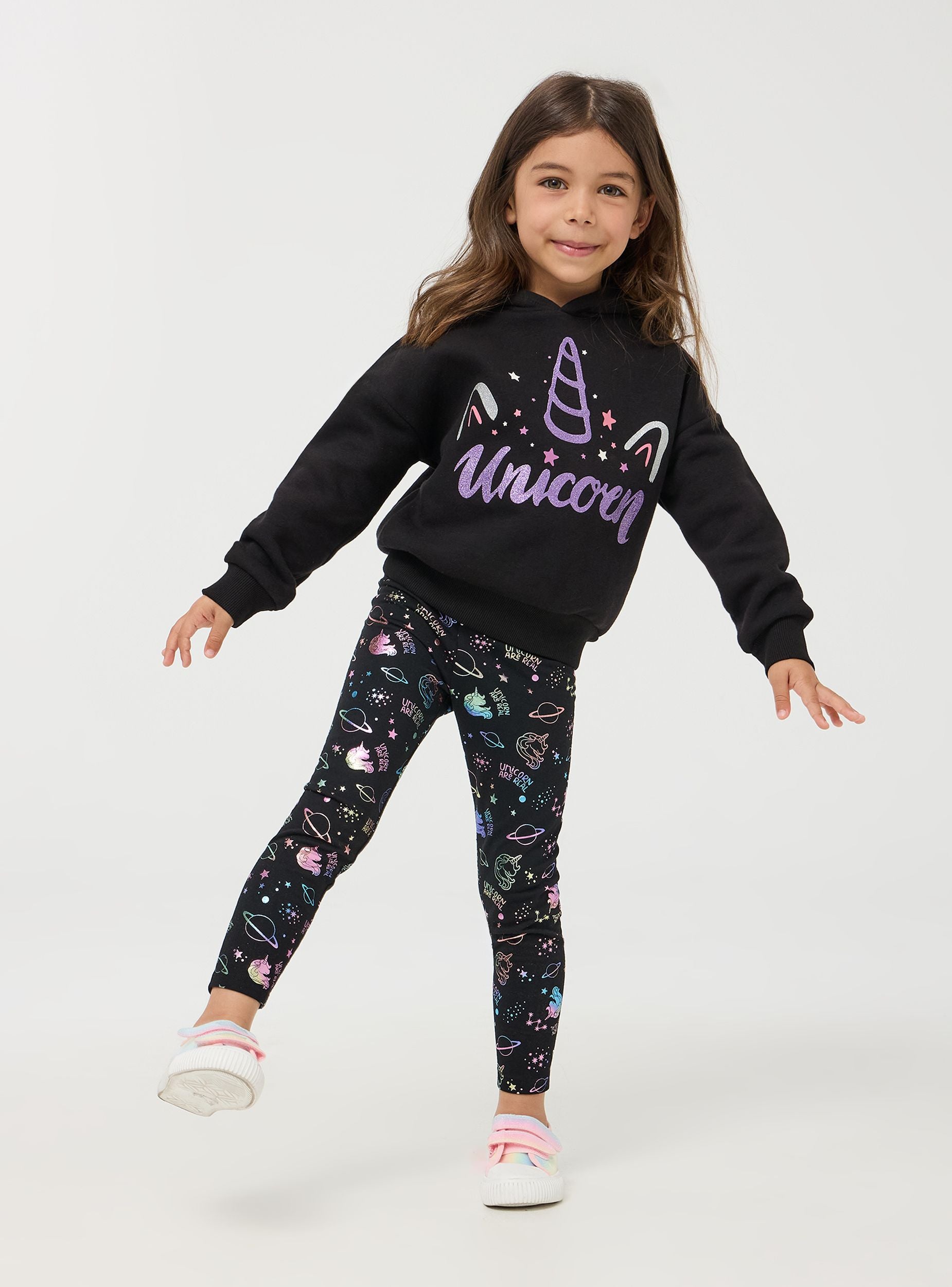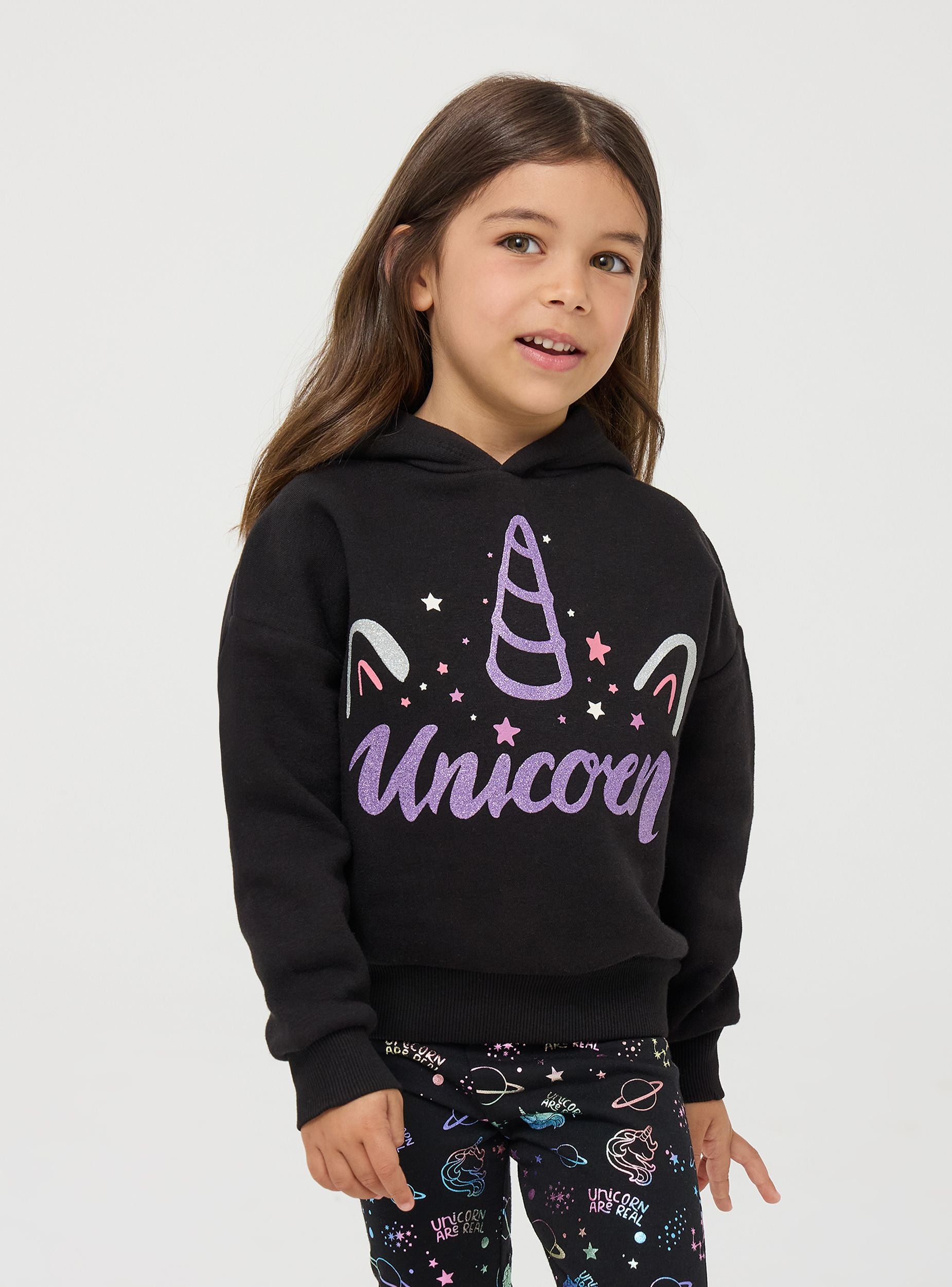 Mädchen-Hoodie aus schwerem Stoff, gekennzeichnet durch einen glitzernden Druck eines Horns und den Ohren eines Einhorns sowie dem Schriftzug "Unicorn". Die Details des Drucks umfassen Sternchen und Herzchen, die dem Design einen magischen Touch verleihen. Der Hoodie hat elastische Bündchen und einen elastischen Saum für eine bequeme Passform. Perfekt, um an kälteren Tagen warm zu bleiben, kombiniert dieser Hoodie Stil und Funktionalität und macht ihn ideal für jeden lässigen Anlass.
