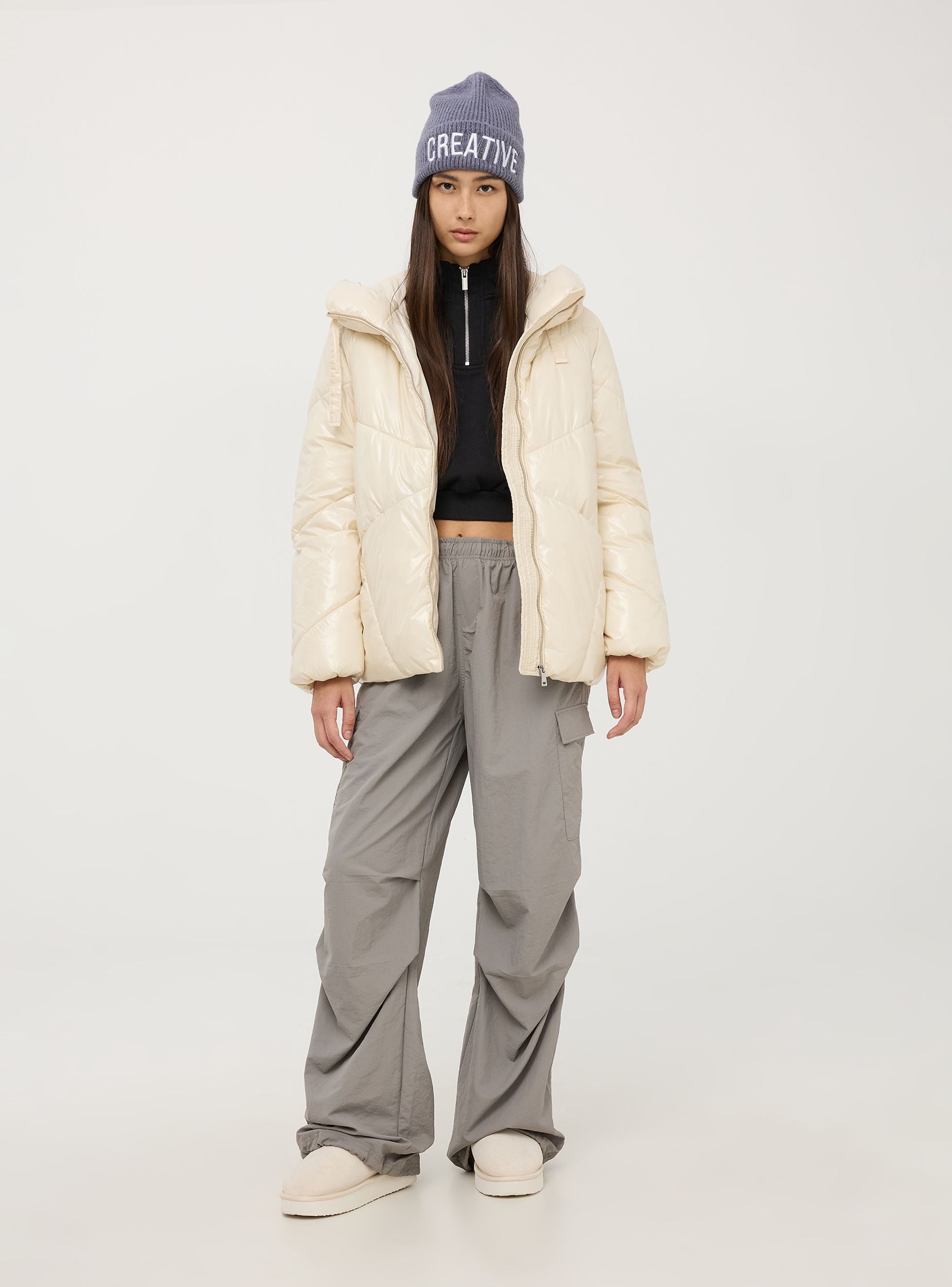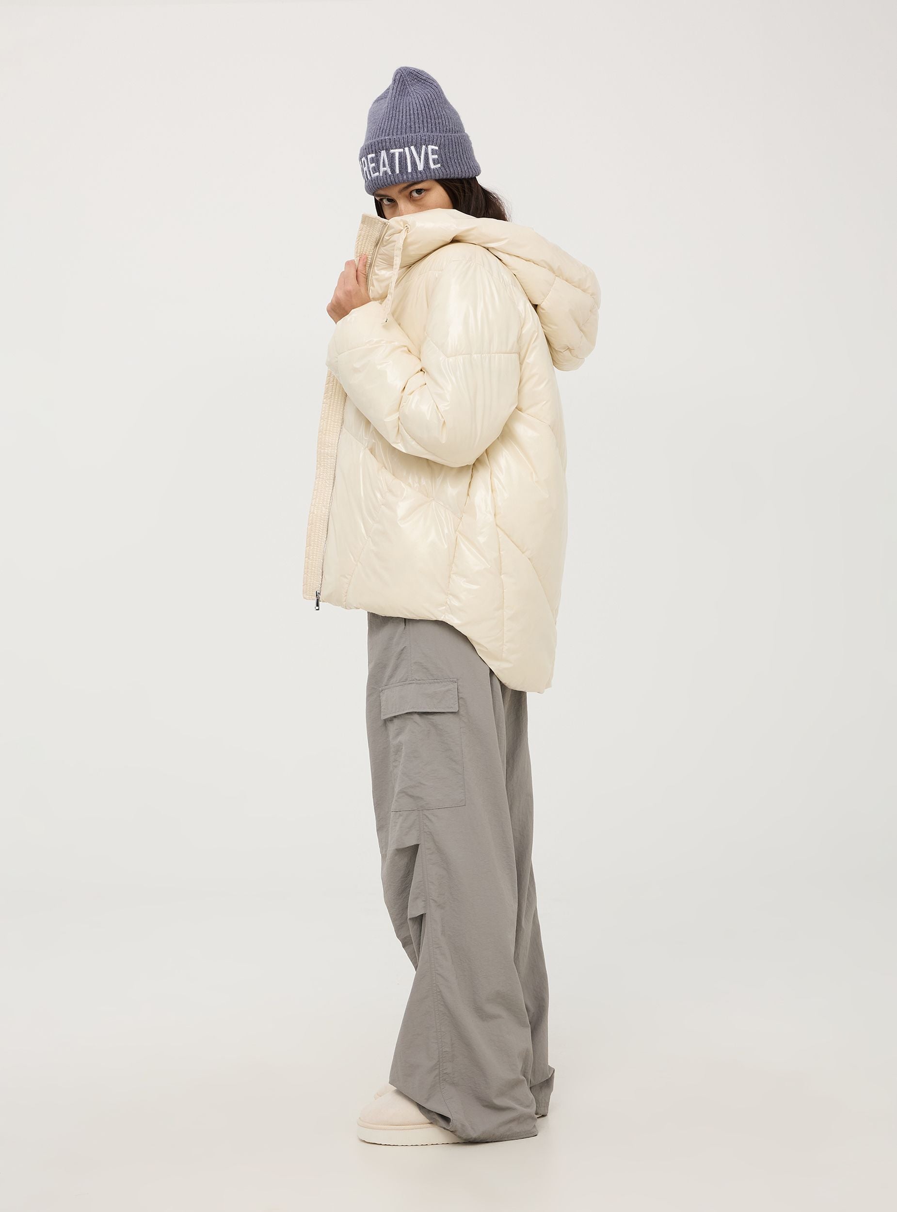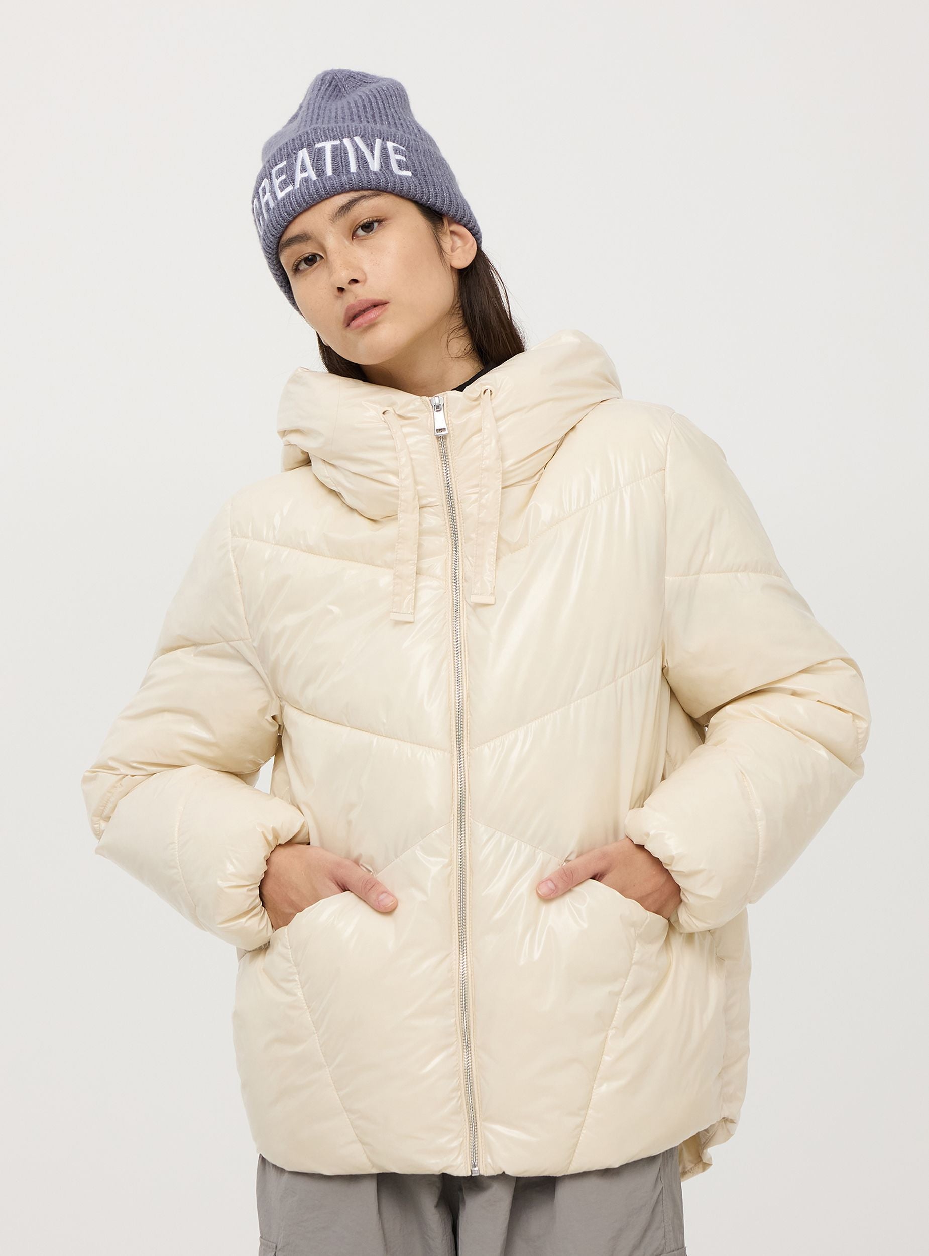 Damenjacke aus nylon mit Steppungen im Chevron-Design. Einfarbiger Stoff mit glänzendem Effekt. Längeres Modell hinten, hoher Kragen und Kapuze, verstellbarer Kordelzug, Frontverschluss mit metallischem Reißverschluss. Unsichtbare horizontale Taschen mit Druckknopf. Diese Art der Steppung betont die Silhouette und macht die Figur besonders schlank. Oversize-Passform.Details