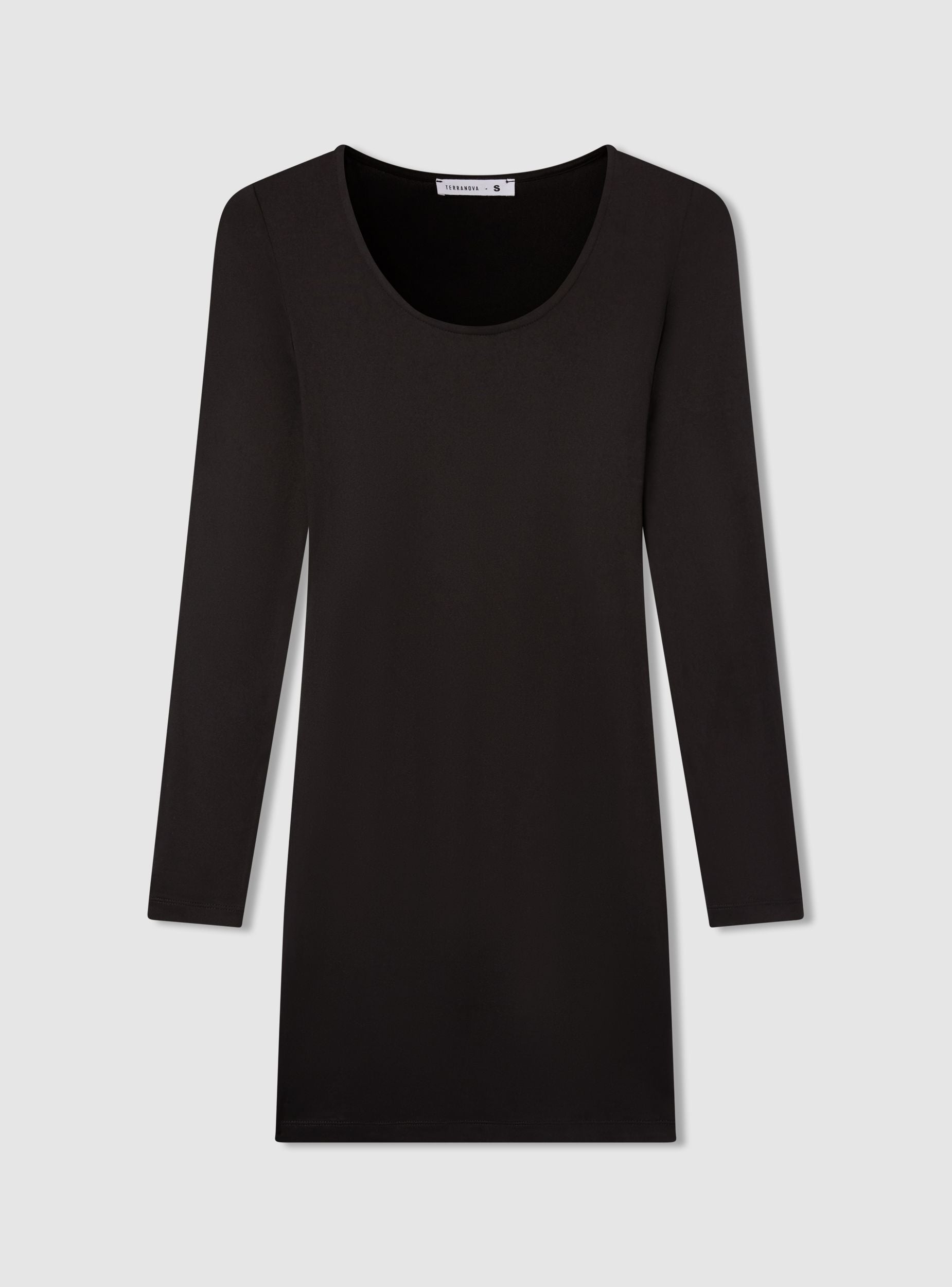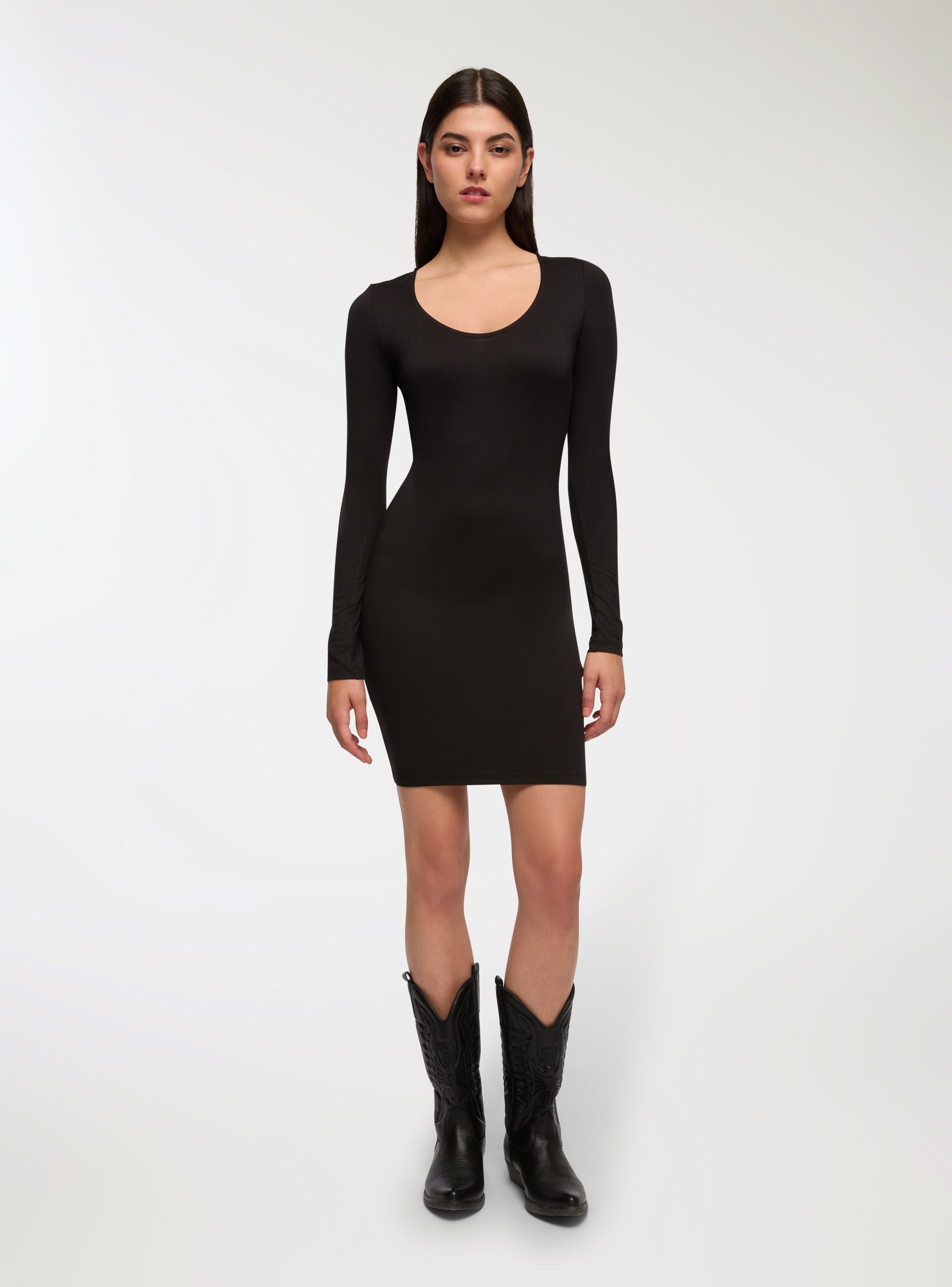Damenkleid Modell Bodydress mit langen Ärmeln und weitem Ausschnitt, gedacht, um die Silhouette mit Eleganz und Einfachheit zu betonen. Das figurbetonte Design umschmeichelt die Formen mit Weiblichkeit, während der Stoff ein weiches und samtiges Gefühl auf der Haut vermittelt. Perfekt für vielseitige Looks tagsüber oder abends, lässt es sich leicht mit Stiefeln oder Pumps für einen zeitgemäßen Stil kombinieren.