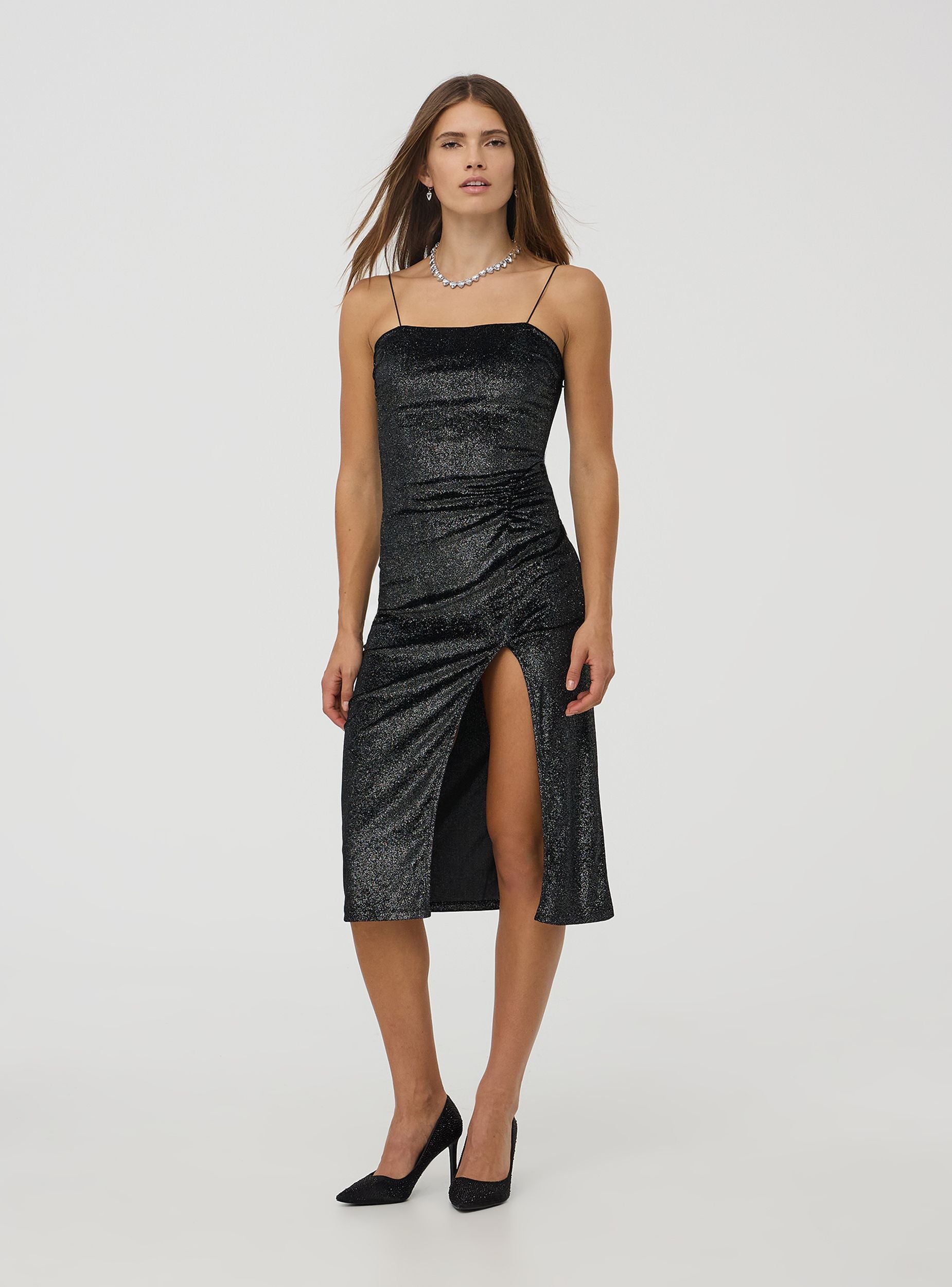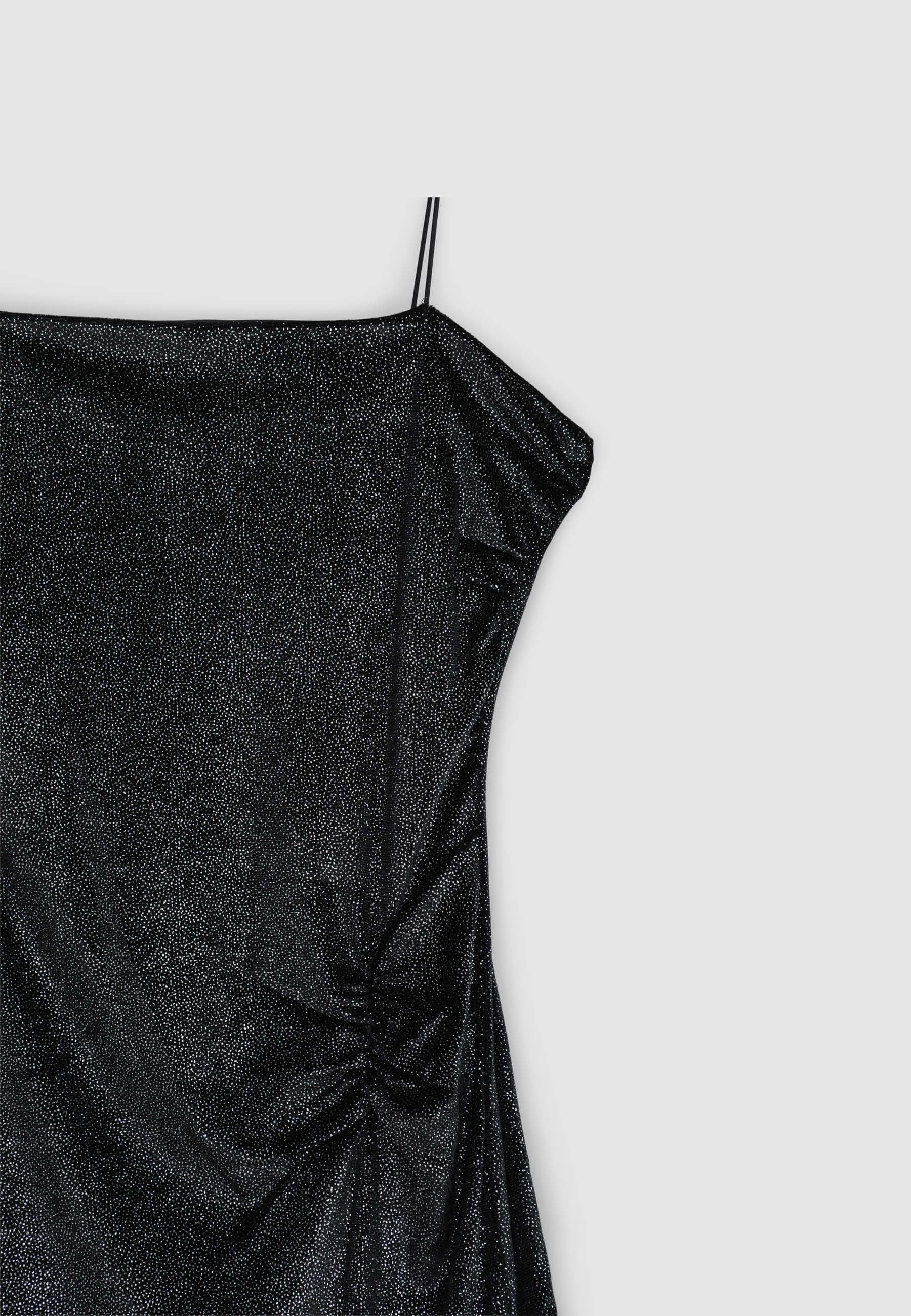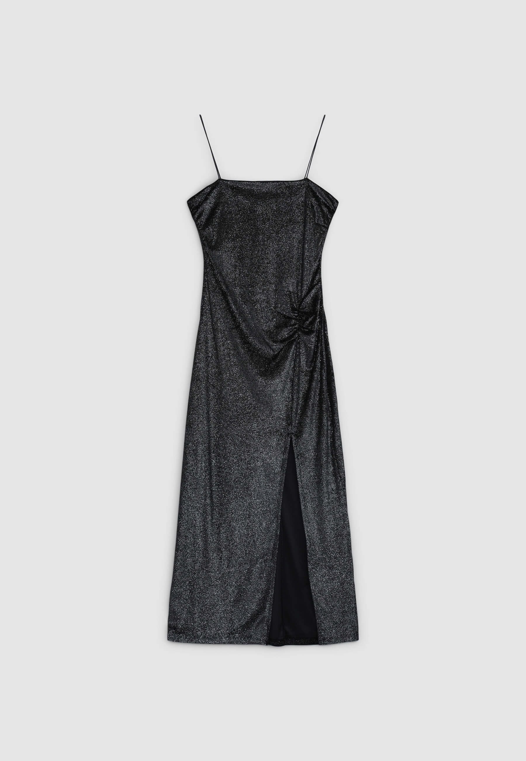 Langes Damenkleid mit schmalen Trägern aus einfarbigem Samtstoff, mit seitlichen Rüschendetails und einer figurbetonten Silhouette mit seitlichem Schlitz. Perfekt für besondere Anlässe oder elegante Abende.Details