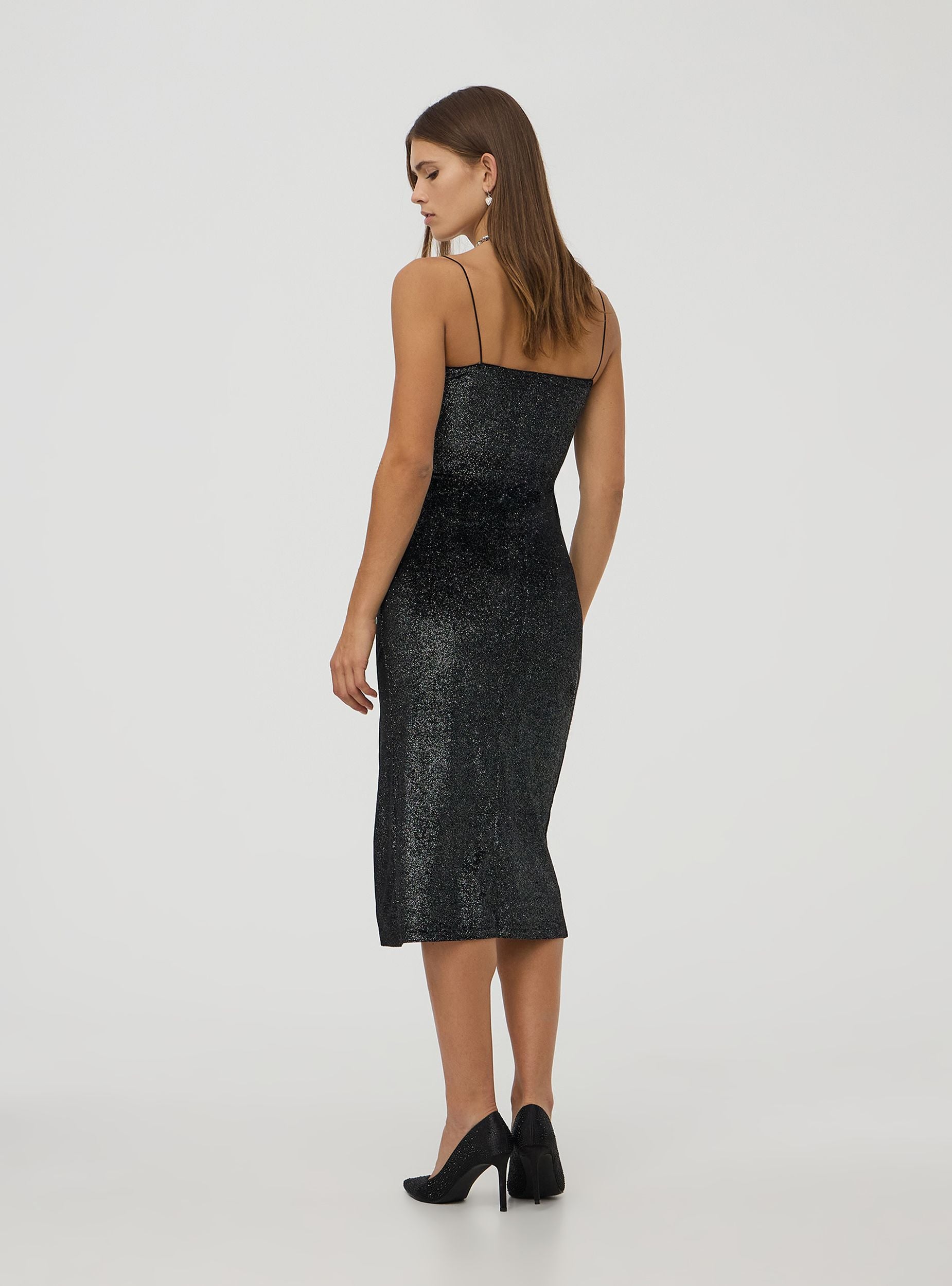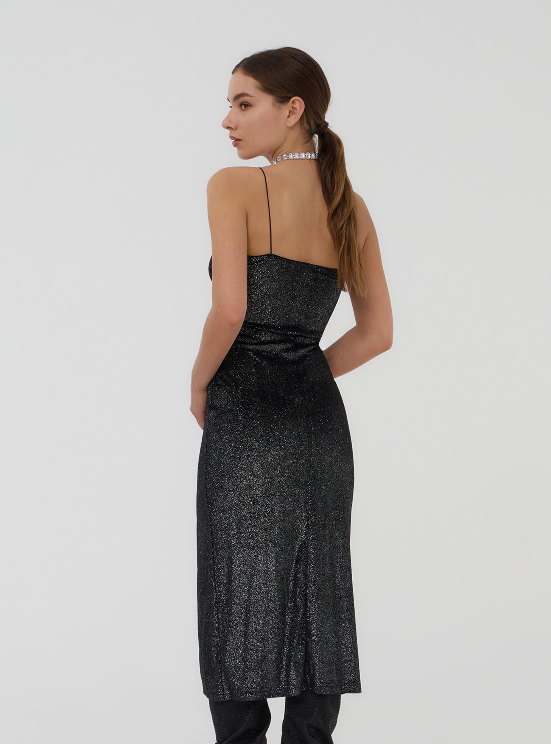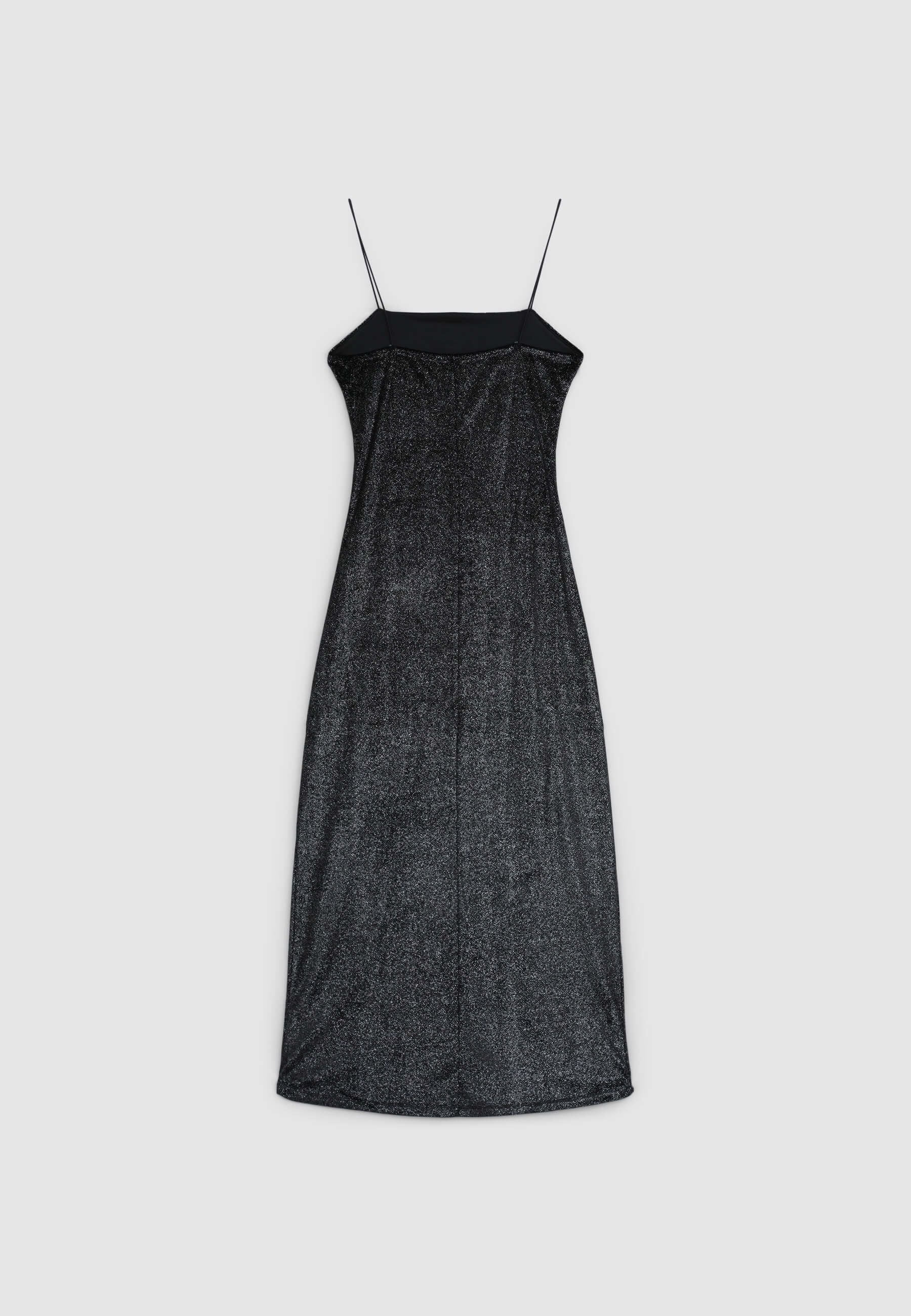 Langes Damenkleid mit schmalen Trägern aus einfarbigem Samtstoff, mit seitlichen Rüschendetails und einer figurbetonten Silhouette mit seitlichem Schlitz. Perfekt für besondere Anlässe oder elegante Abende.Details