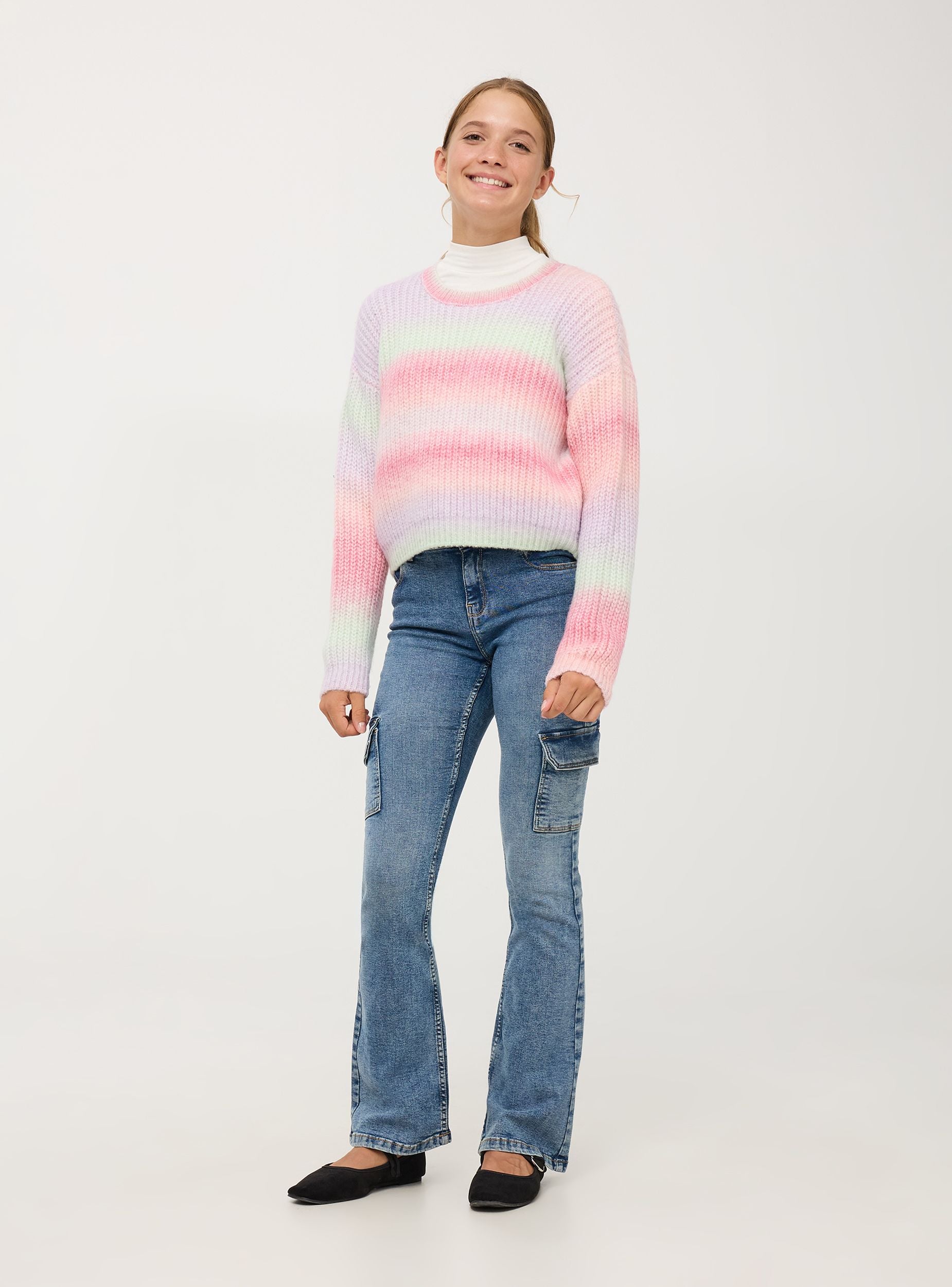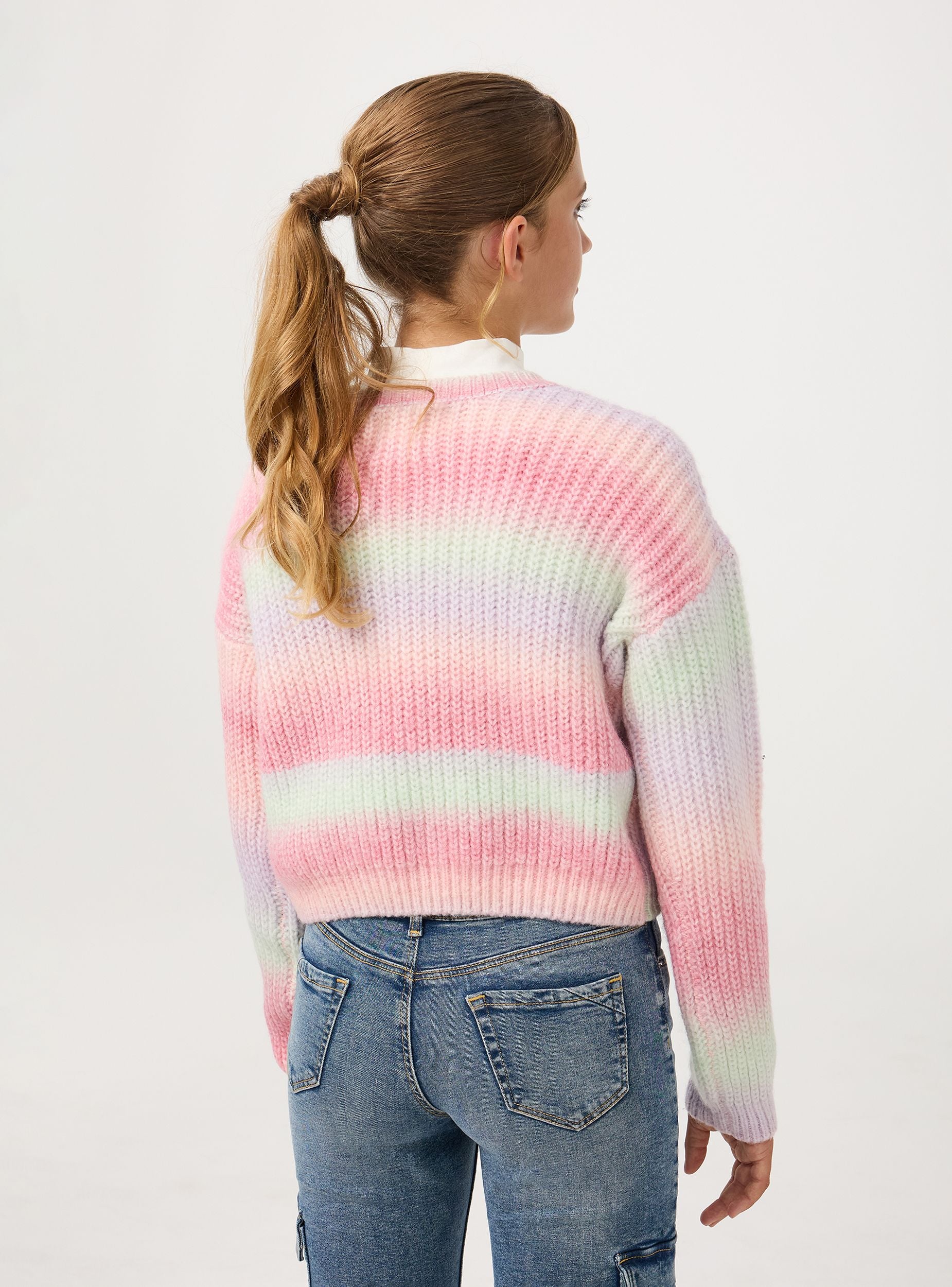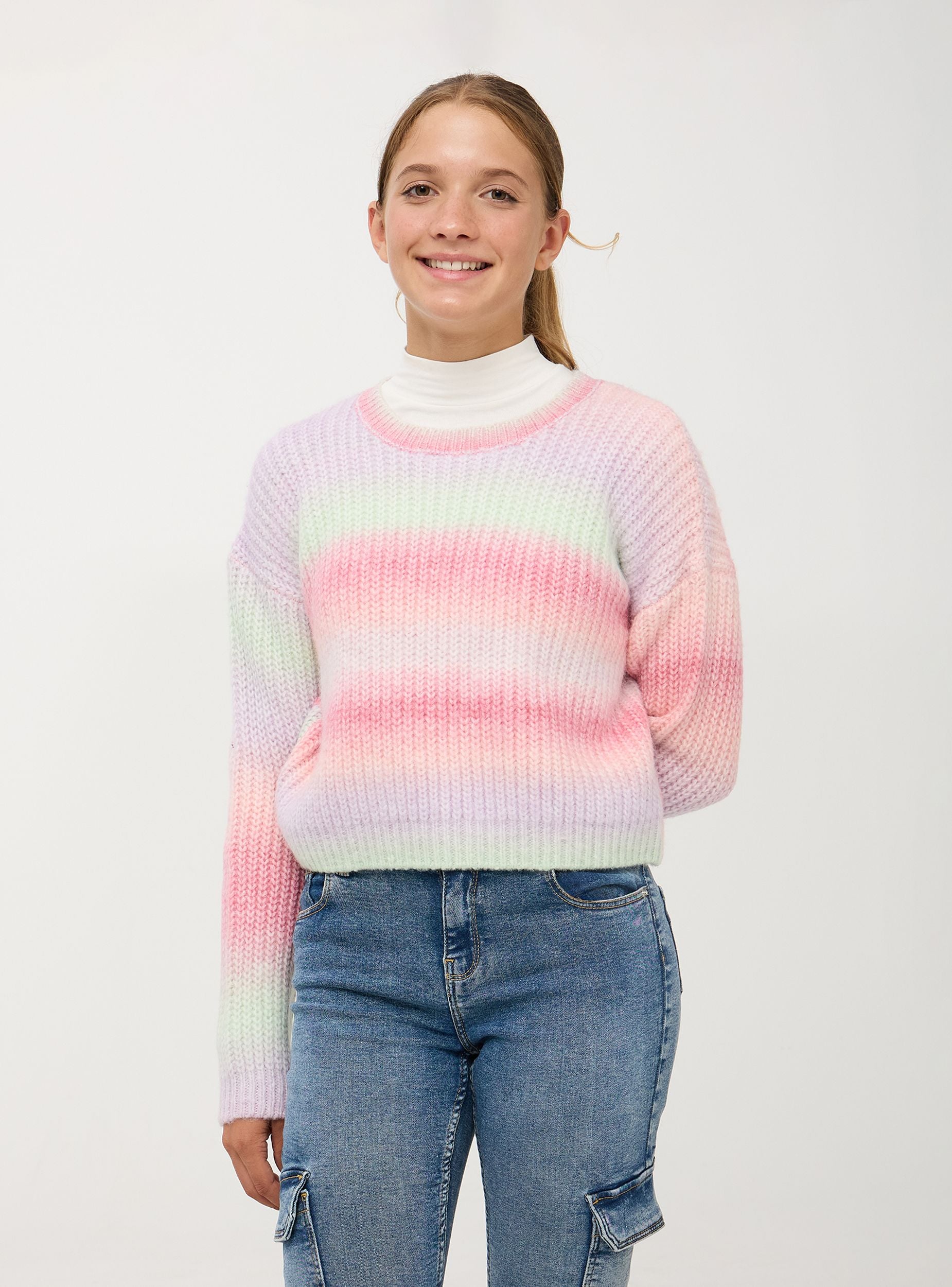 Mädchenpullover mit einem schattierten Streifenmuster. Hergestellt aus weichem und warmem Stoff, verfügt dieser Pullover über lange Ärmel und eine bequeme Passform, die Bewegungsfreiheit garantiert. Die schattierten Streifen dieses Pullovers sind durch leuchtende, fast fluoreszierende Farben gekennzeichnet, die dem Look einen lebhaften und fröhlichen Touch verleihen. Perfekt für die kälteren Tage, ist dieser Pullover ideal für die Schule, in der Freizeit und für einen Ausflug mit der Familie oder Freunden. Kombiniere ihn mit Jeans oder Leggings für ein lässiges, aber trendiges Outfit.Details
