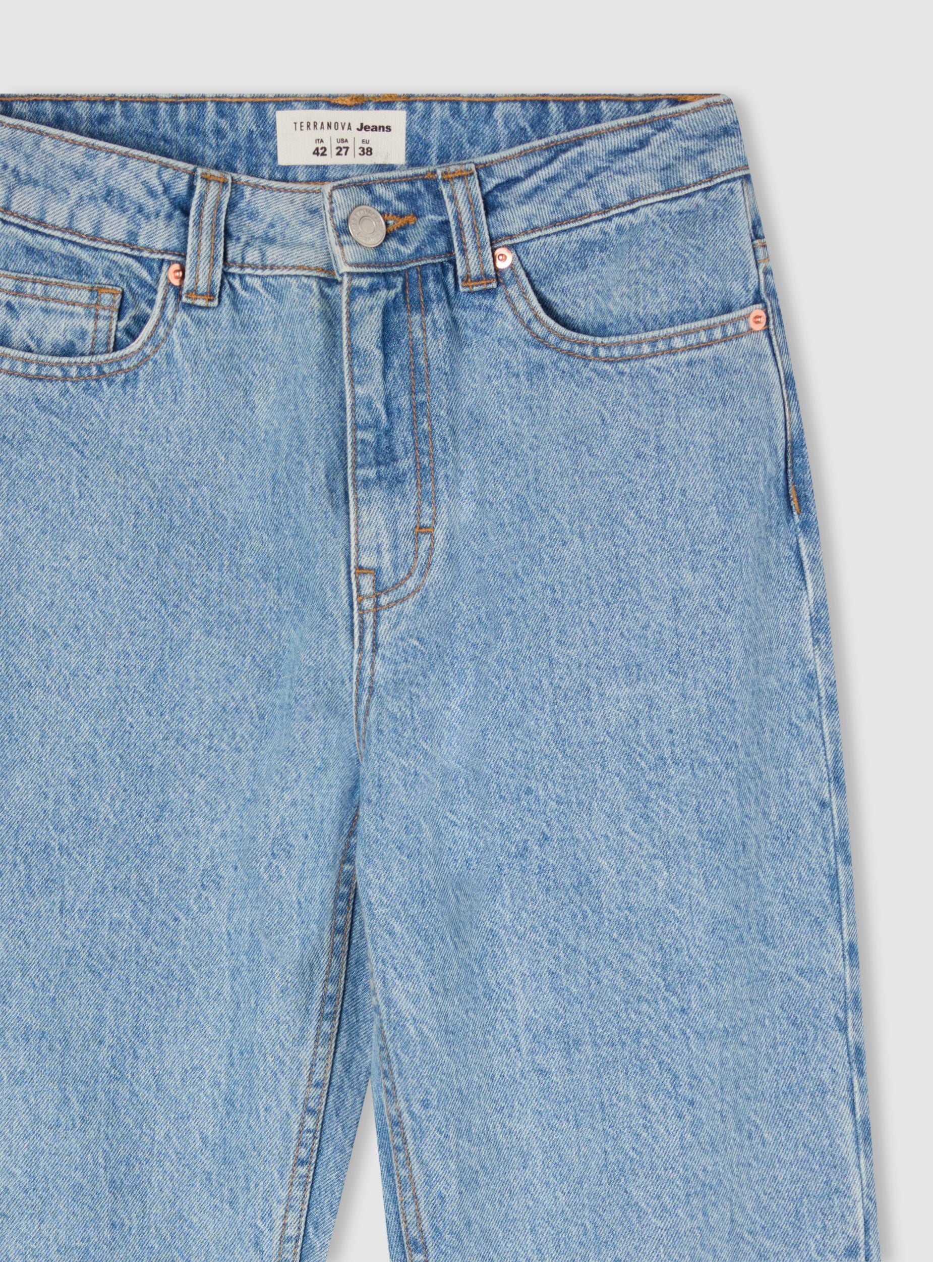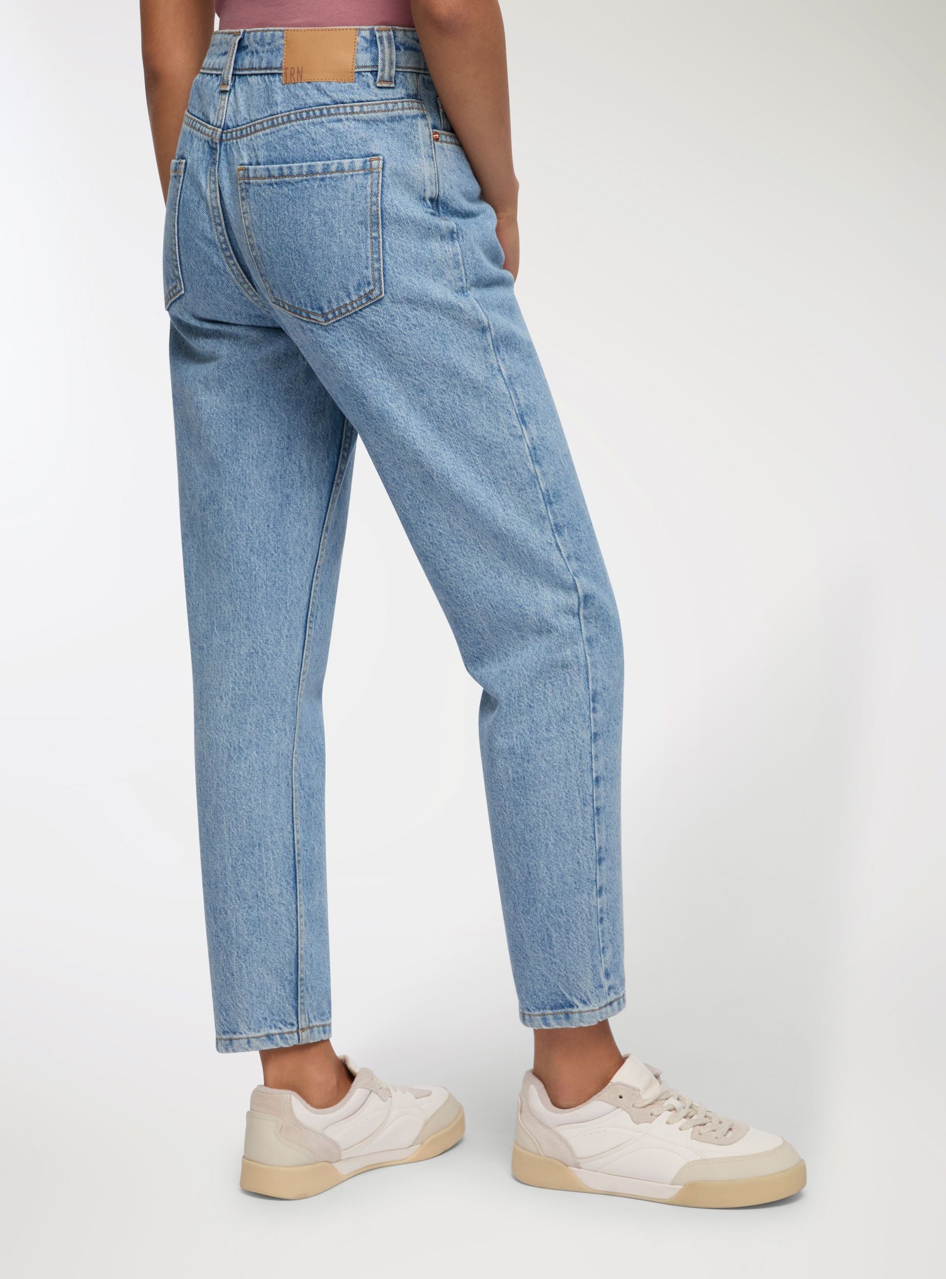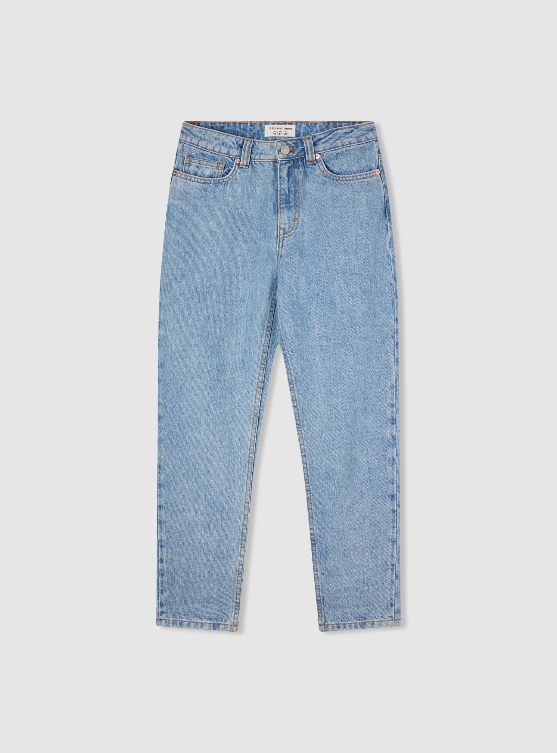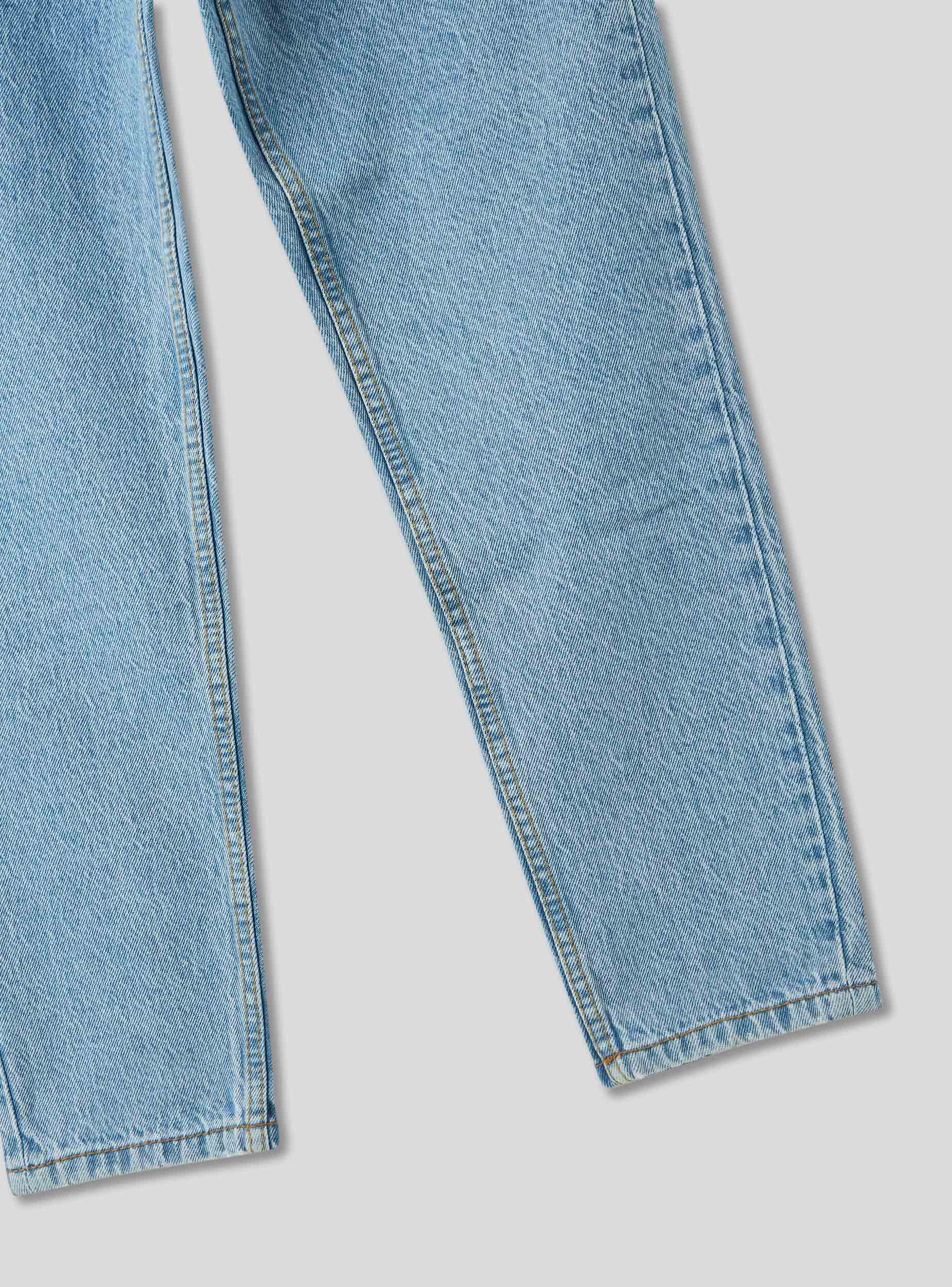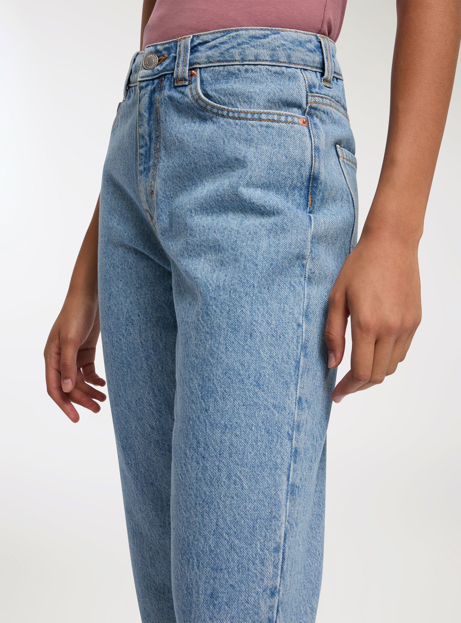 Mom Fit Jeans in hellblauem Denim. Verschluss mit Reißverschluss und Knopf. Modell mit fünf funktionalen Taschen, zwei vorne, zwei hinten und eine kleine Münztasche. Die Kontrastnähte betonen ihre Ästhetik und verleihen einen Hauch von authentischem und Vintage-Stil. Die lockere Passform bietet maximalen Komfort, ohne den Stil zu beeinträchtigen.Details
