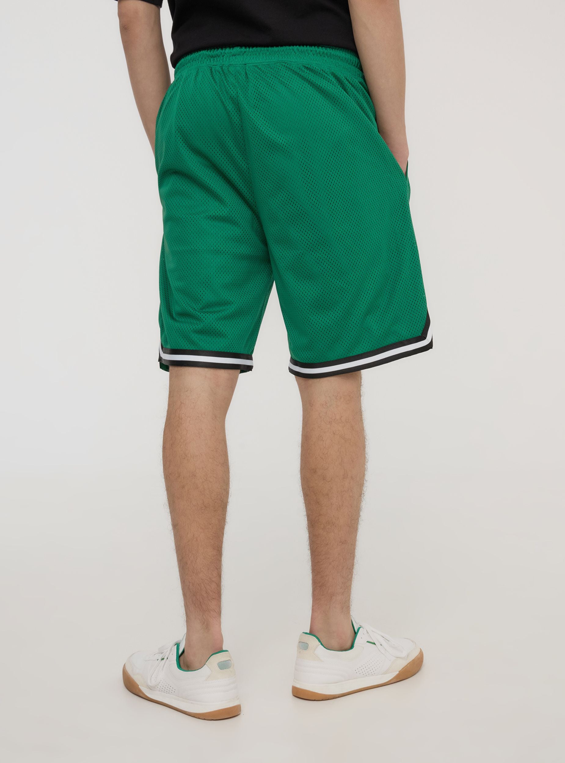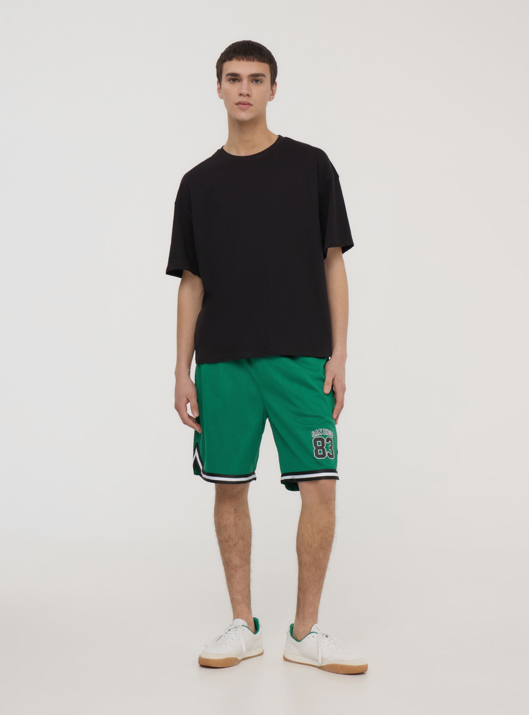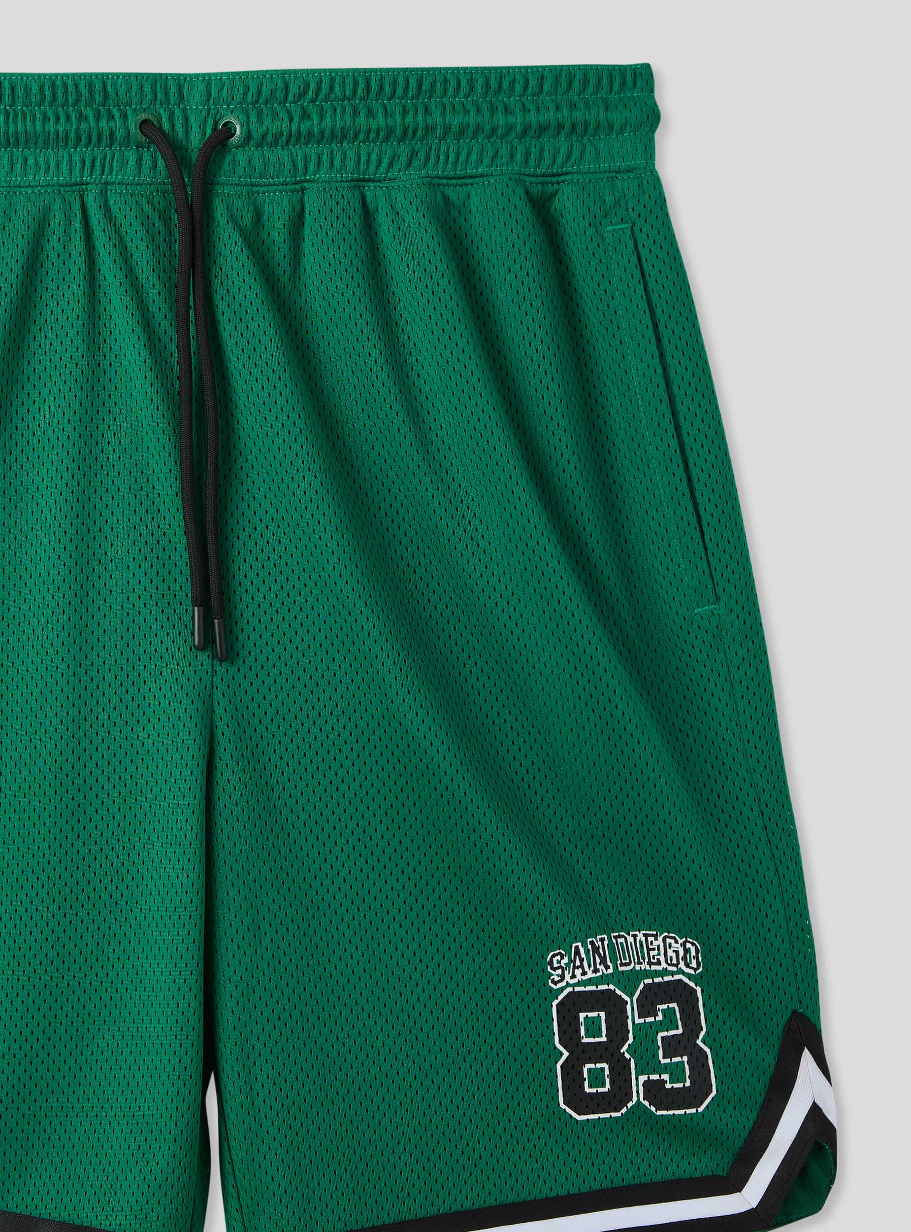 Herren-Bermudas aus Netz, inspiriert vom Basketball, mit einem sportlichen Druck an der Seite. Ausgestattet mit einem praktischen Kordelzug in der Taille für eine individuelle Anpassung, bieten diese Shorts Komfort und einen dynamischen Stil, ideal für sportliche Aktivitäten oder die Freizeit. Der innere Gummizug sorgt für eine hervorragende Passform. Ausgestattet mit praktischen Seitentaschen. Perfekt für alle, die einen sportlich-lässigen Look mit modernem Touch suchen.Details