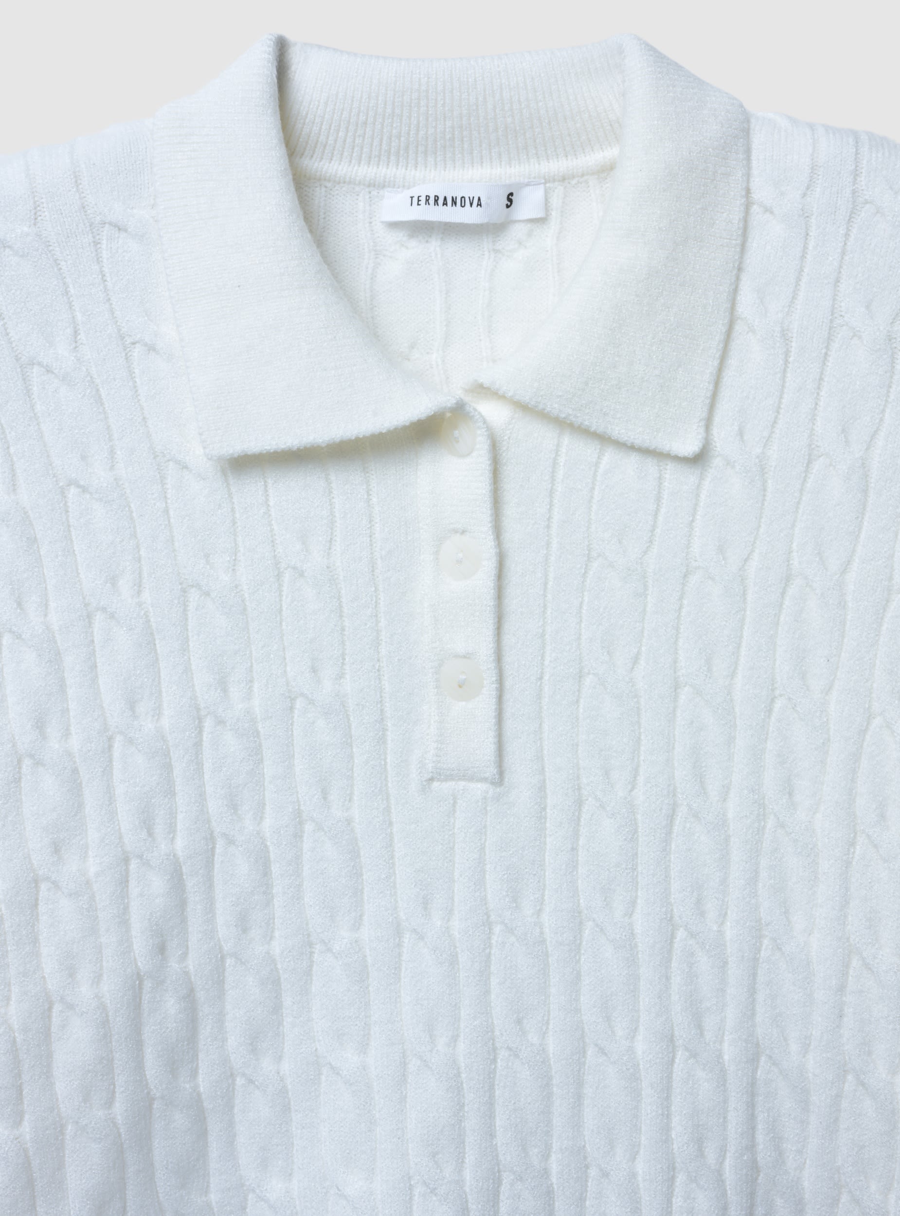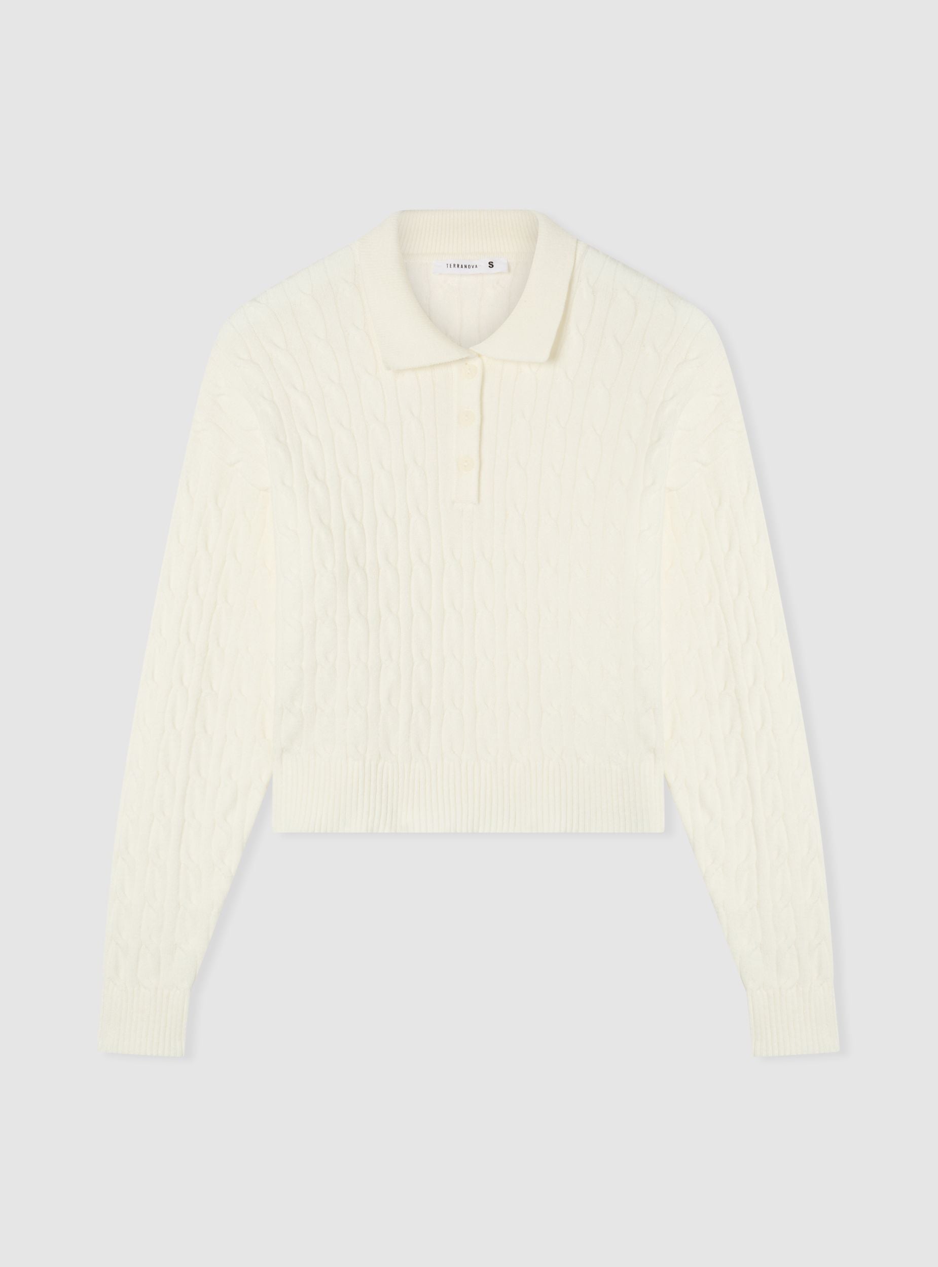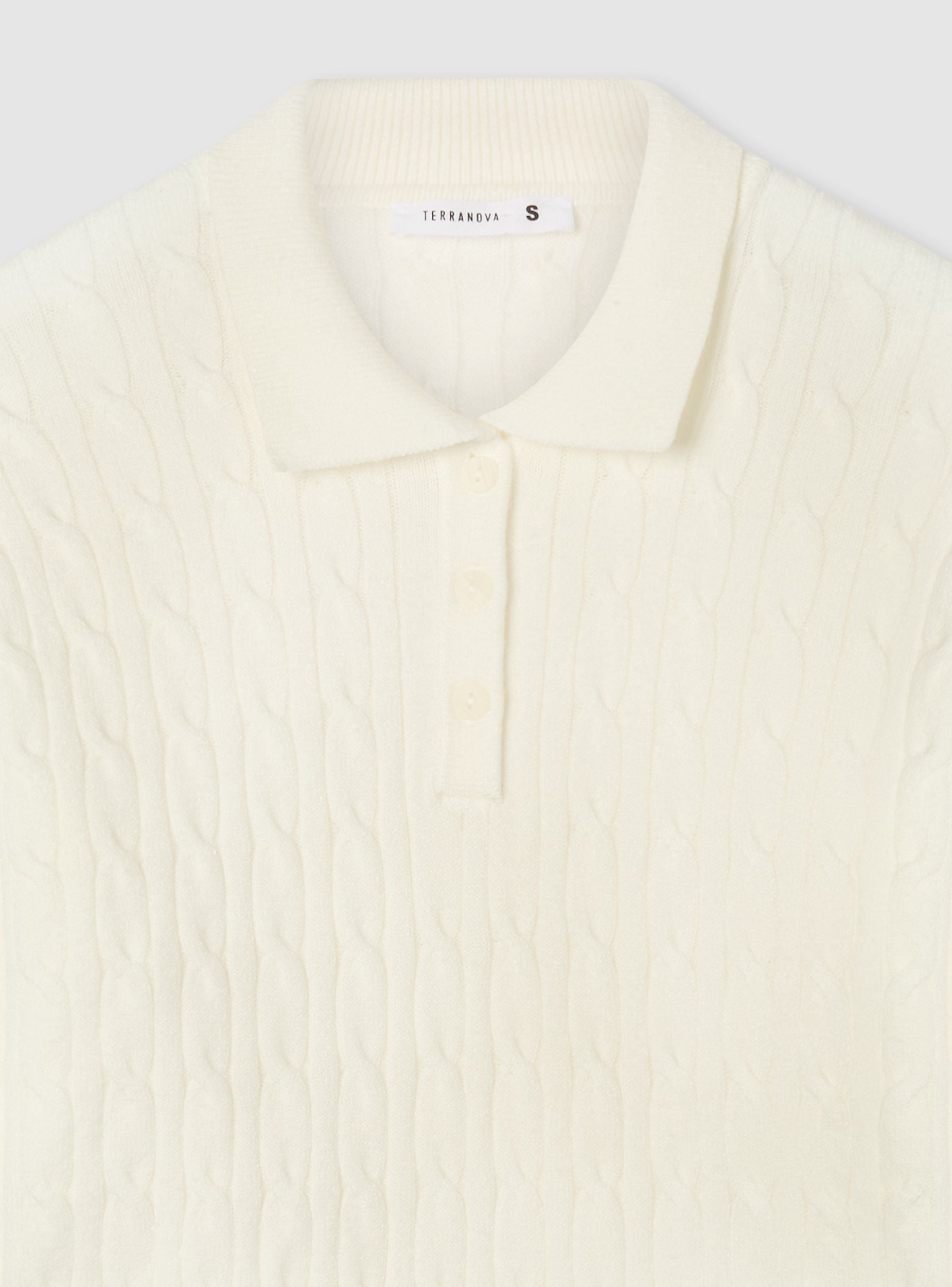 Damenpullover mit Polodesign und Zopfmuster. Ausgestattet mit Polokragen und Knopfleiste vorne bietet dieser Pullover eine bequeme und moderne Passform. Perfekt für einen lässigen Look, lässt er sich leicht mit Jeans oder hoch taillierten Hosen kombinieren und ist somit ideal für verschiedene Anlässe.