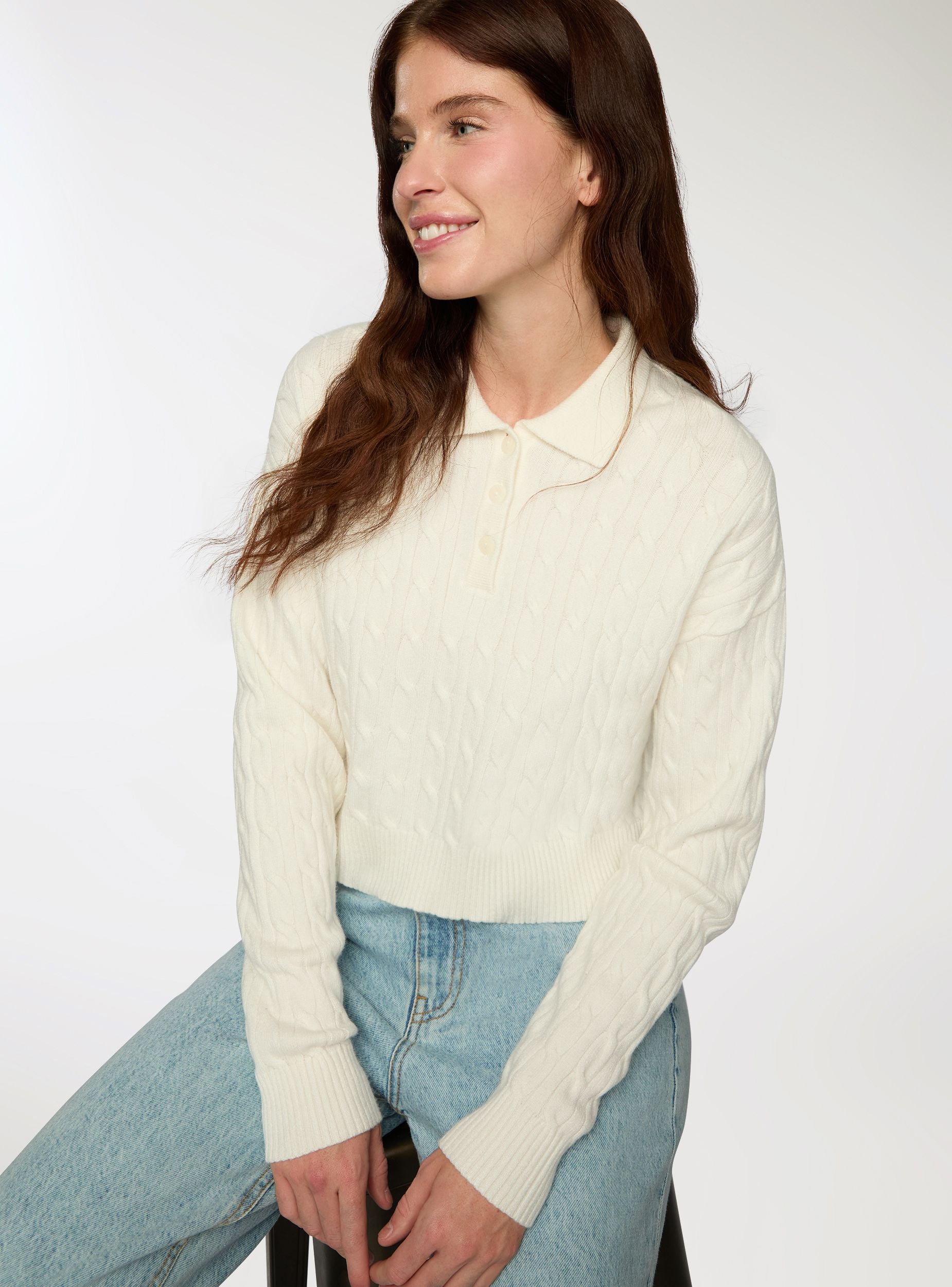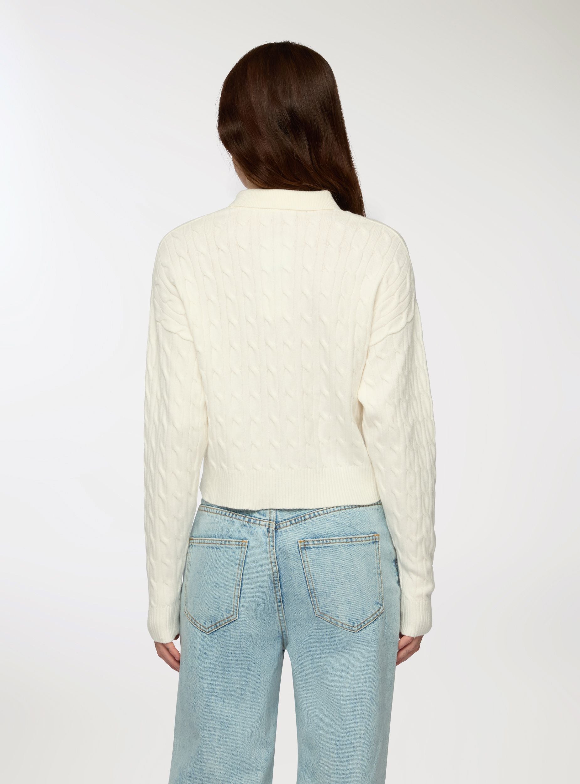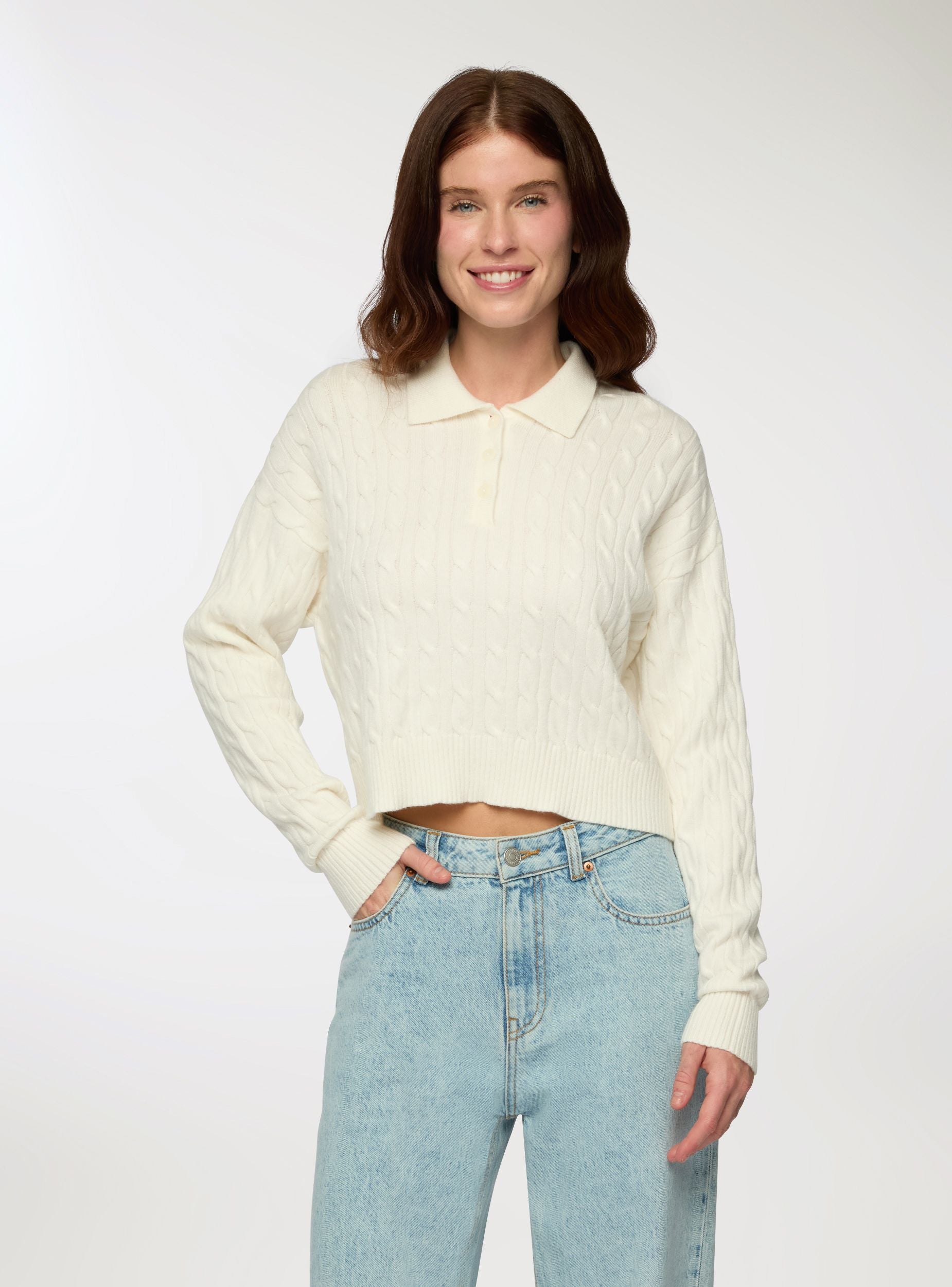 Damenpullover mit Polodesign und Zopfmuster. Ausgestattet mit Polokragen und Knopfleiste vorne bietet dieser Pullover eine bequeme und moderne Passform. Perfekt für einen lässigen Look, lässt er sich leicht mit Jeans oder hoch taillierten Hosen kombinieren und ist somit ideal für verschiedene Anlässe.