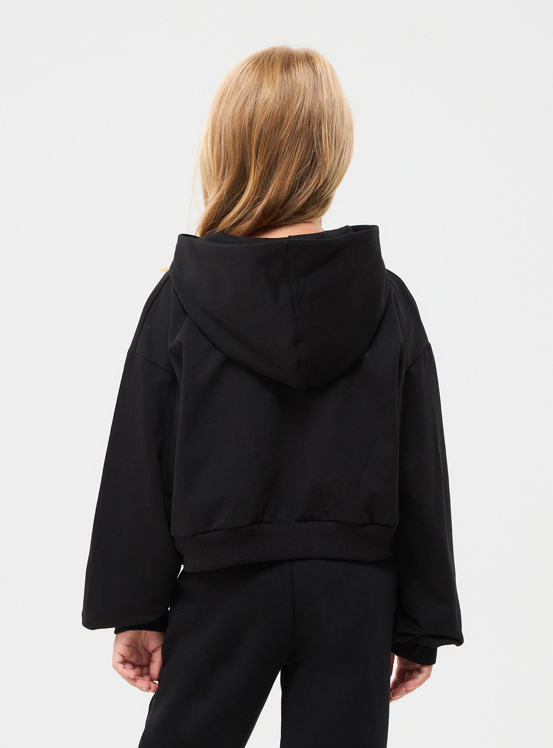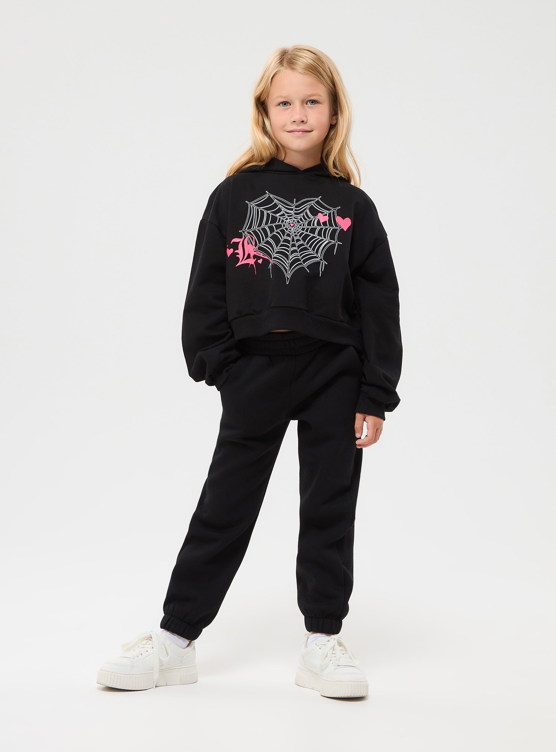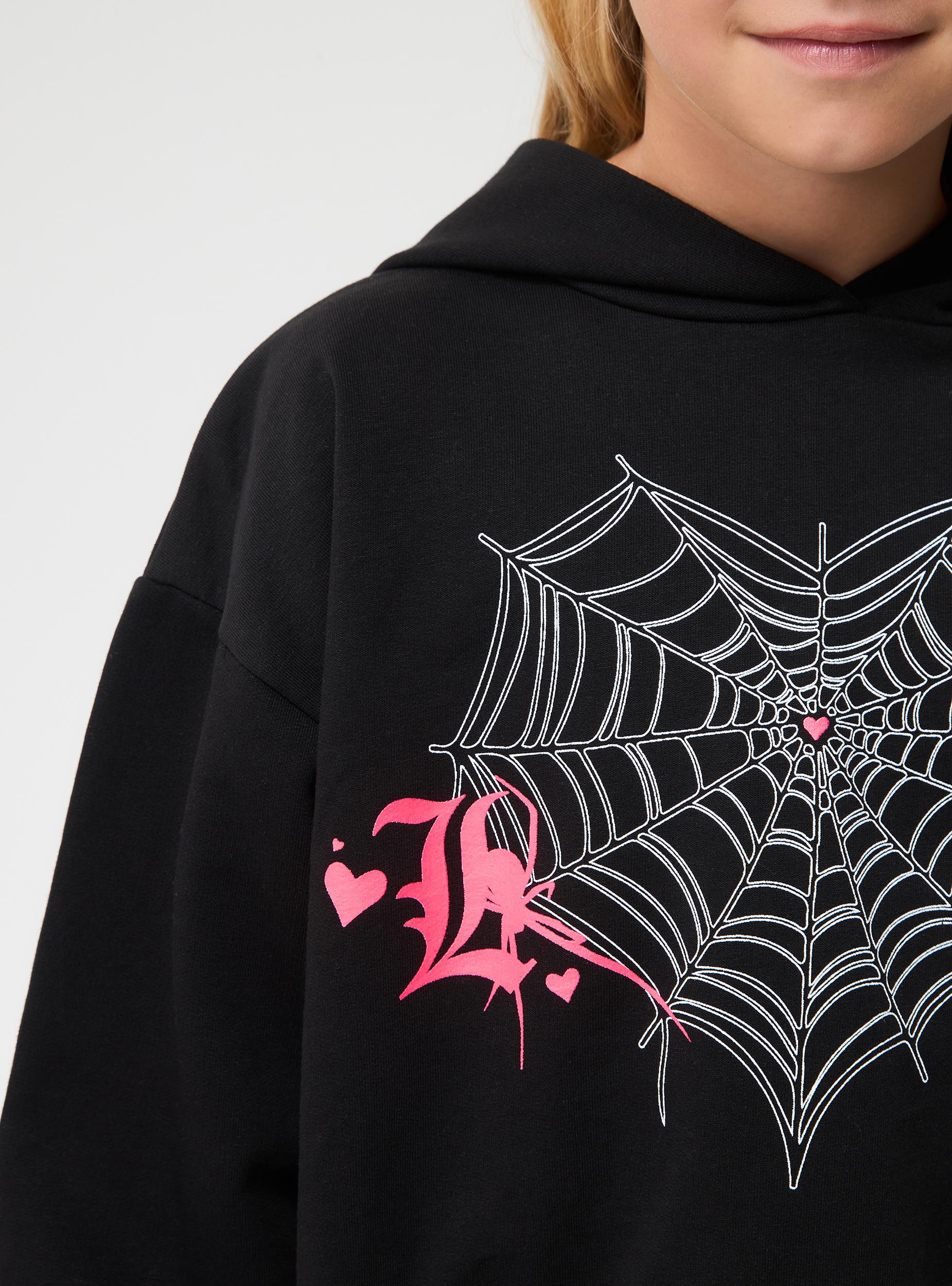 Mädchen-Sweatshirt aus Baumwolle, geschlossene Kapuze mit Herz- und Spinnweben-Print