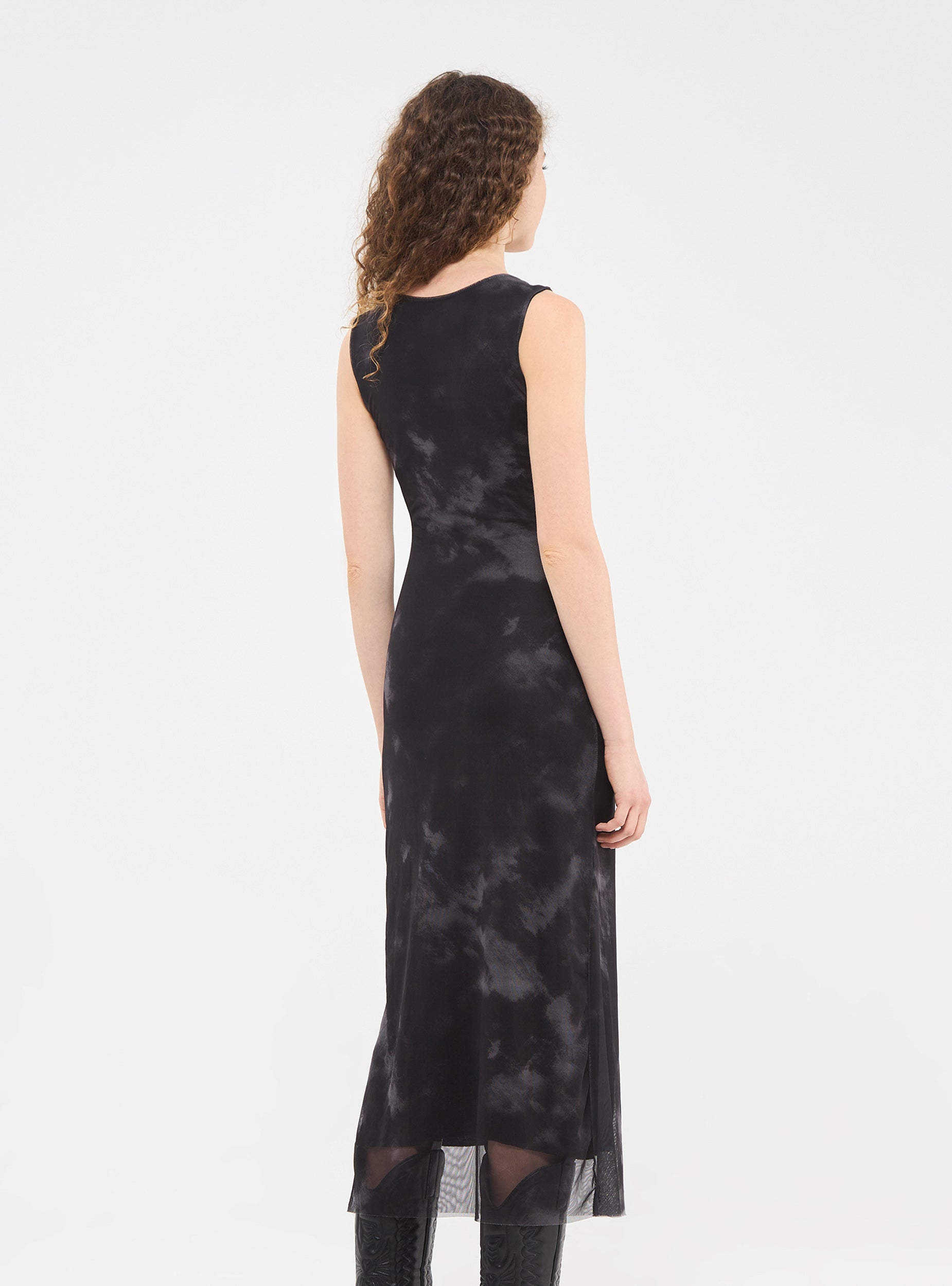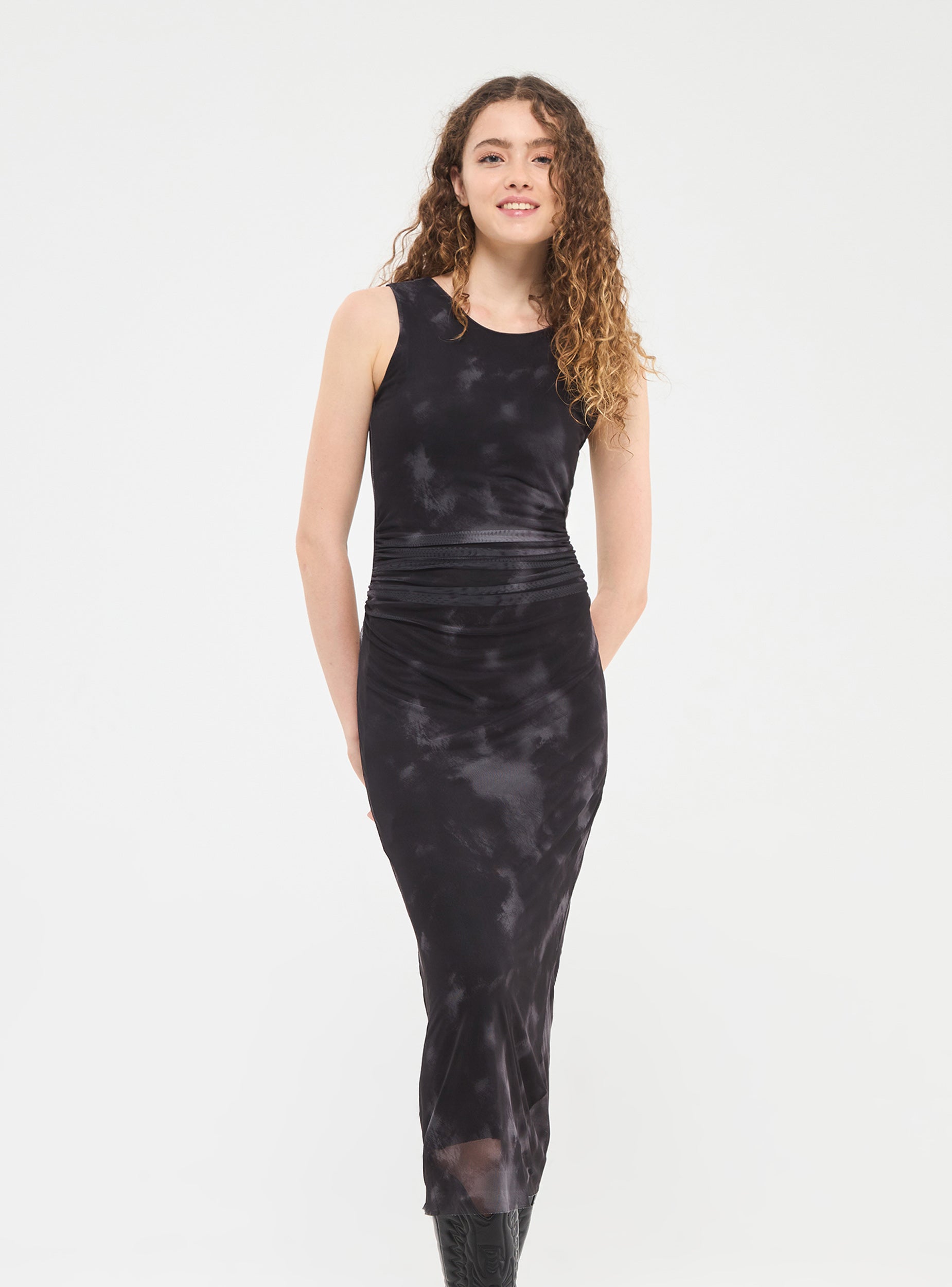 Ärmelloses Damenkleid aus bedrucktem Tüll im Etui-Stil mit DrapierungenDetails