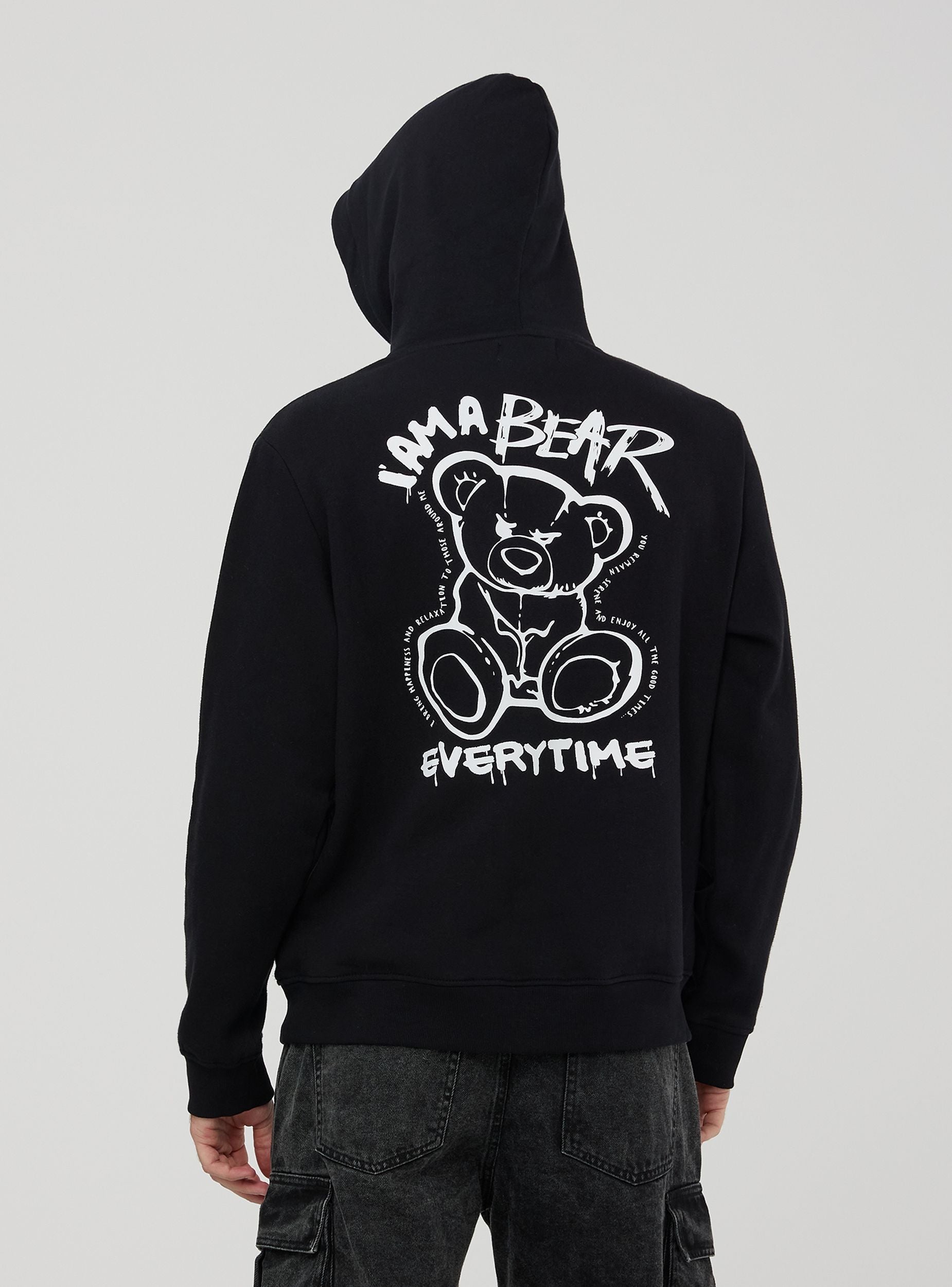 Herrenpullover aus schwerem Stoff, mit verstellbarer Kapuze und einer vorderen Kängurutasche. Er verfügt über einen gummierten Druck mit kleinem Bären vorne und großem auf der Rückseite, der einen Hauch von Persönlichkeit und Originalität verleiht. Perfekt für kalte Tage bietet dieser Pullover Wärme und Komfort. Ein vielseitiges Kleidungsstück, das sich leicht mit Jogginghosen oder Jeans für einen lässigen Look kombinieren lässt. Reguläre Passform.