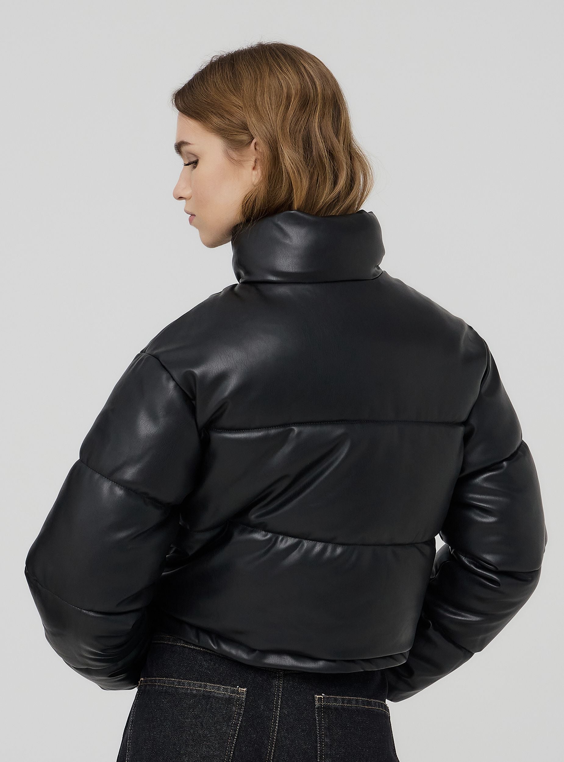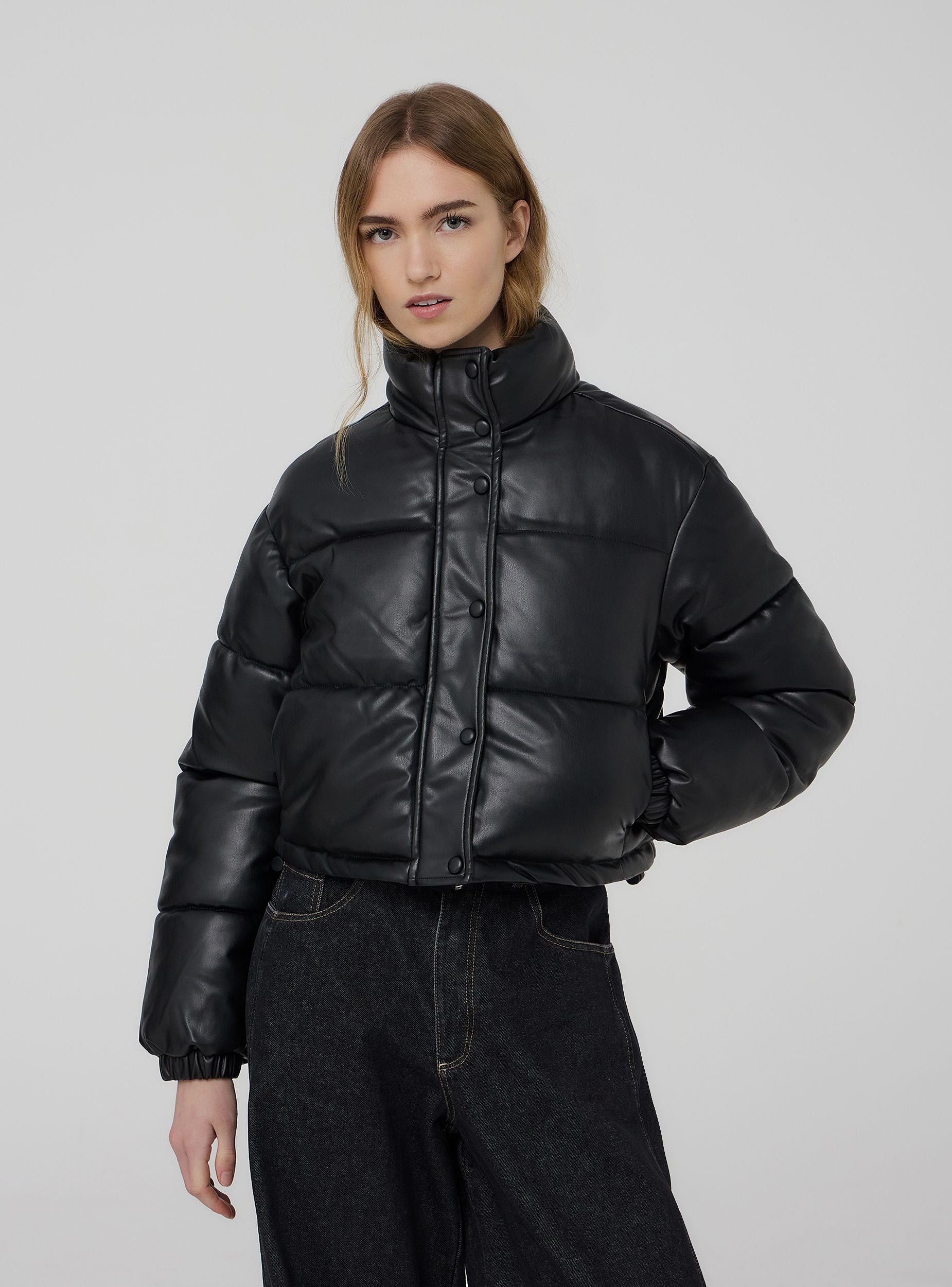 Damen Steppjacke mit kurzem Schnitt und modernem Design. Das Kleidungsstück verfügt über einen Frontreißverschluss mit Druckknöpfen, einen hohen Kragen und eine Füllung, um Wärme und Komfort zu gewährleisten. Die langen, weiten Ärmel verleihen ein voluminöses Aussehen, während der untere Teil und die Bündchen mit verstellbaren elastischen Details für eine individuelle Passform versehen sind. Abgerundet wird das Design durch die seitlichen Taschen mit Druckknopfverschluss, die Praktikabilität und Stil bieten. Modell ohne Kapuze.Details