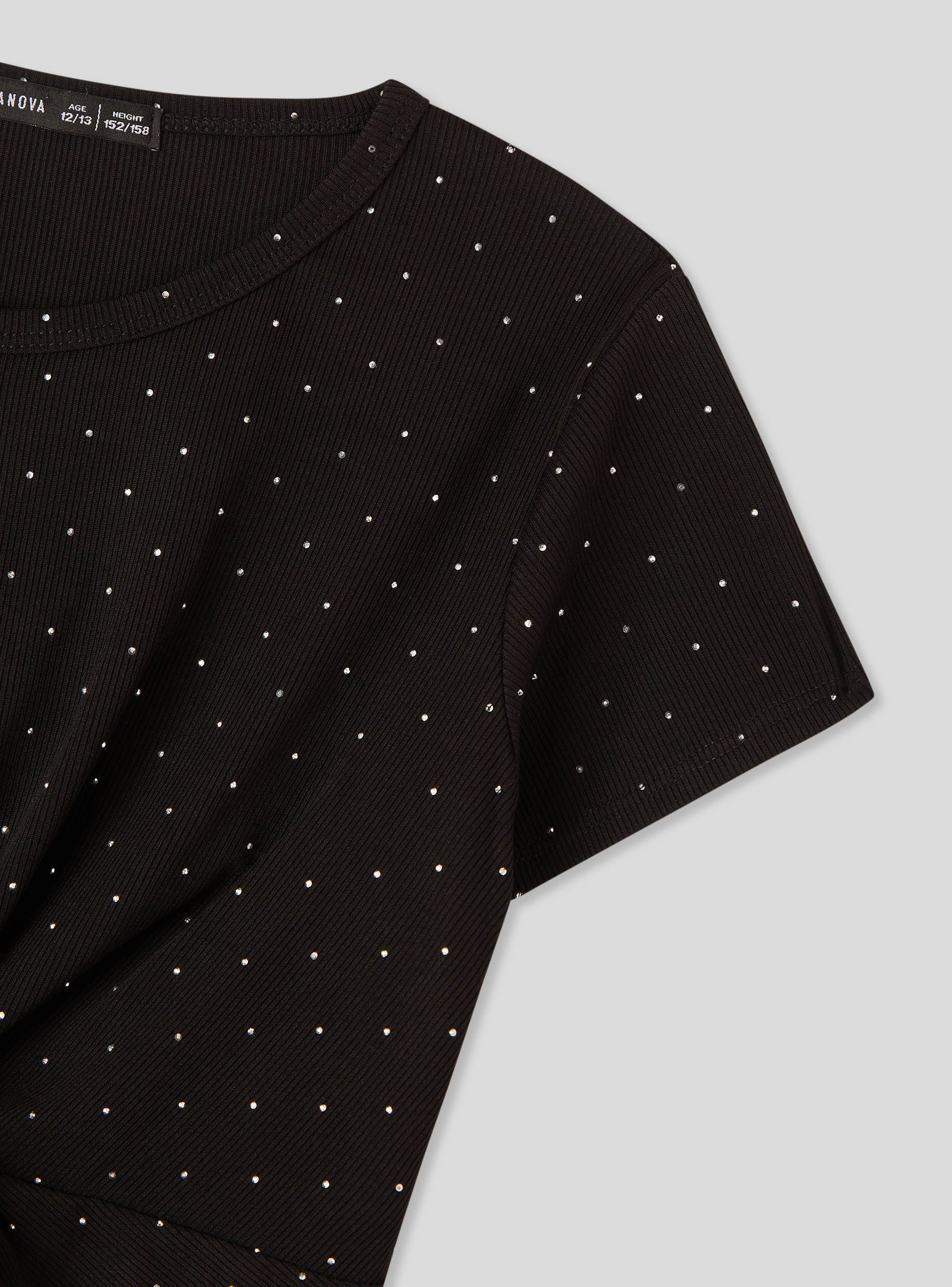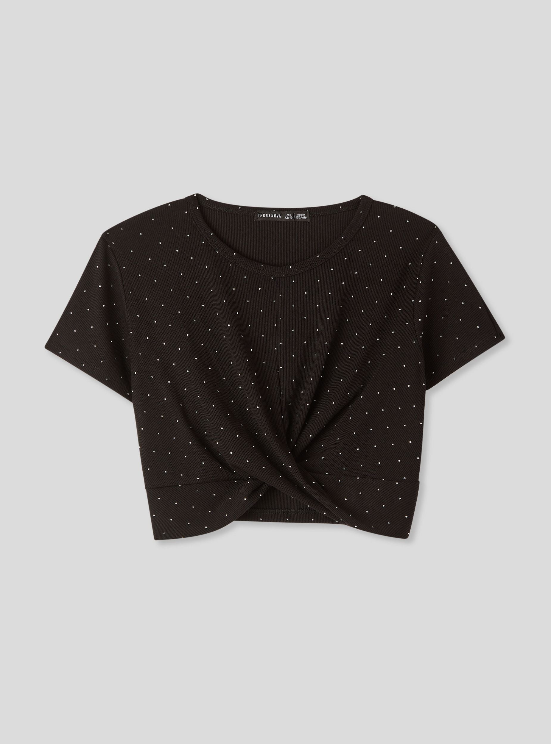 Mädchen-T-Shirt mit Crop-Design, Kreuzung am Saum und dekorativen Applikationen. Es verfügt über einen Rundhalsausschnitt und kurze Ärmel, ideal für einen lässigen und modischen Look. Perfekt kombinierbar mit Jeans oder Shorts für ein frisches und jugendliches Outfit. Die Crop-Passform verleiht einen modernen und vielseitigen Touch, geeignet für verschiedene informelle Anlässe.Details