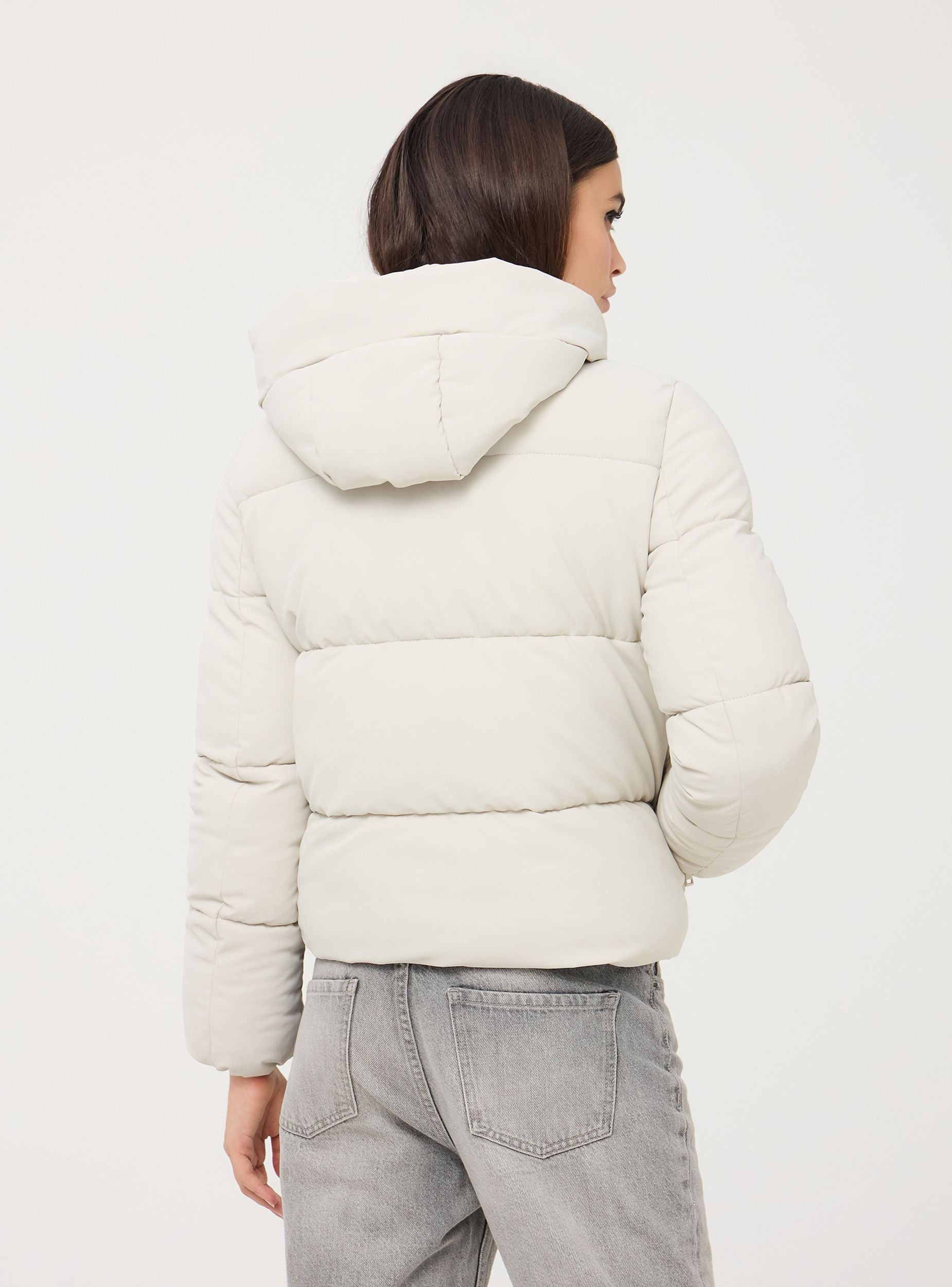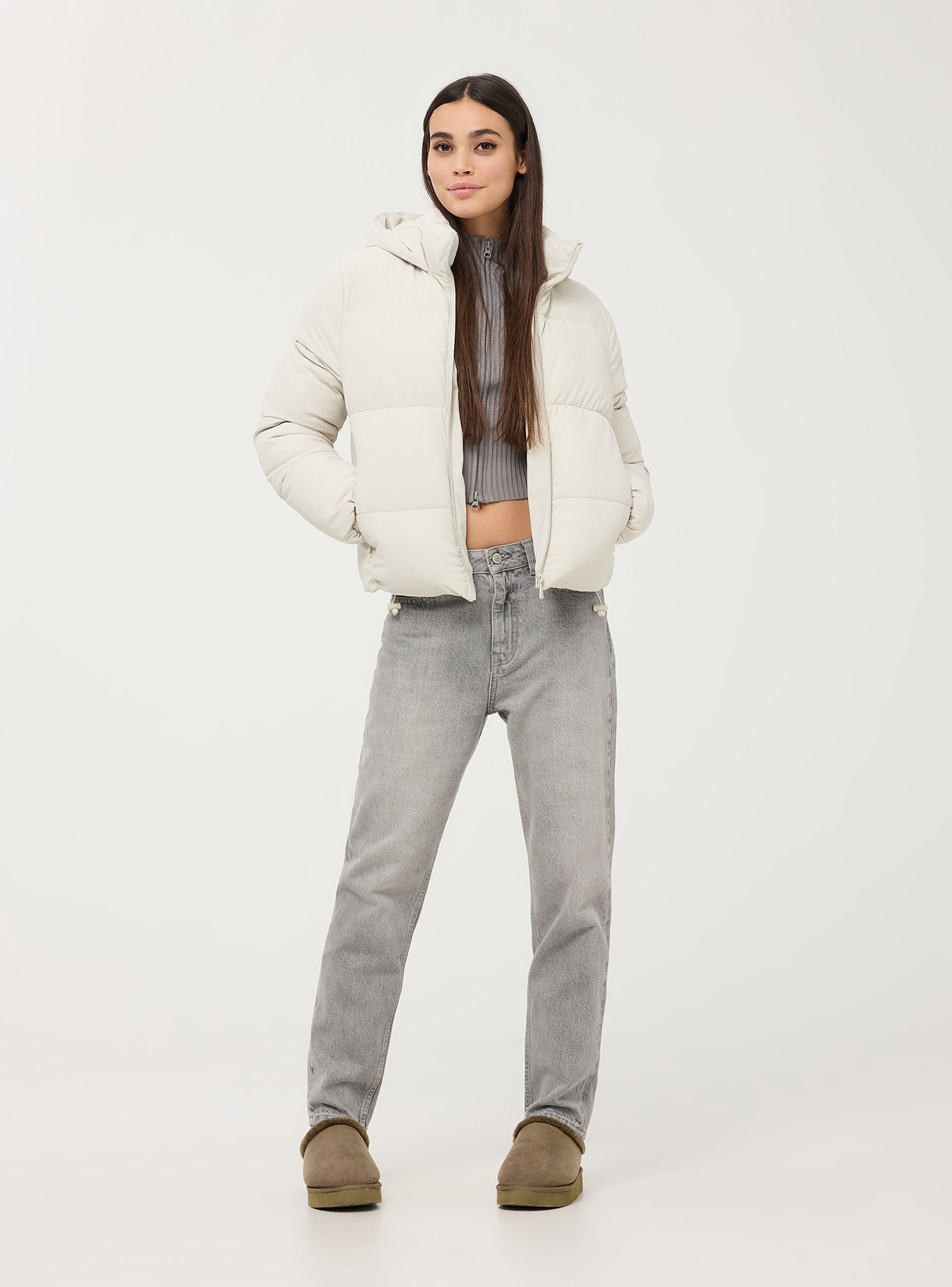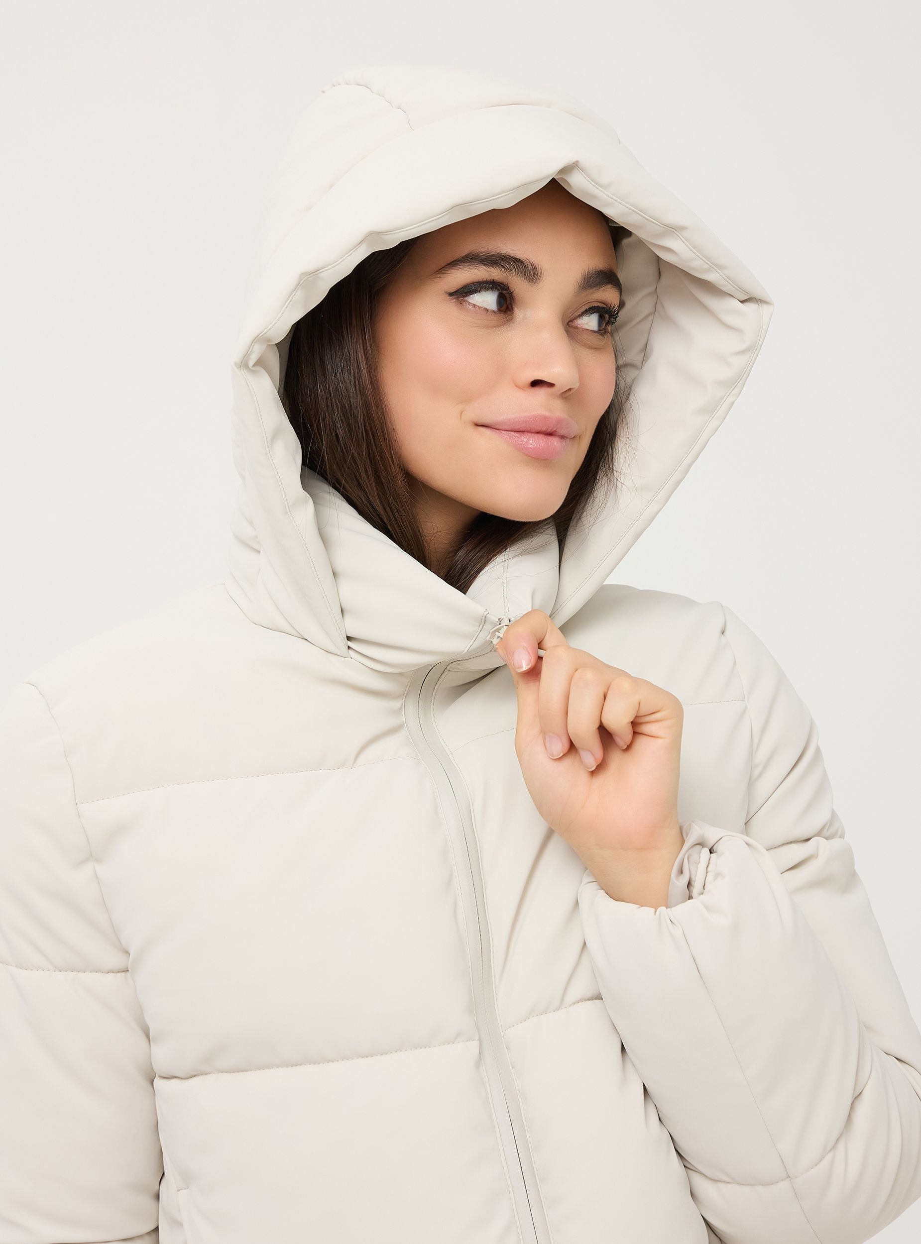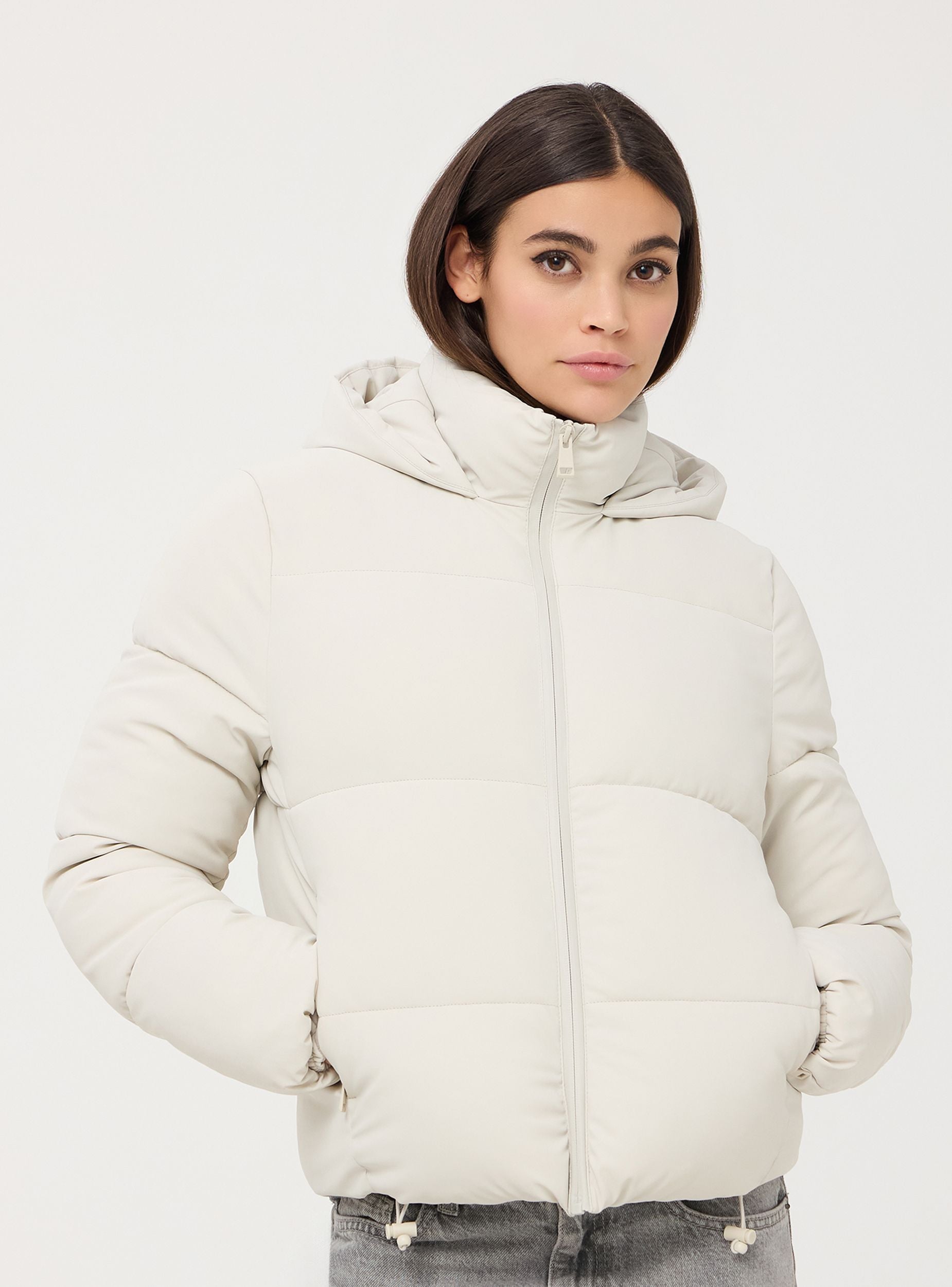Damen gepolsterte Jacke mit gummiertem Effekt, hohem Kragen und Kapuze, langen Ärmeln mit elastischen Bündchen. Vordertaschen mit tonalem Reißverschluss, die in der Naht verborgen sind, verstellbarer Saum mit elastischen Schnüren und Stopper. Tonaler Reißverschluss vorne sorgt nicht nur für einen harmonischen und eleganten Look, sondern bietet auch Praktikabilität und Benutzerfreundlichkeit, indem er dich effektiv vor Kälte schützt. Die schwere Füllung garantiert außergewöhnliche Wärme, während der Puff-Effekt Volumen und einen trendigen Akzent zu deinem Winteroutfit hinzufügt. Dieses Kleidungsstück ist perfekt für alle, die eine Mischung aus Trend und Funktionalität suchen. Ob für einen Stadtbummel oder einen Abendausgang, es begleitet dich mit Eleganz und Wärme zu jedem Anlass. Reguläre Passform.Details