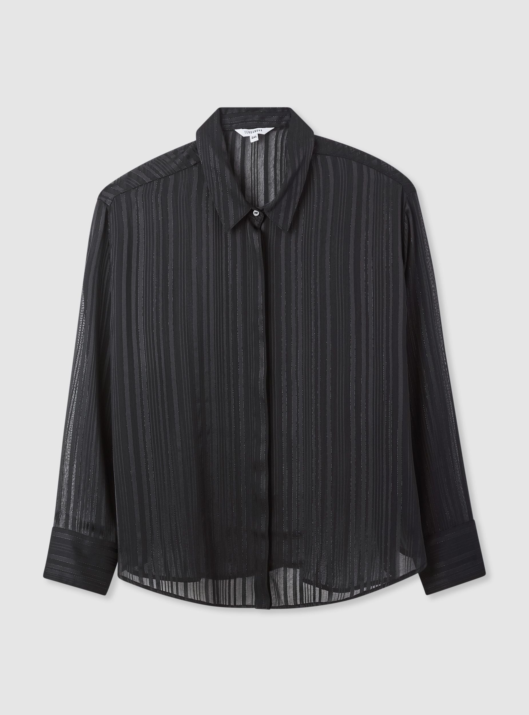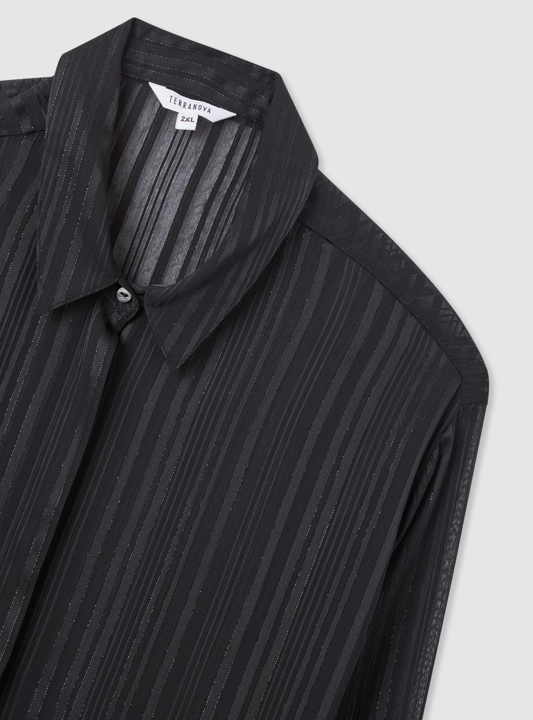 Damenbluse mit langen, gestreiften Ärmeln. Ideal für elegante Anlässe. Verfügt über einen klassischen Kragen und eine Knopfleiste. Perfekt kombinierbar mit eleganten Hosen oder Röcken für ein anspruchsvolles Outfit. Halbtransparentes Gewebe mit schimmerndem Effekt.