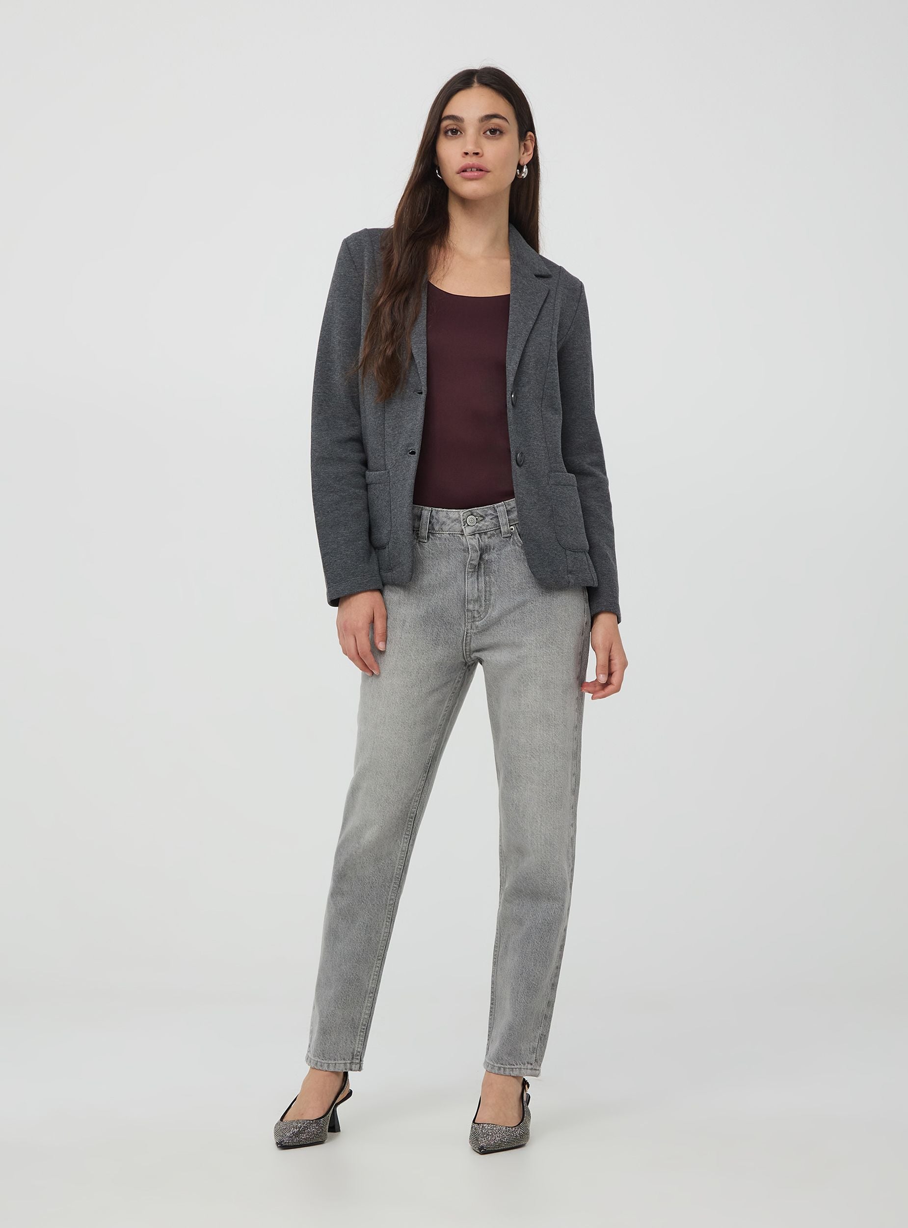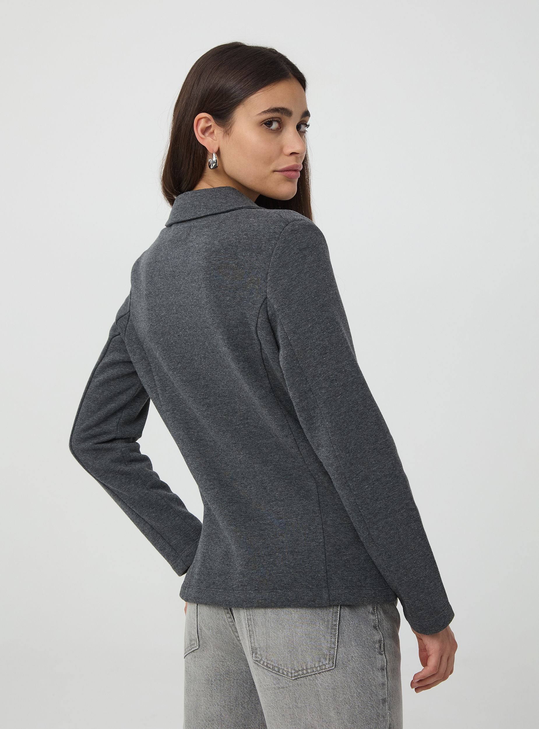 Damenjacke aus einfarbigem Sweatstoff, einreihiges Modell mit zwei tonalen Knöpfen, mit Reverskragen und aufgesetzten Fronttaschen. Die vertikalen Nähte verleihen diesem Modell eine schlanke Passform, die die Formen betont und es besonders feminin macht.Details