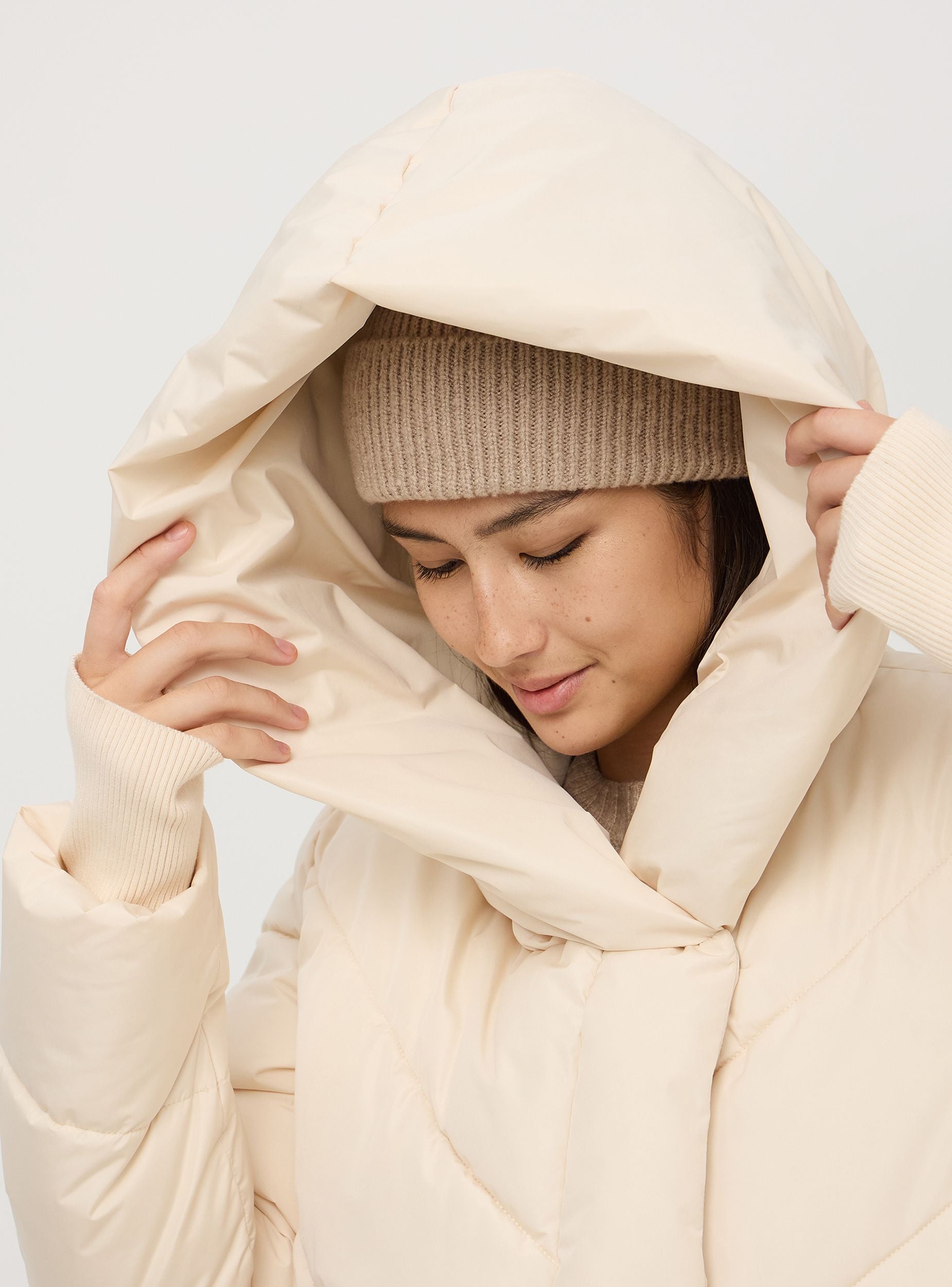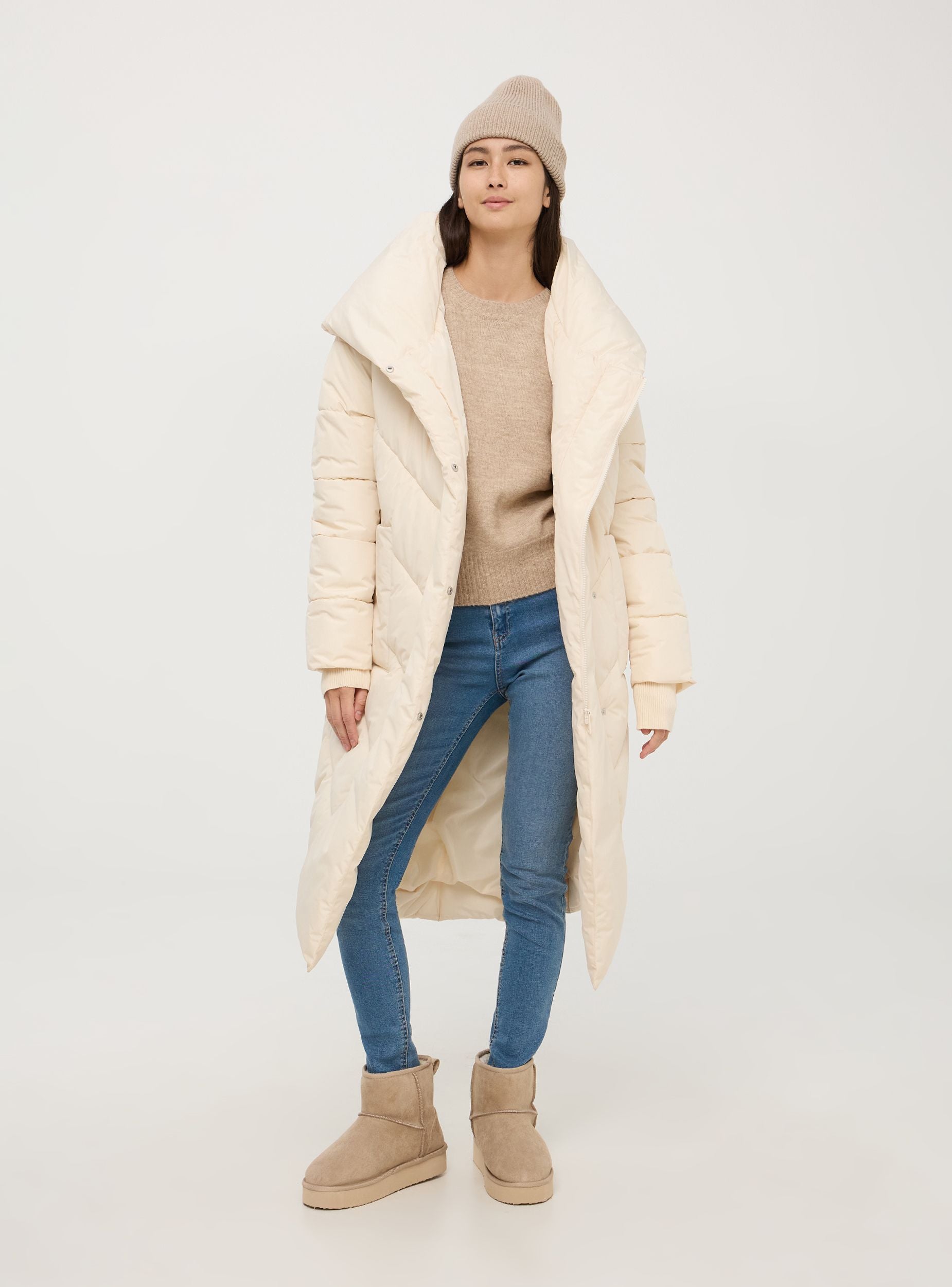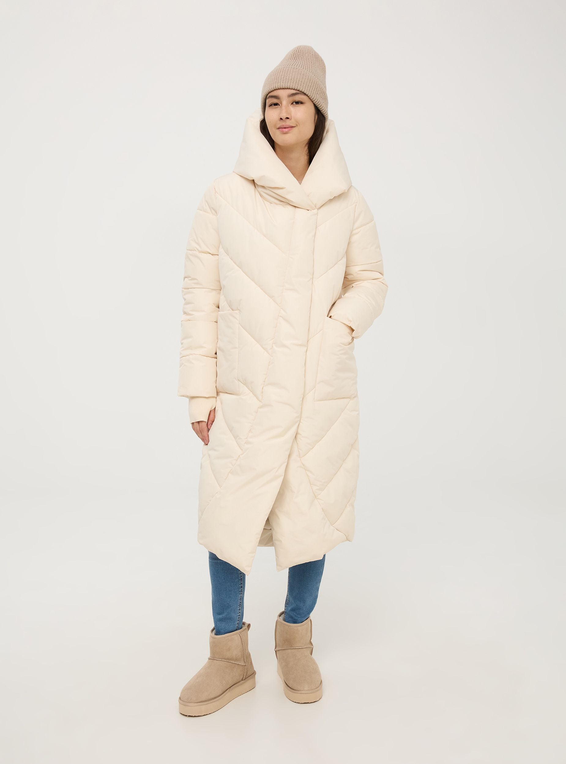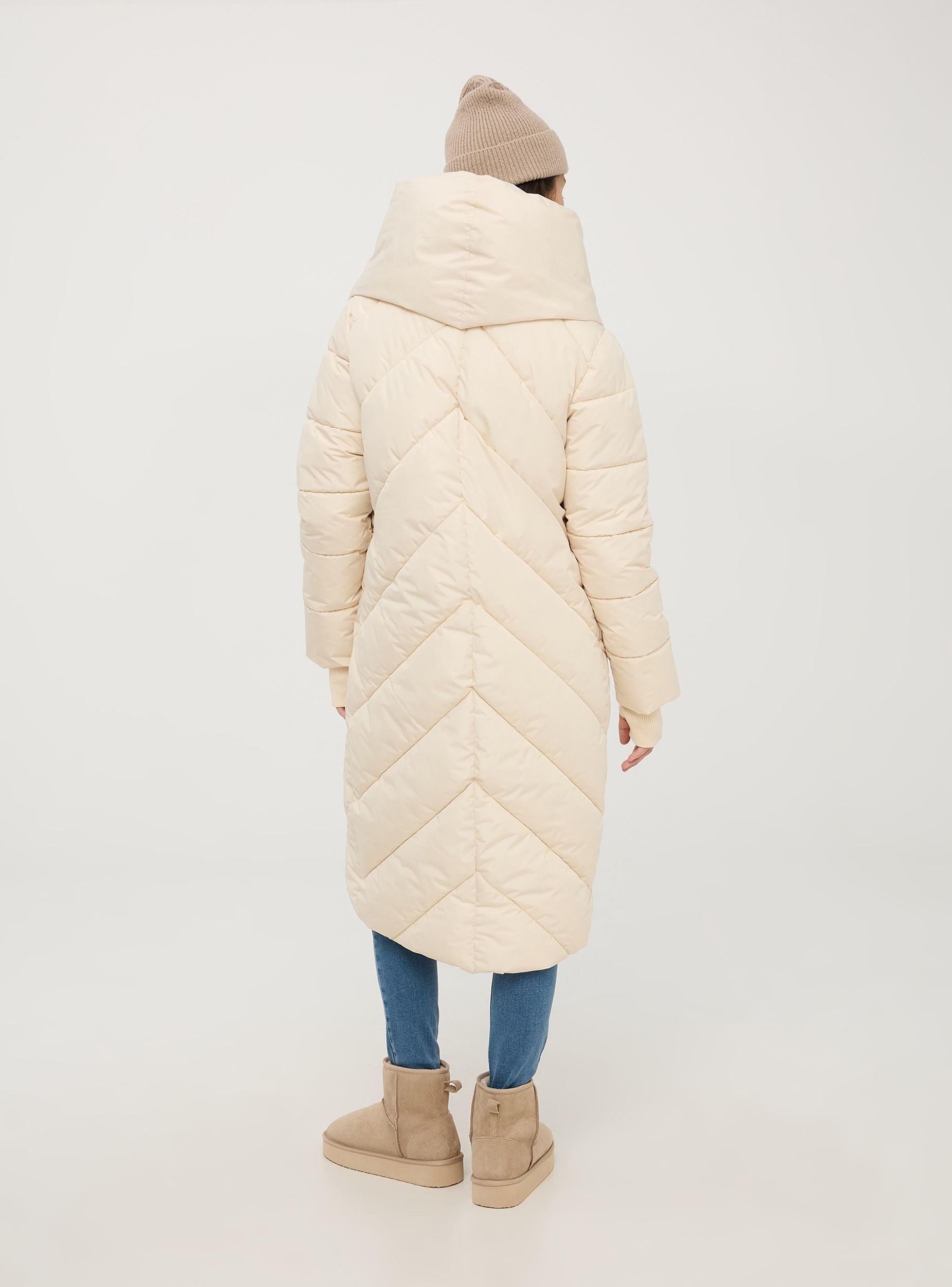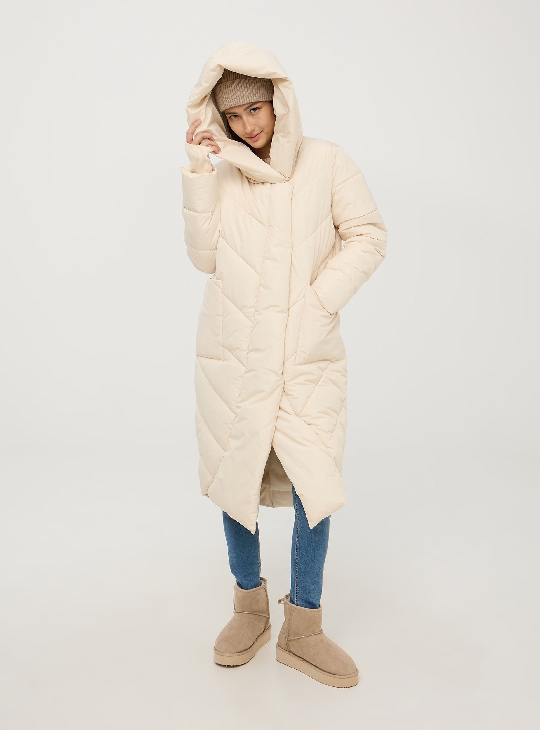 Langer Damen-Nylon-Jacke, charakterisiert durch eine oversized Passform. Verschluss mit verstecktem Reißverschluss und versenkbaren Druckknöpfen. Hergestellt aus gepolstertem Material, verfügt sie über ein gesteppte Design mit Chevron-Muster. Die große Kapuze bietet zusätzlichen Schutz vor Kälte. Die langen Ärmel sind mit elastischen Bündchen ausgestattet, um die Wärme zu halten. Der Mantel hat zwei große aufgesetzte Vordertaschen, die praktisch sind, um essentielle Gegenstände zu verstauen oder die Hände warm zu halten. Ideal für winterliche Tage, kombiniert er Funktionalität und lässigen Stil. Der untere Saum hat einen besonderen Schnitt, der dem Kleidungsstück Einzigartigkeit und Originalität verleiht.Details