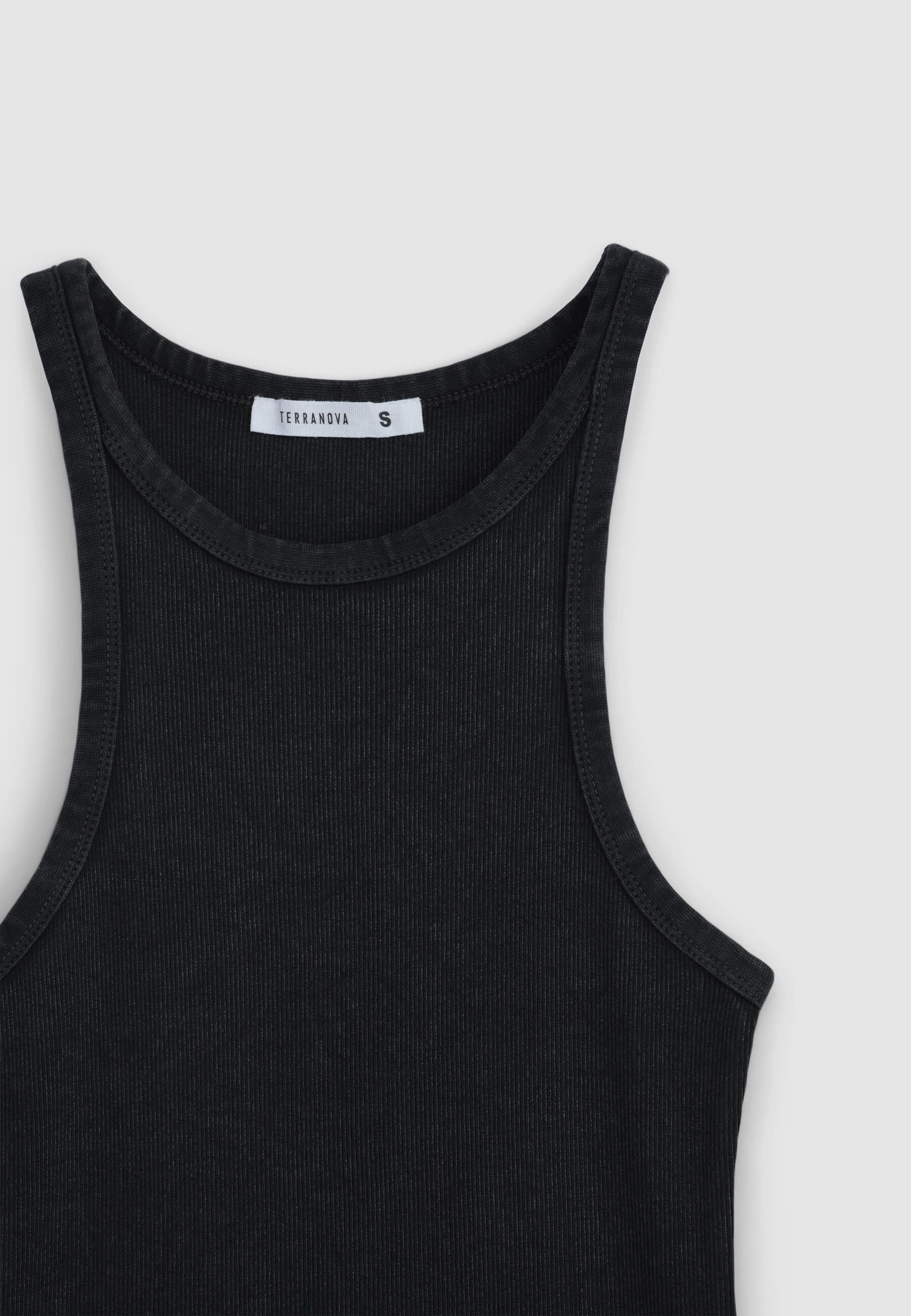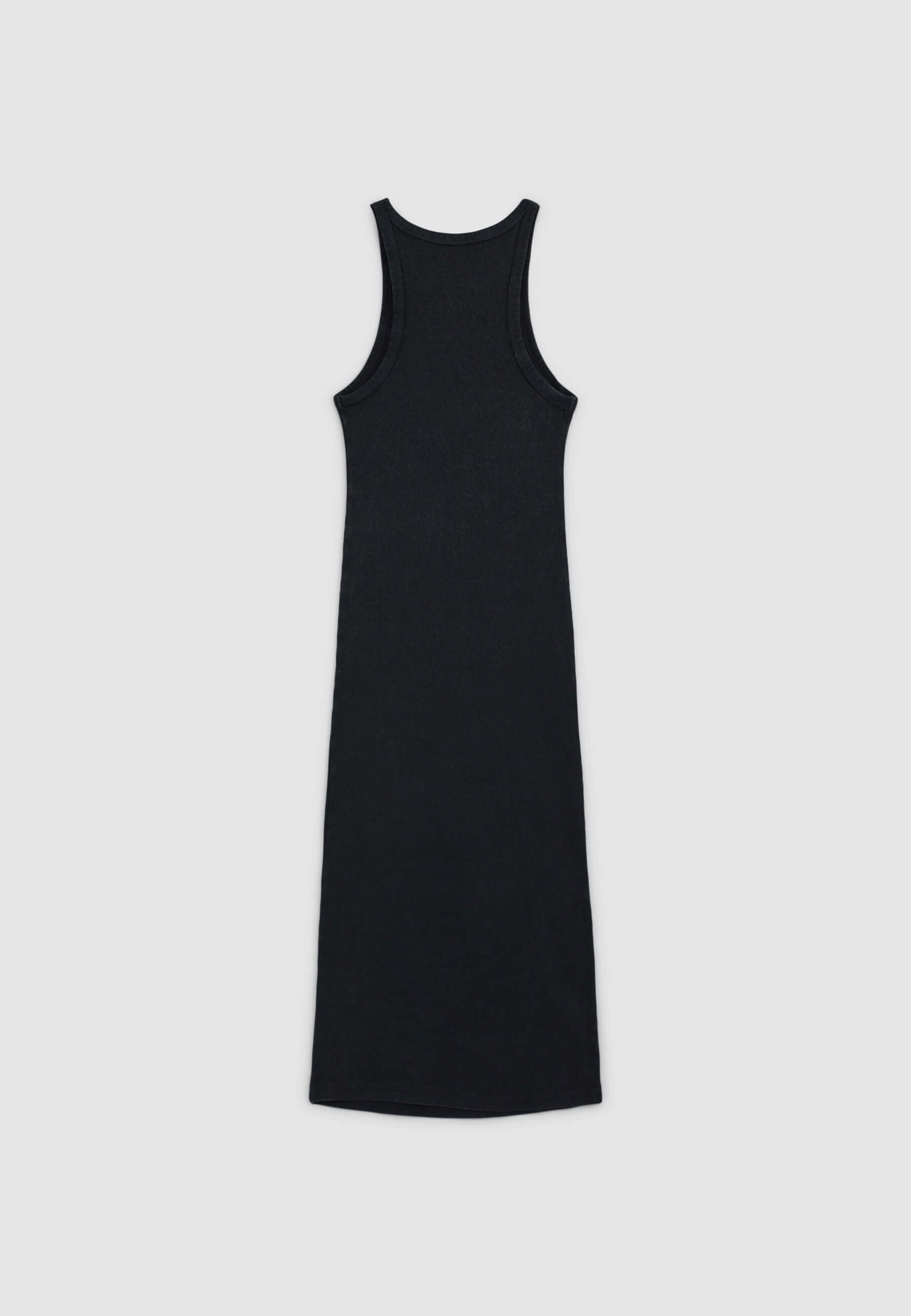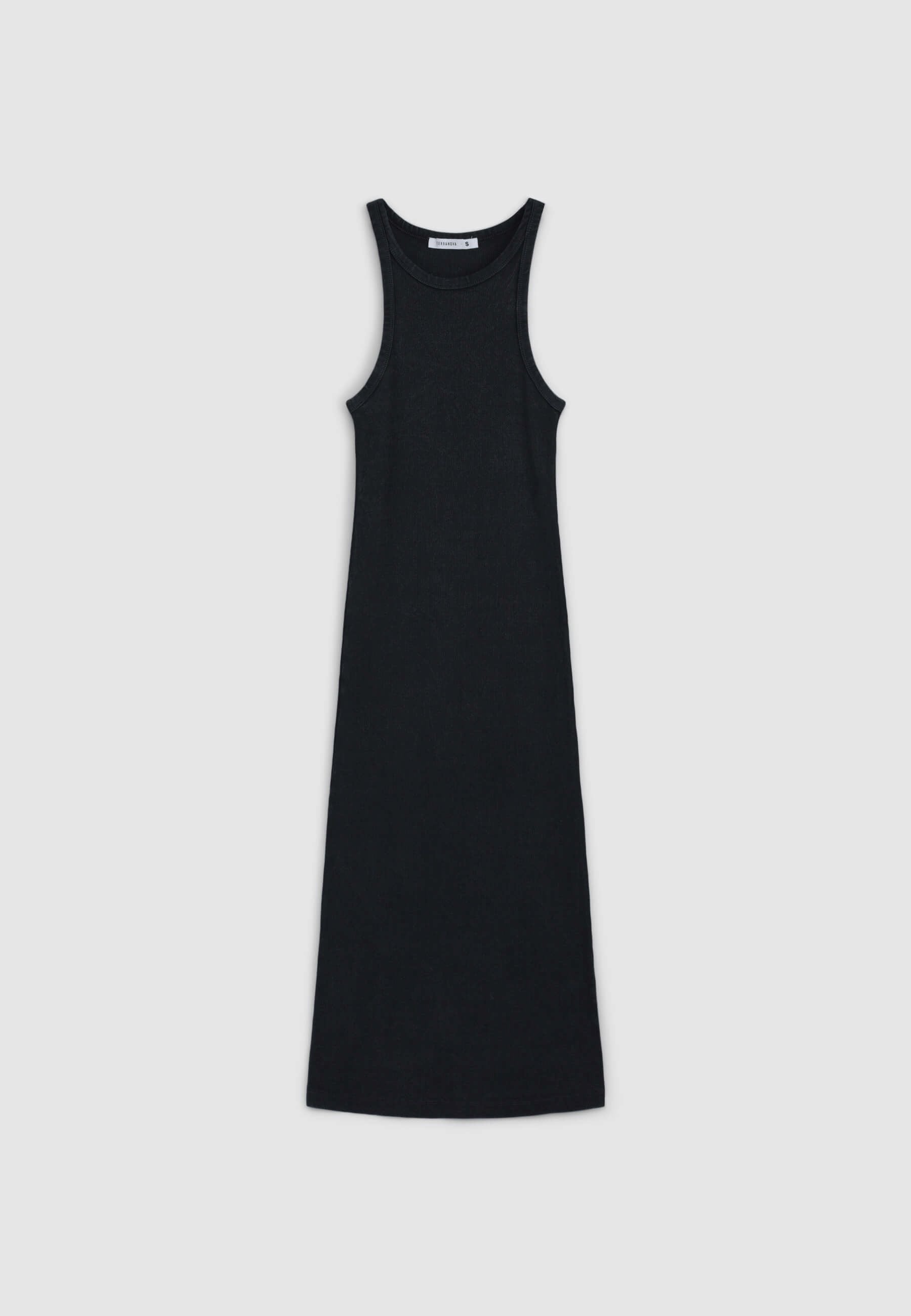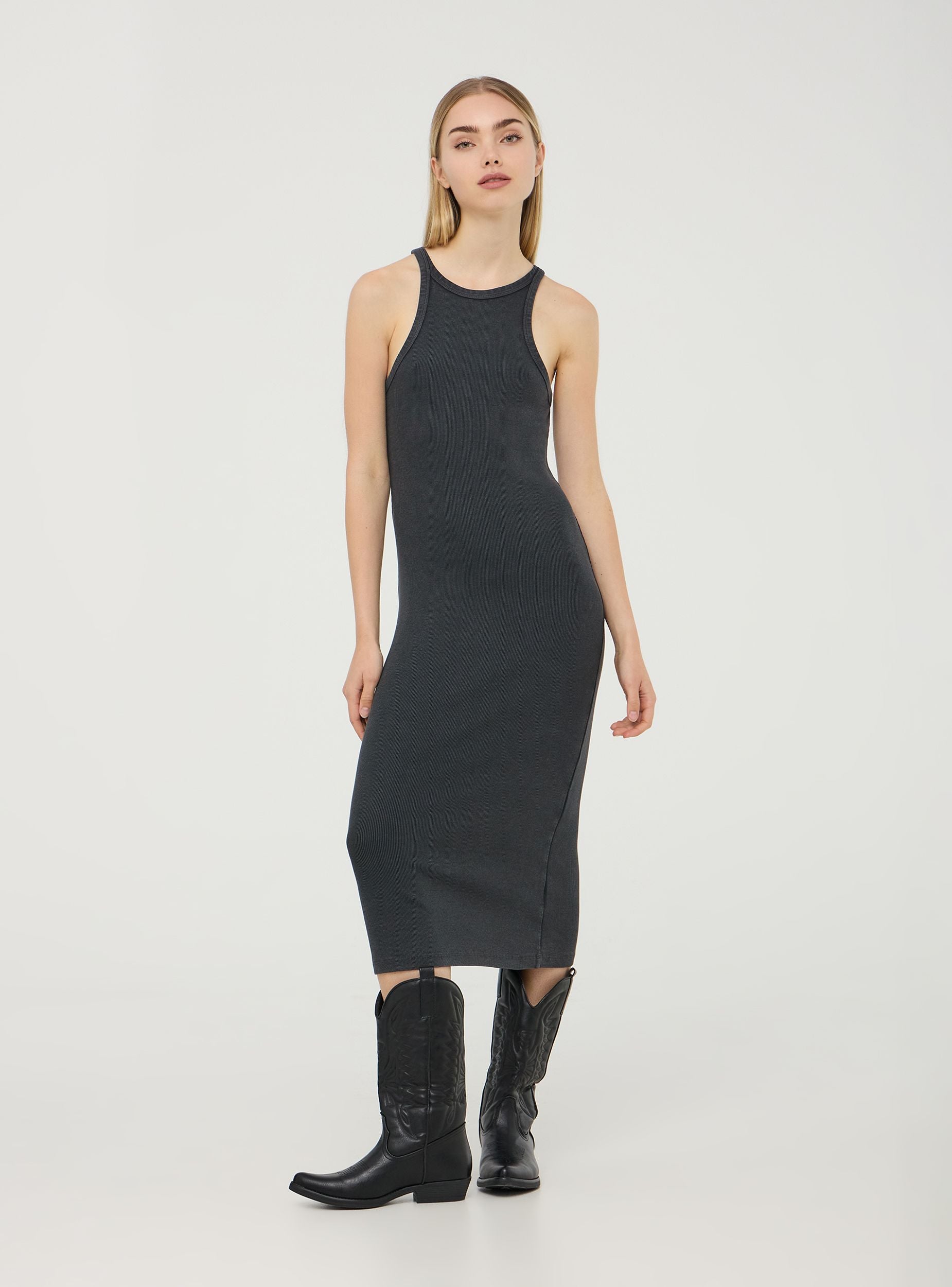 Langes Damenkleid mit einem schlichten, figurbetonten Design, das aus elastischem Rippstoff besteht, der sanft die Körperformen umschmeichelt. Der amerikanische Ausschnitt verleiht einen Hauch von Stil, lässt die Schultern frei und schafft eine klare, raffinierte Linie. Der einfarbige Stoff sorgt für Vielseitigkeit und macht es ideal für sowohl legere als auch formelle Kombinationen. Perfekt für verschiedene Anlässe, zeichnet sich das Kleid durch seine anspruchsvolle Schlichtheit und den Komfort des elastischen Materials aus, das Bewegungsfreiheit und eine optimale Passform garantiert.Details