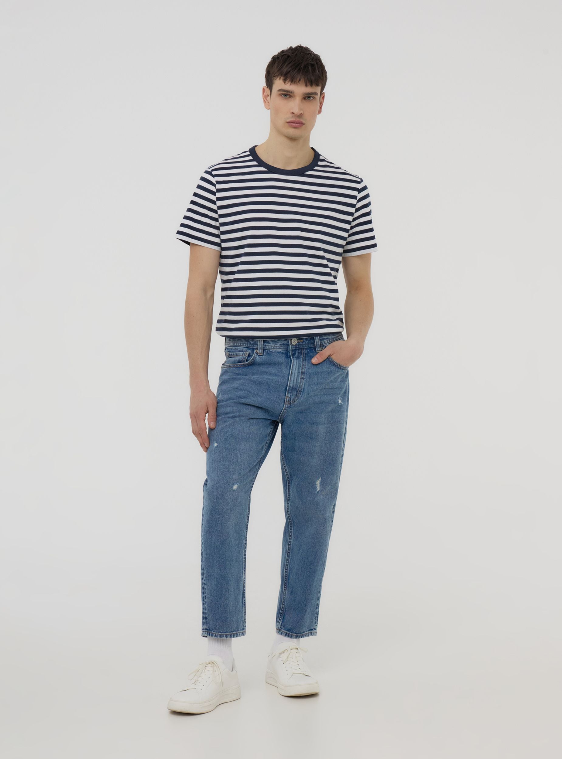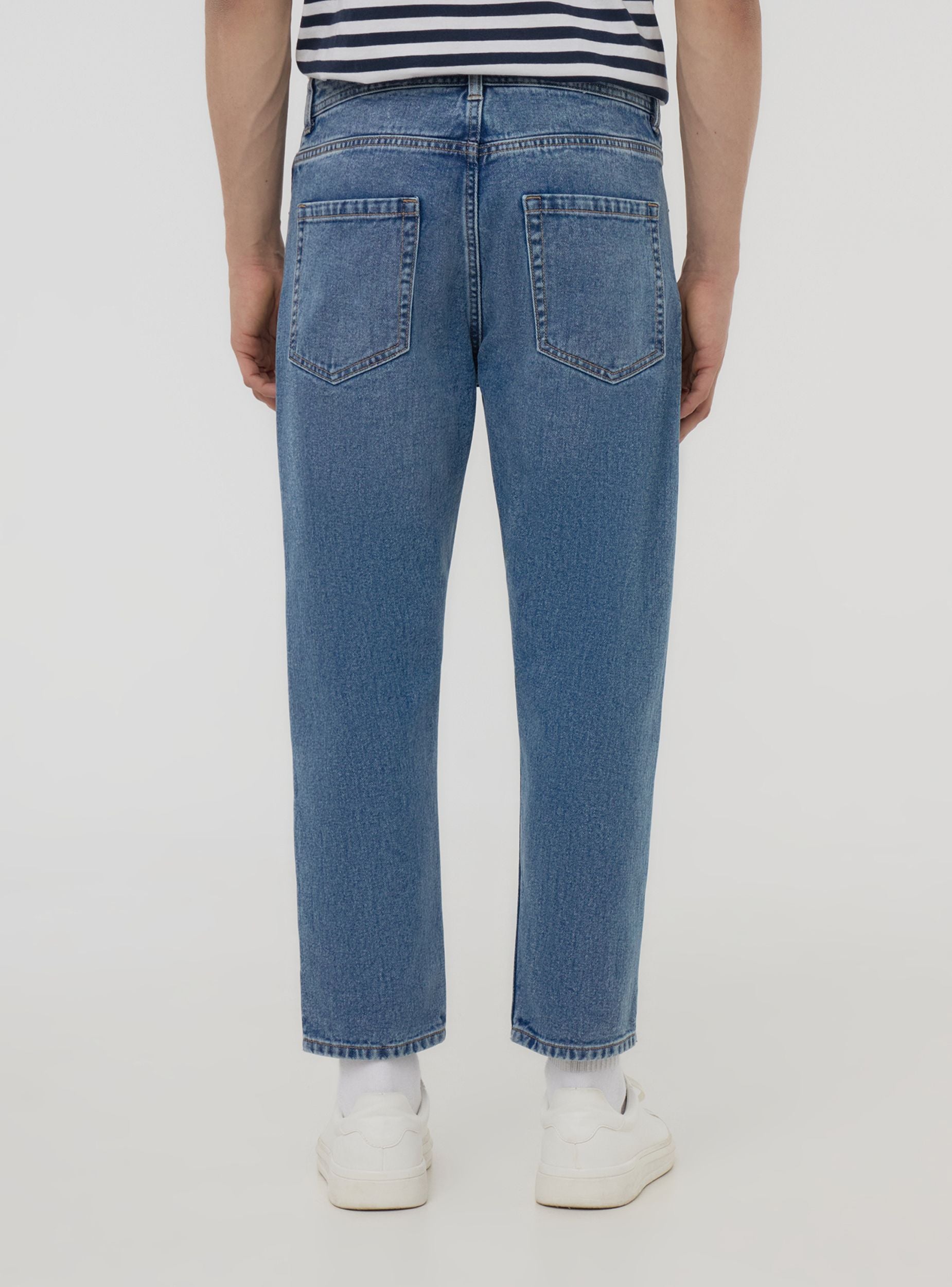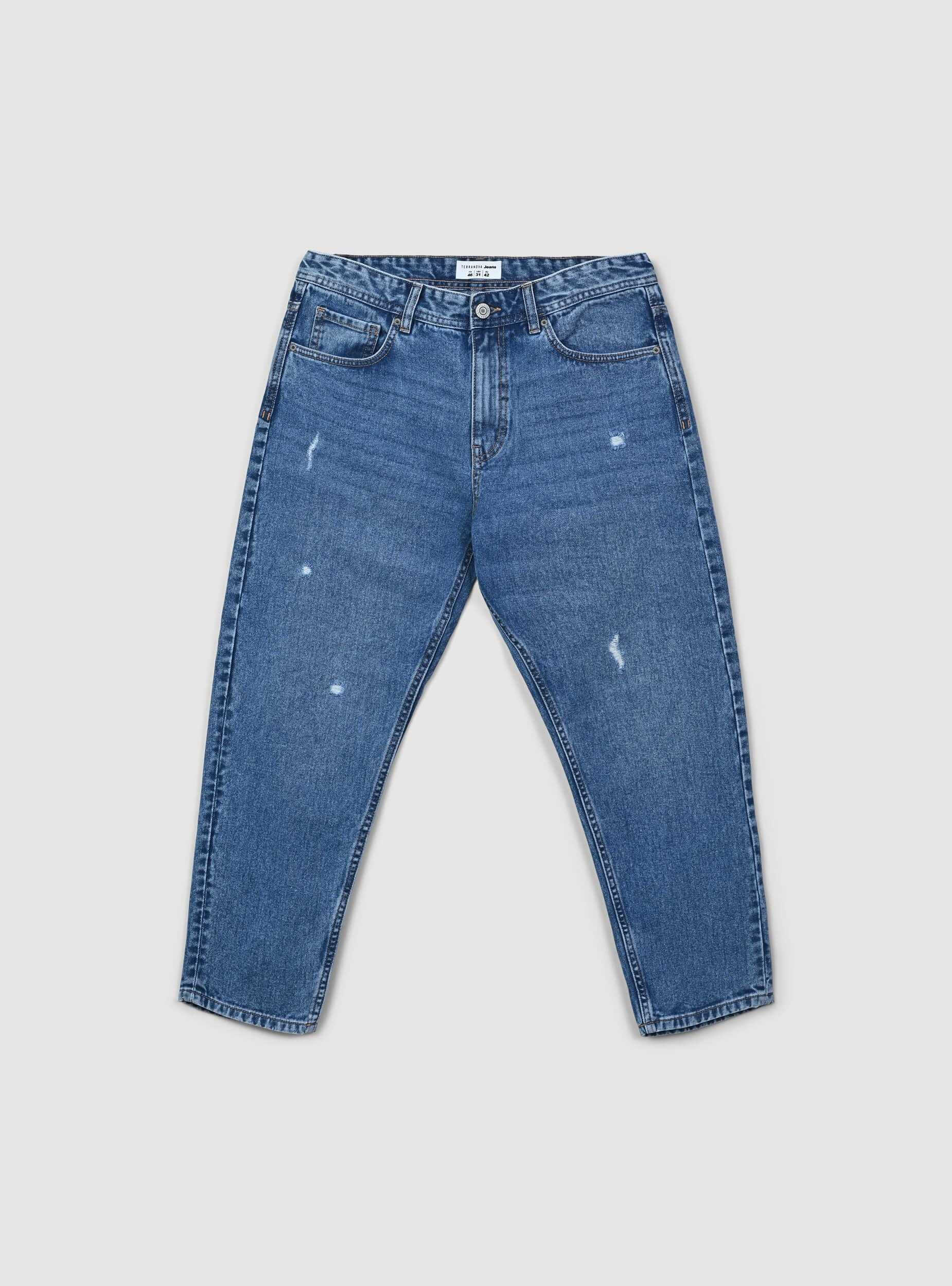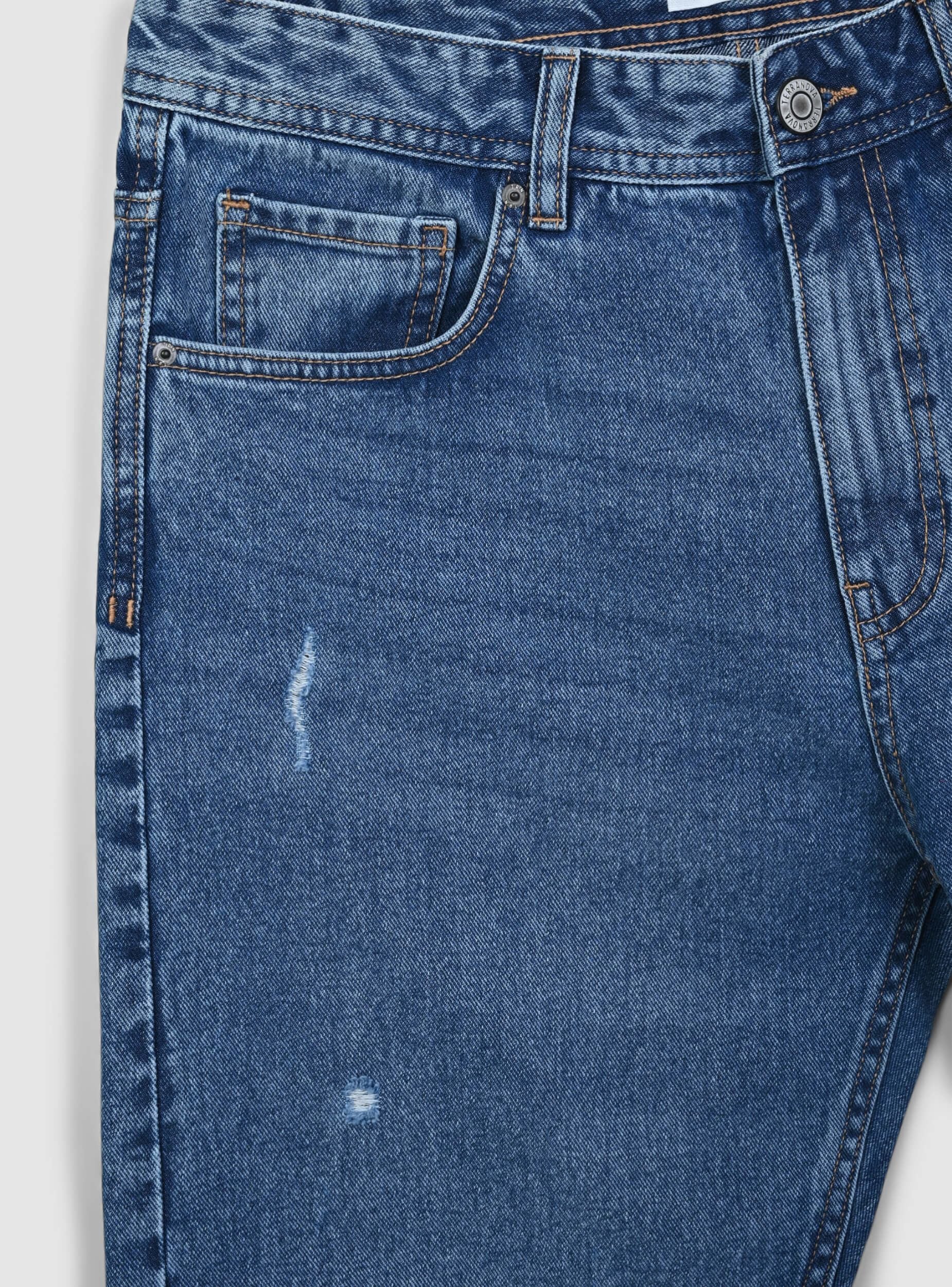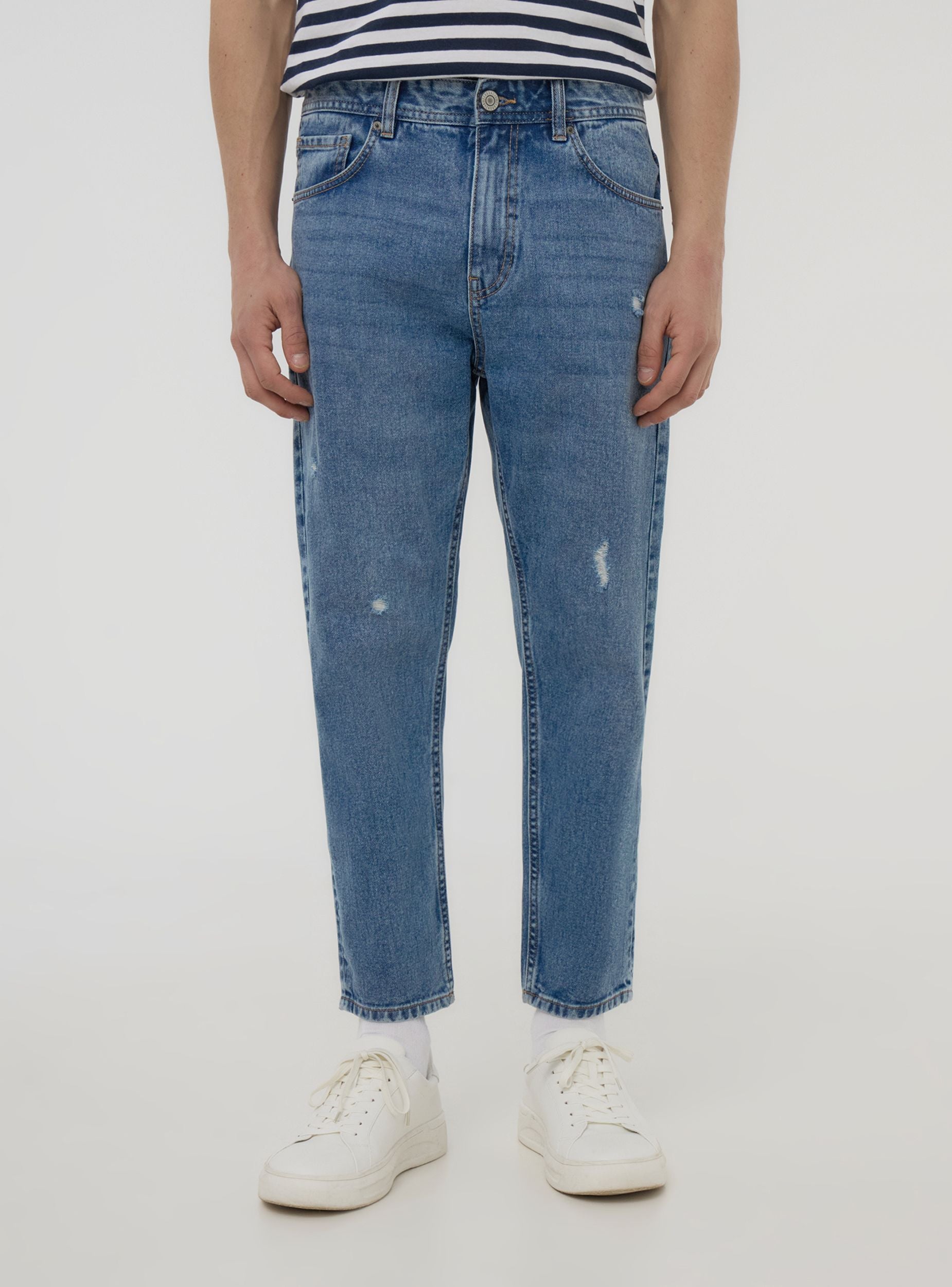 Herren Jeans im Loose-Fit-Schnitt, perfekt für einen lässigen und modernen Look. Sie zeichnen sich durch eine mittelblaue Denim-Waschung und kleine Risse aus, die einen rockigen Touch verleihen. Sie bieten Komfort und Praktikabilität dank der Gürtelschlaufen, dem Knopf- und Reißverschluss sowie den fünf funktionalen Taschen. Ideal in Kombination mit T-Shirts und Sneakers für die Freizeit oder mit einem Hemd und Mokassins für ein urbanes und entspanntes Outfit. Geeignet für informelle Anlässe.Details