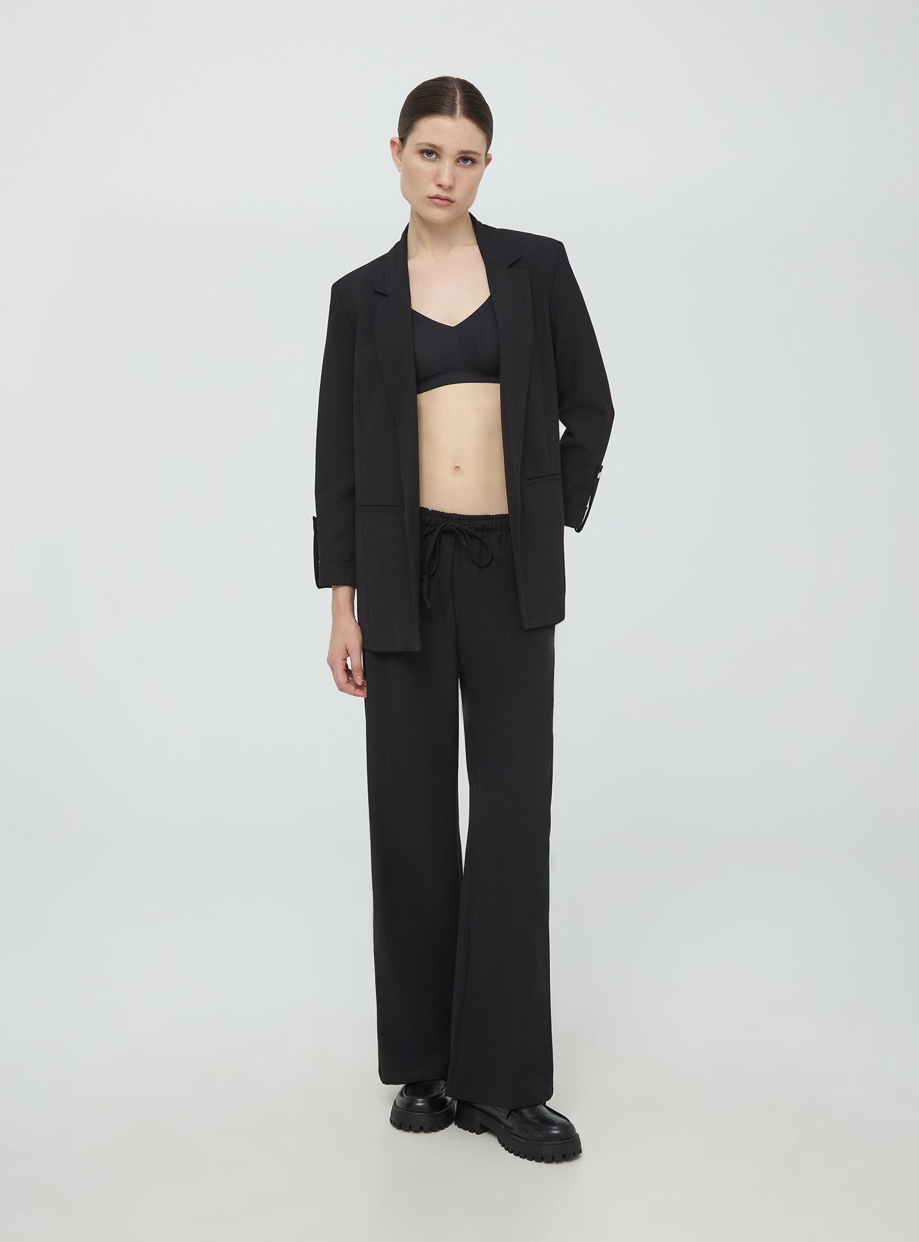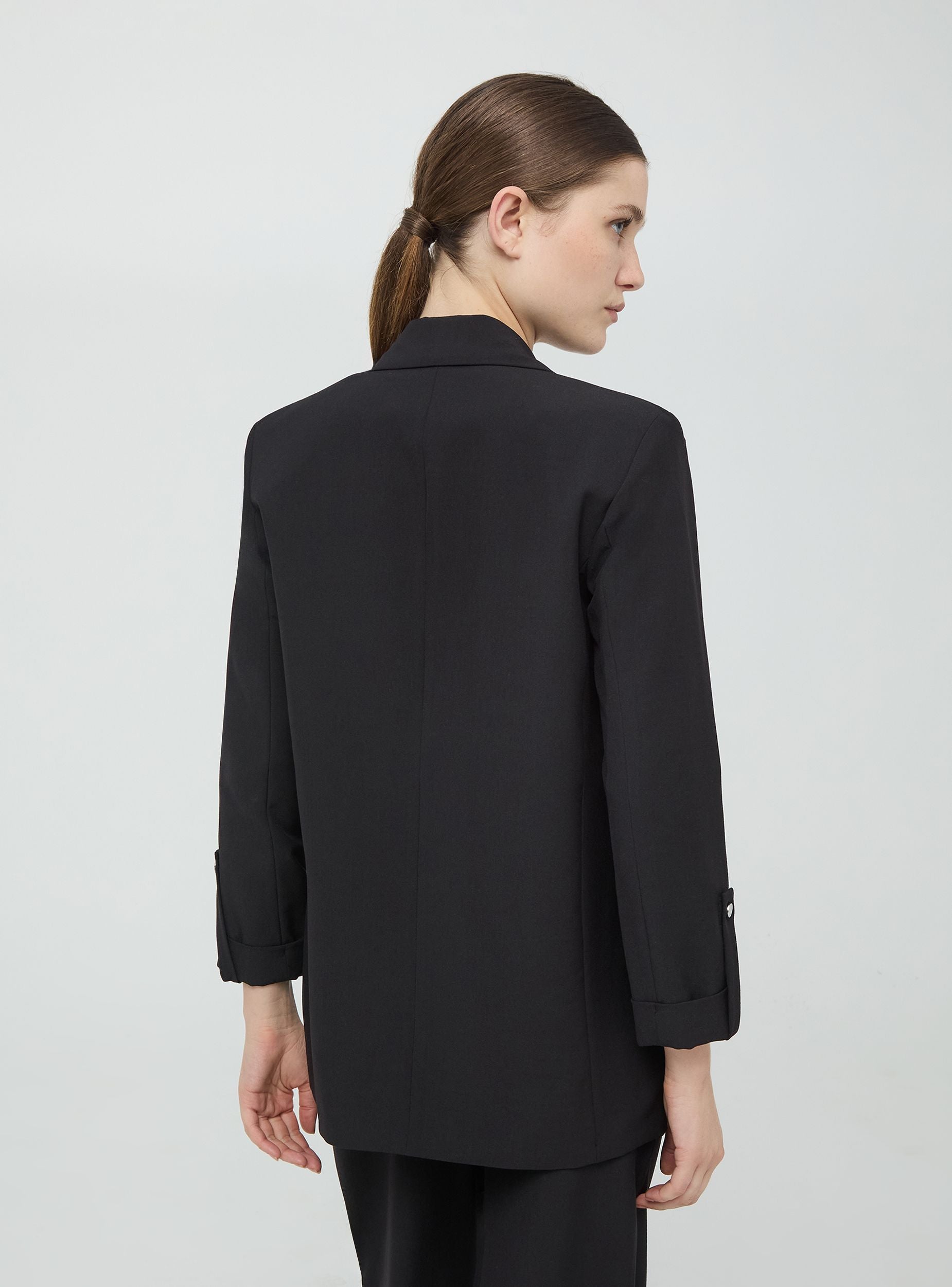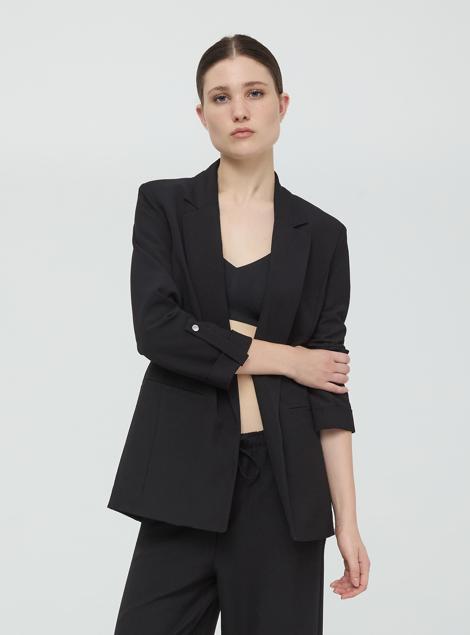 Damenjacke, offenes Blazer-Modell, mit Dreiviertelärmeln und Knopf. Modell mit klassischen Revers, Paspeltaschen, Innenfutter und gepolsterten Schultern. Stoff aus einfarbigem Polyviskose. Basic-Teil, das man im Kleiderschrank haben muss. Lockere Passform.Details