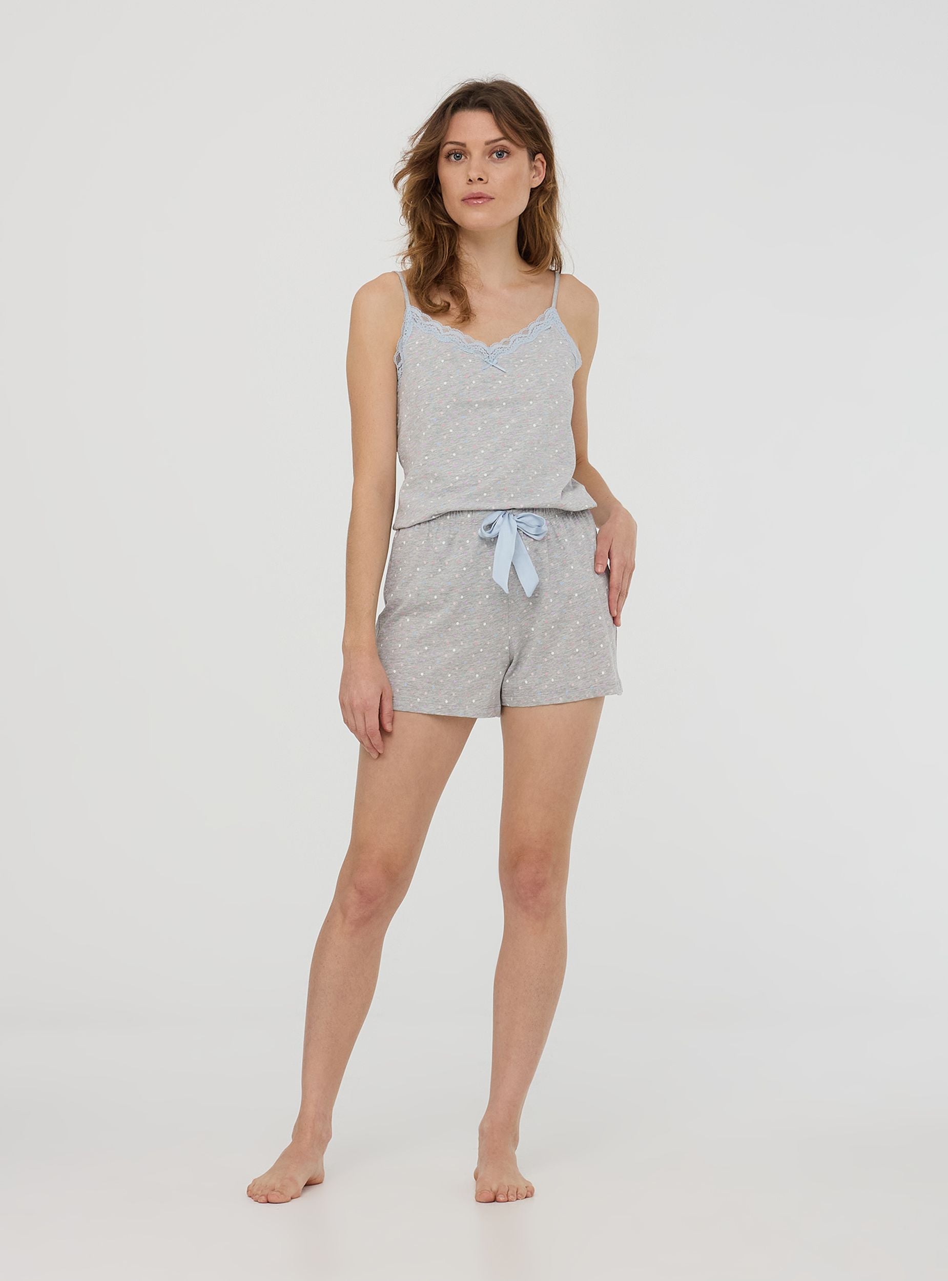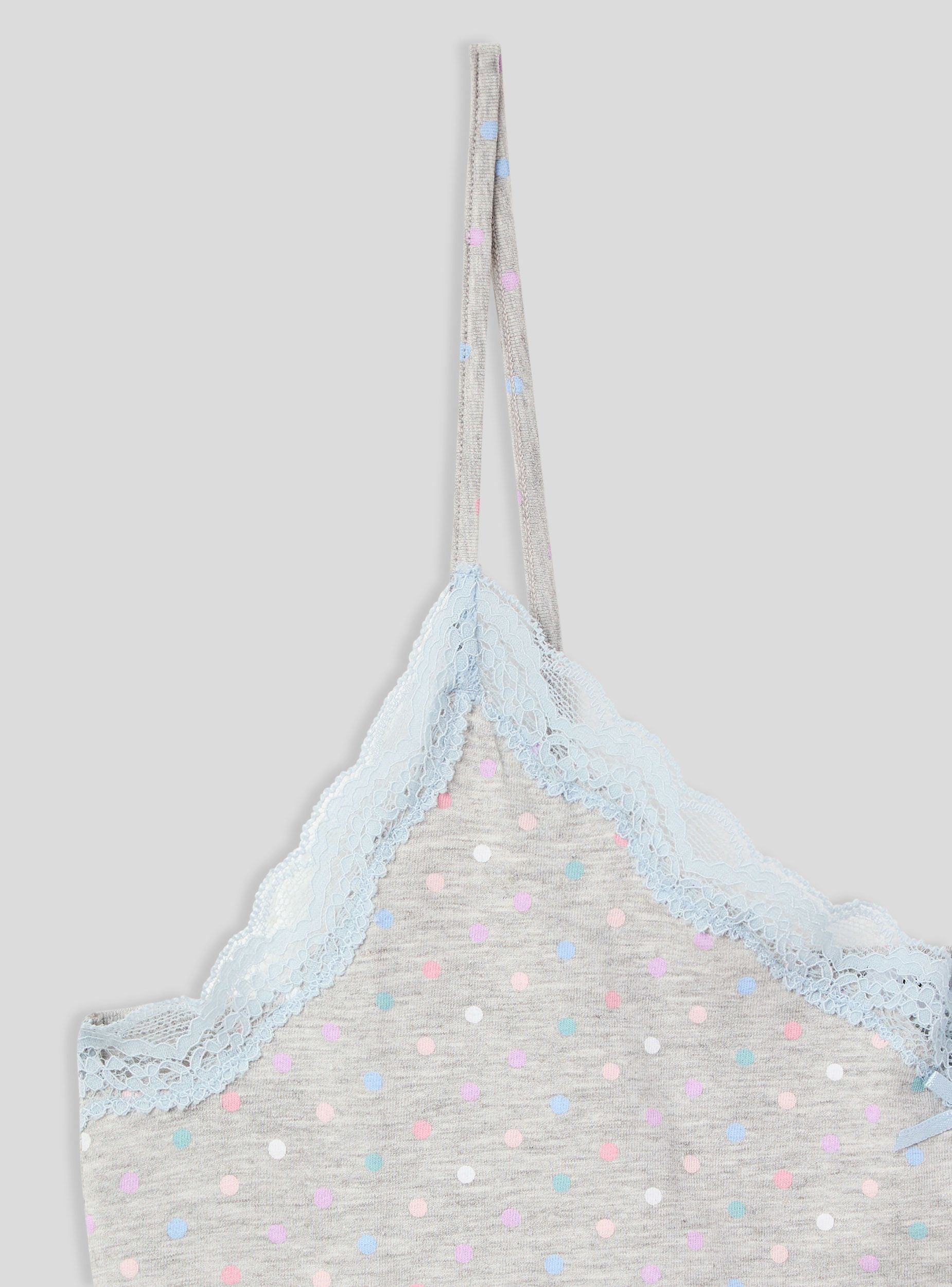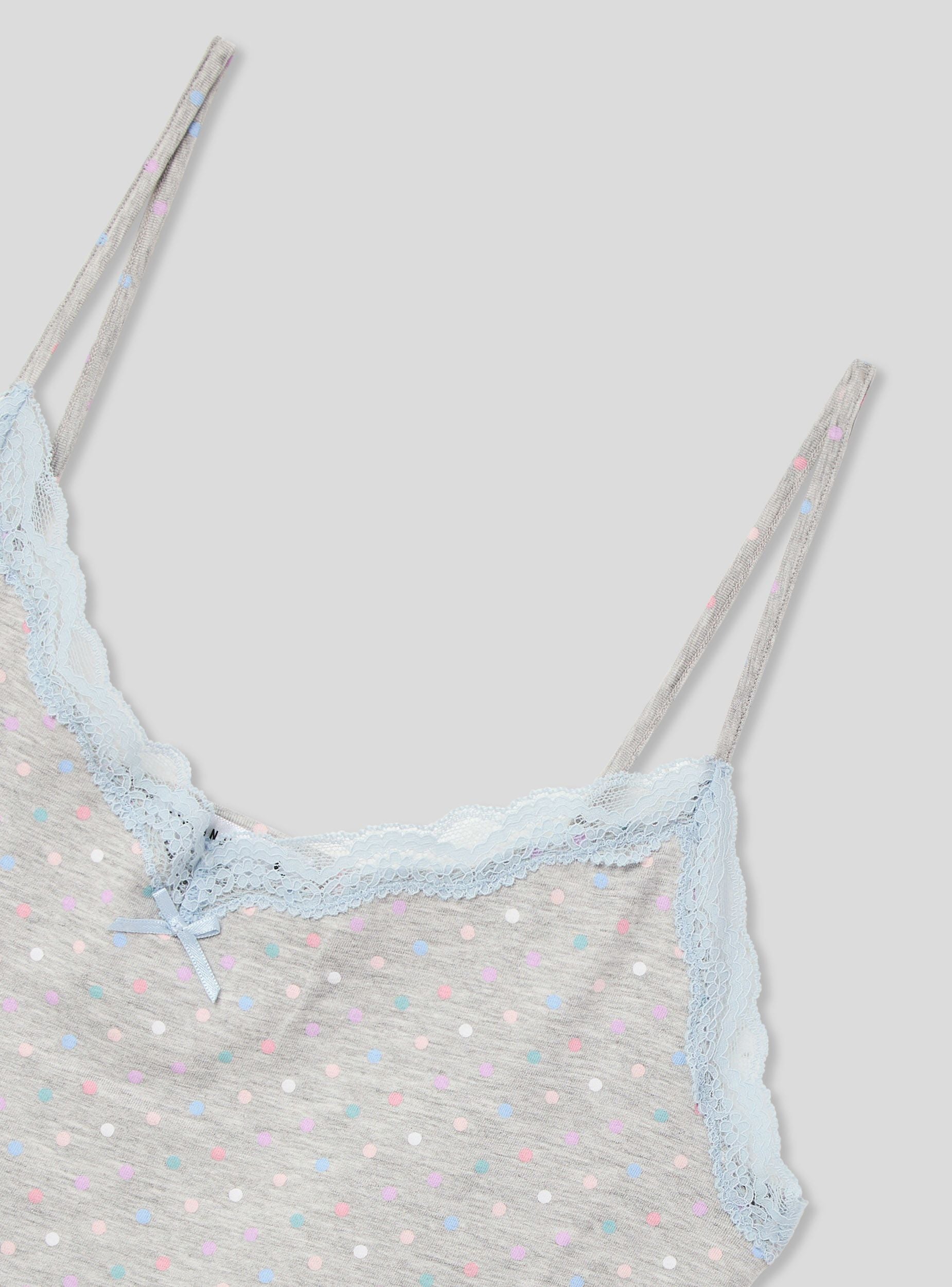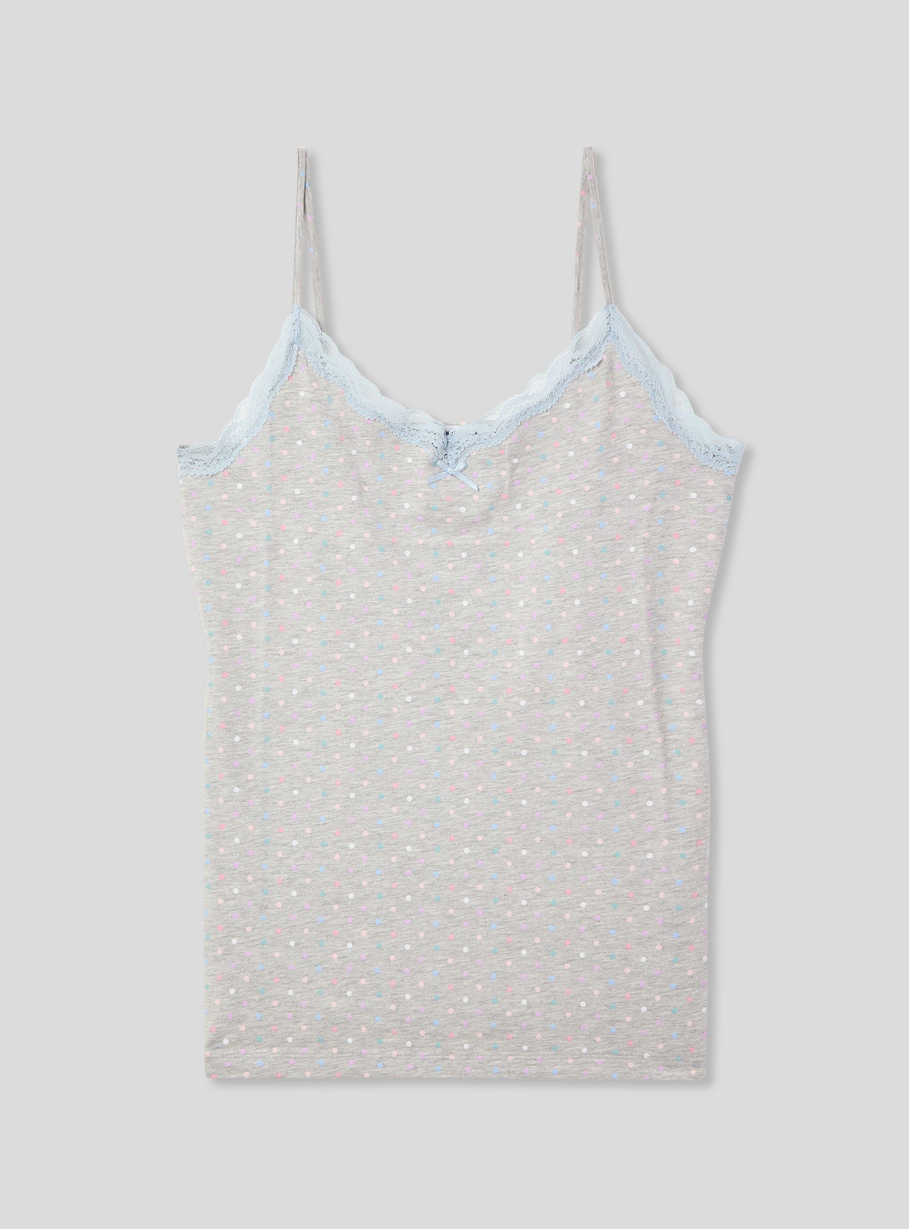 Damenunterhemd, perfekt um deinem Wäscheschrank einen femininen Touch zu verleihen. Es zeichnet sich durch einen eleganten Punkte-Druck, Spitzenakzente am Ausschnitt, eine dekorative Schleife und dünne Träger aus und ist ideal für entspannte Momente oder um es unter leichten Kleidungsstücken für einen eleganten und bequemen Look zu tragen.Details