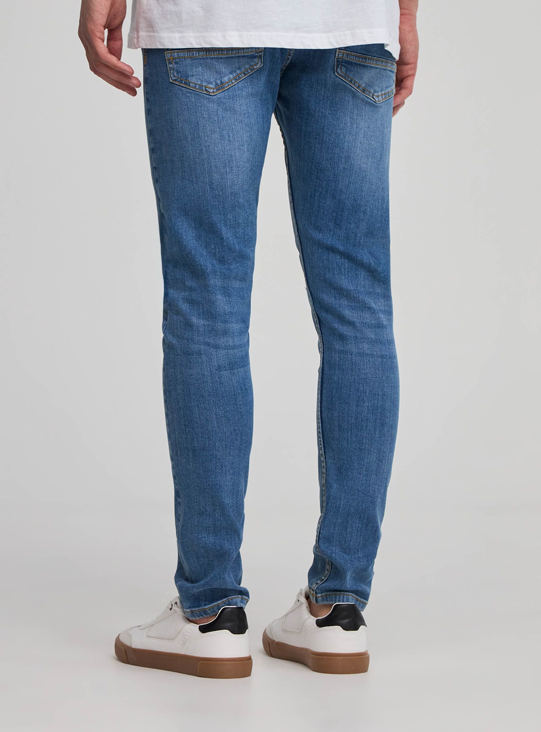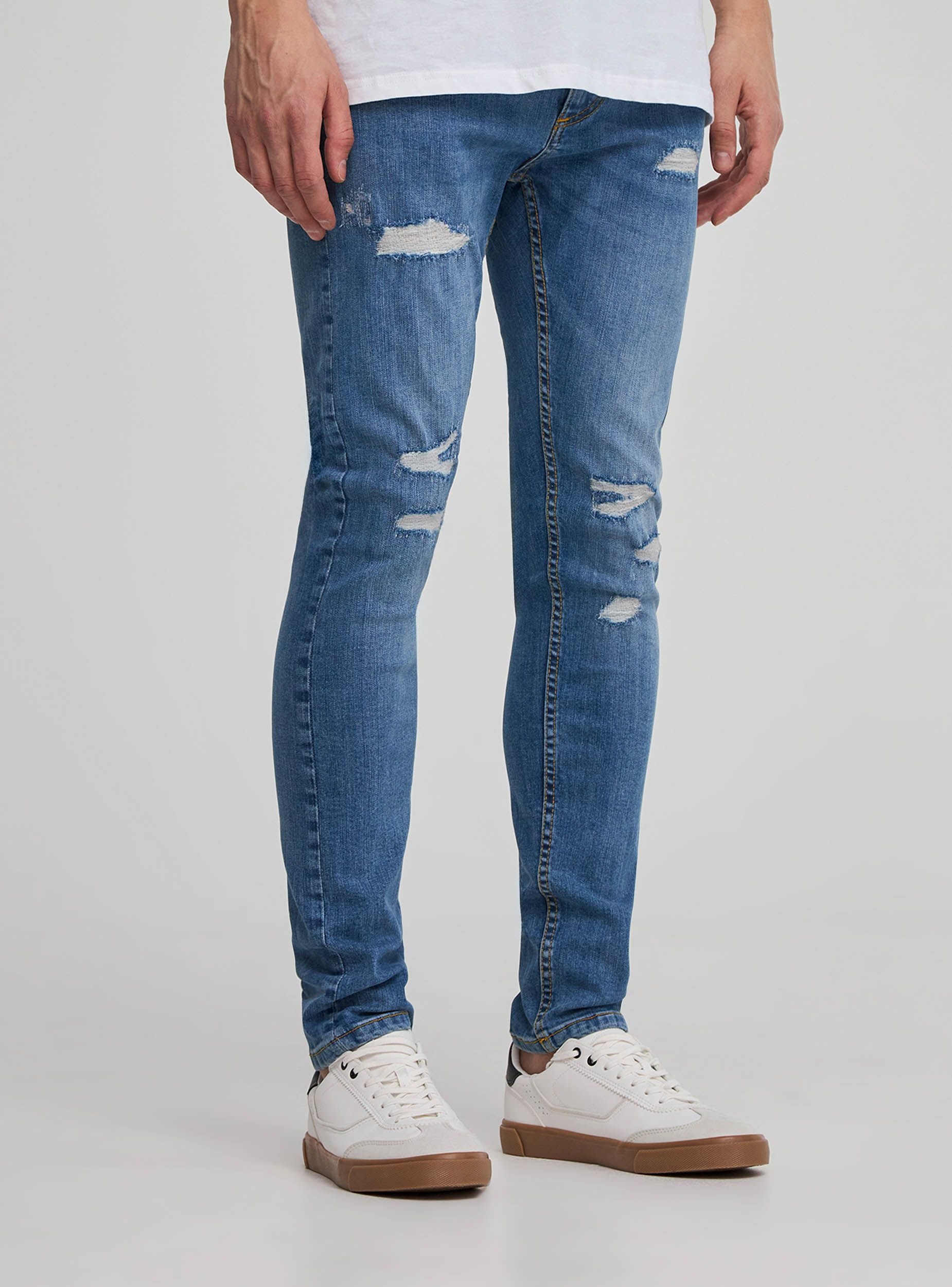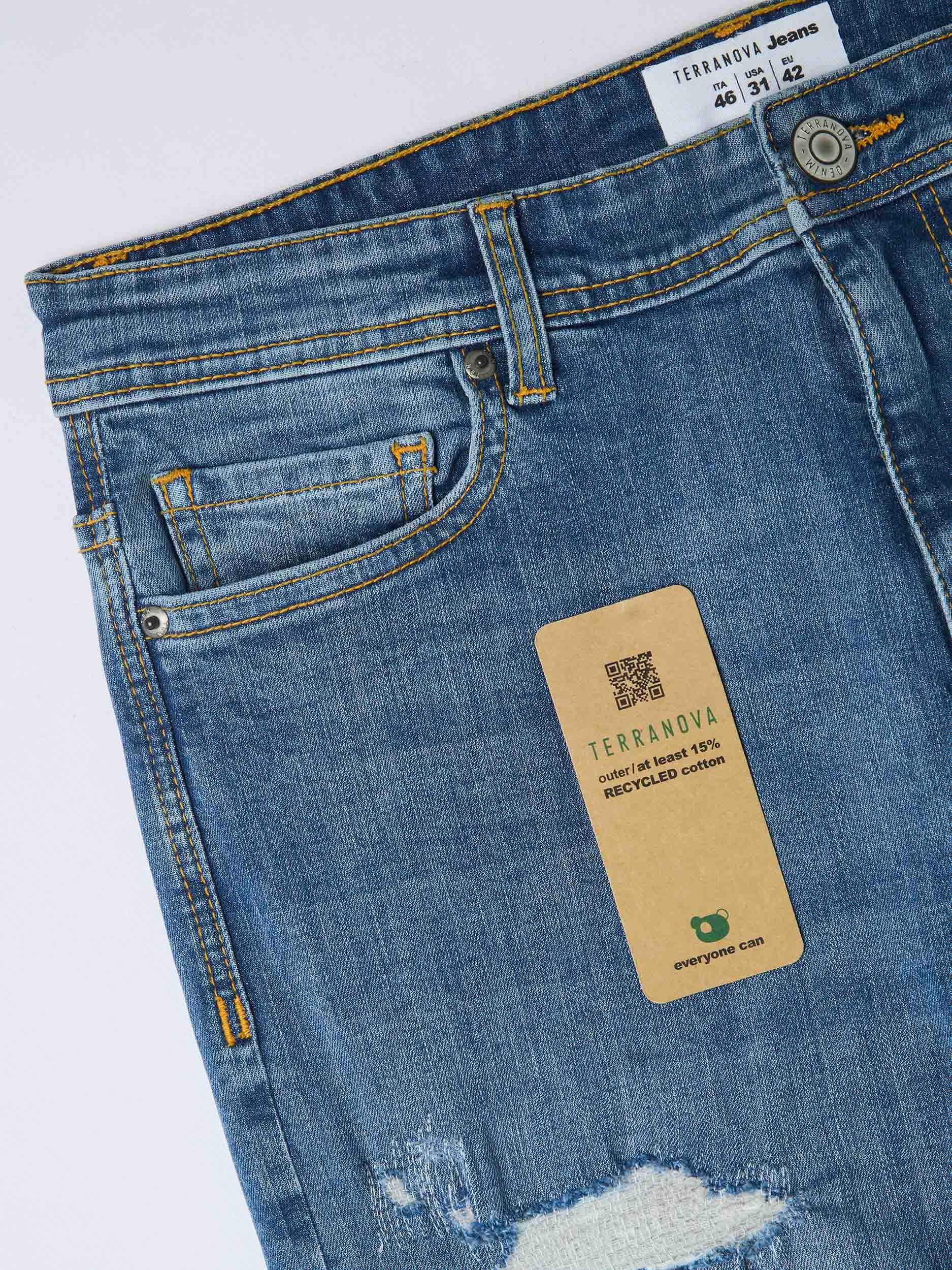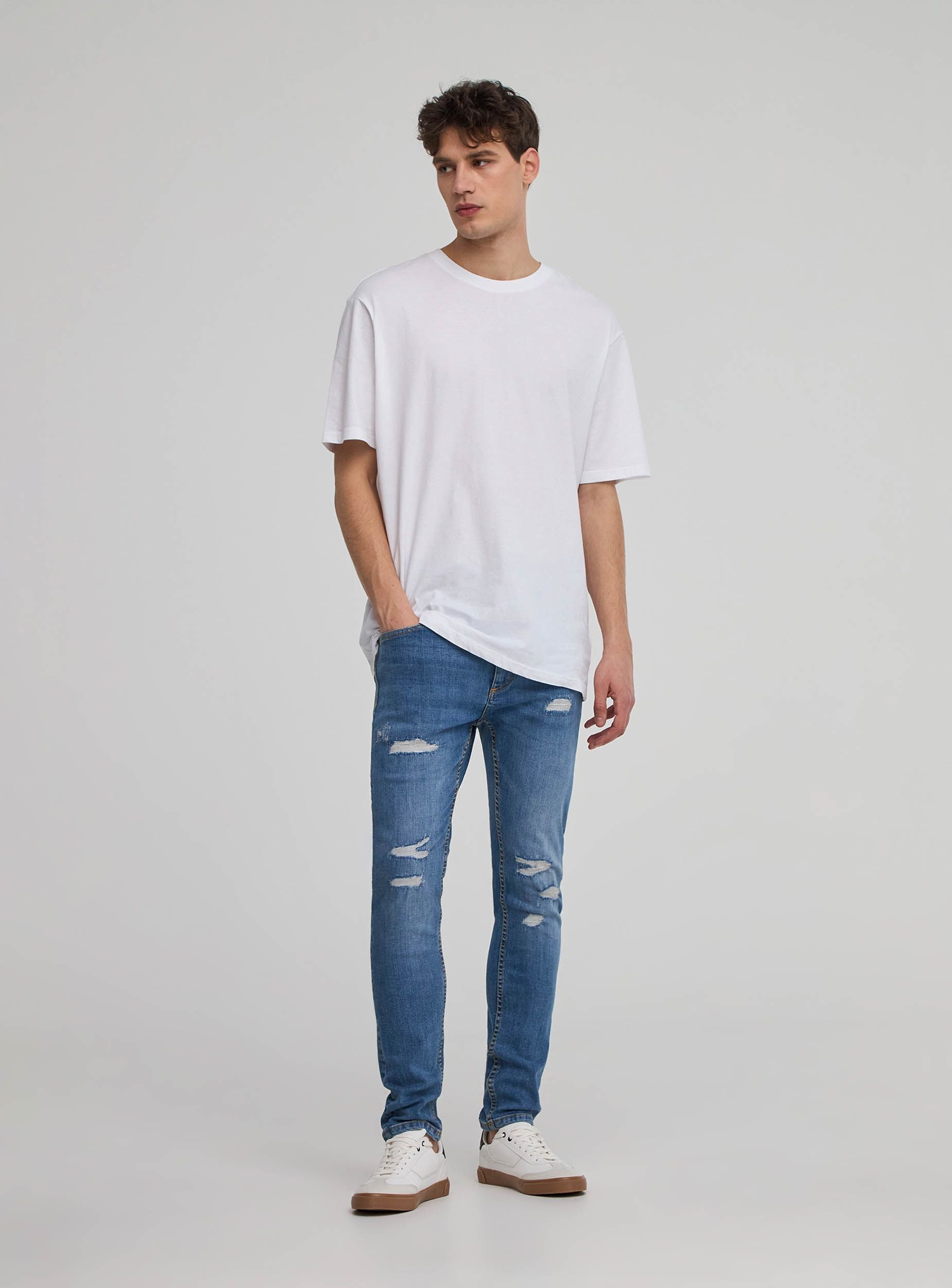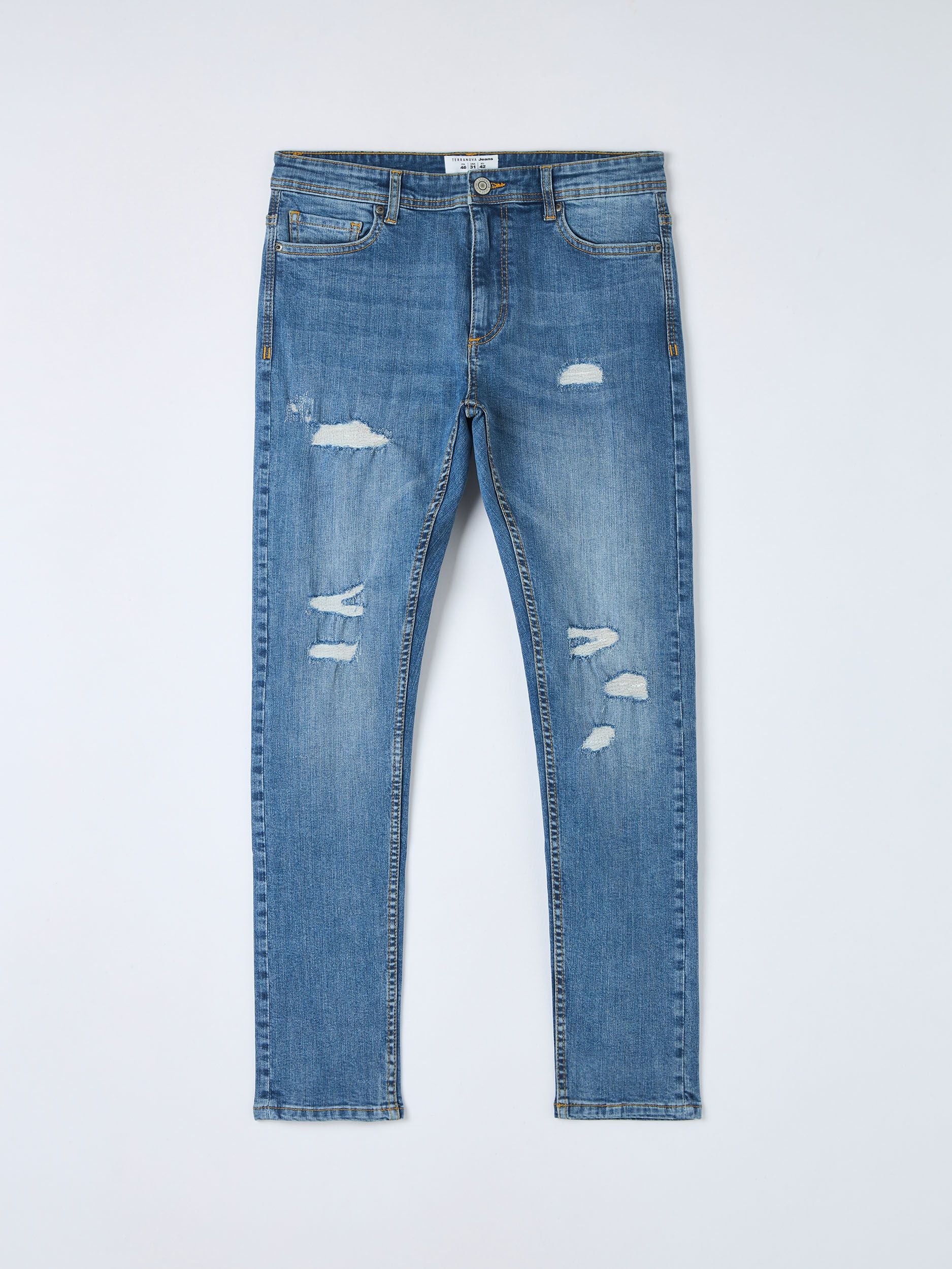 Herrenjeans mit Rissen. 5 Taschen, Reißverschluss und Knopfverschluss. Mittelblaue Denim-Wäsche. Enganliegende Passform.