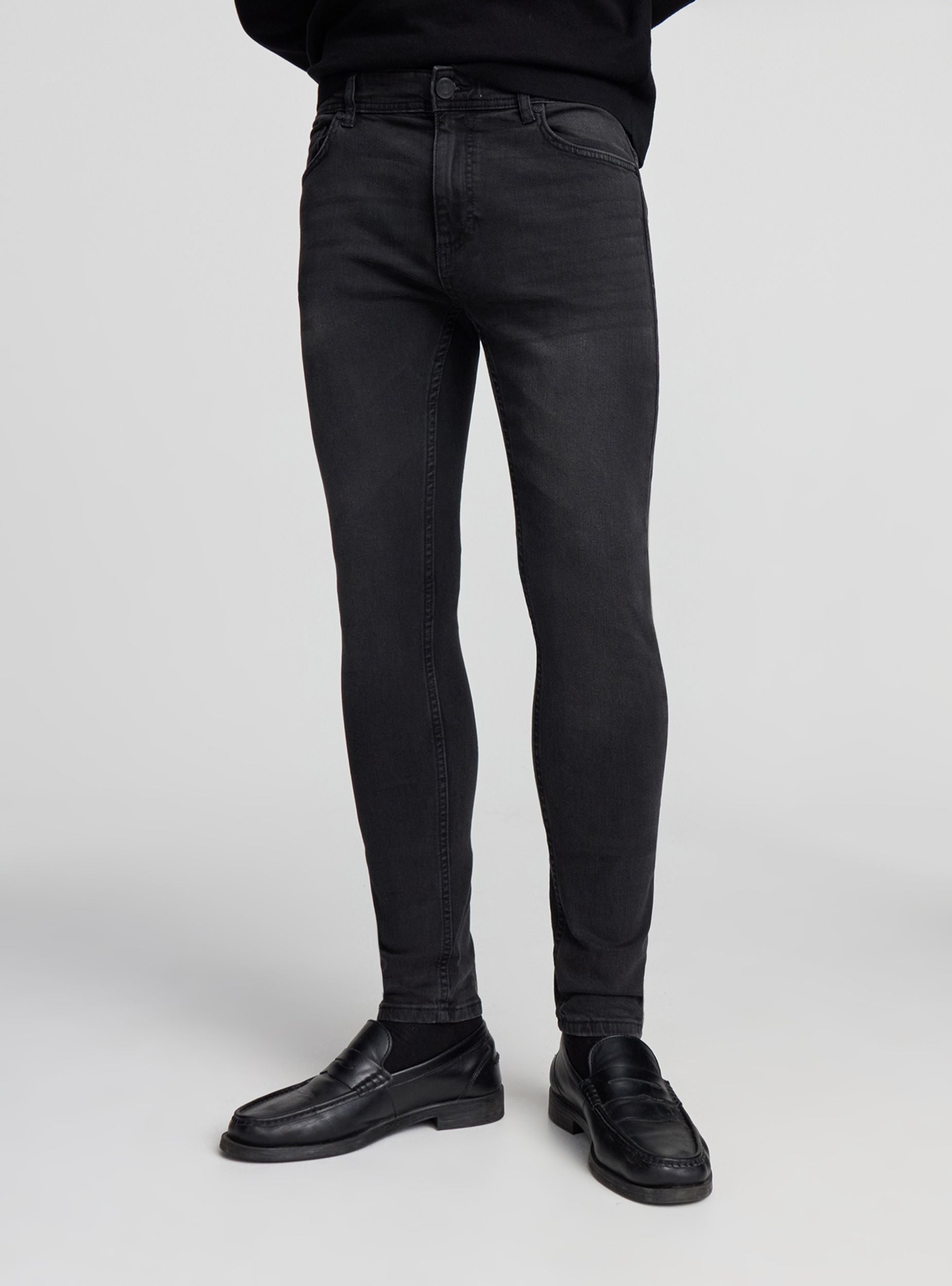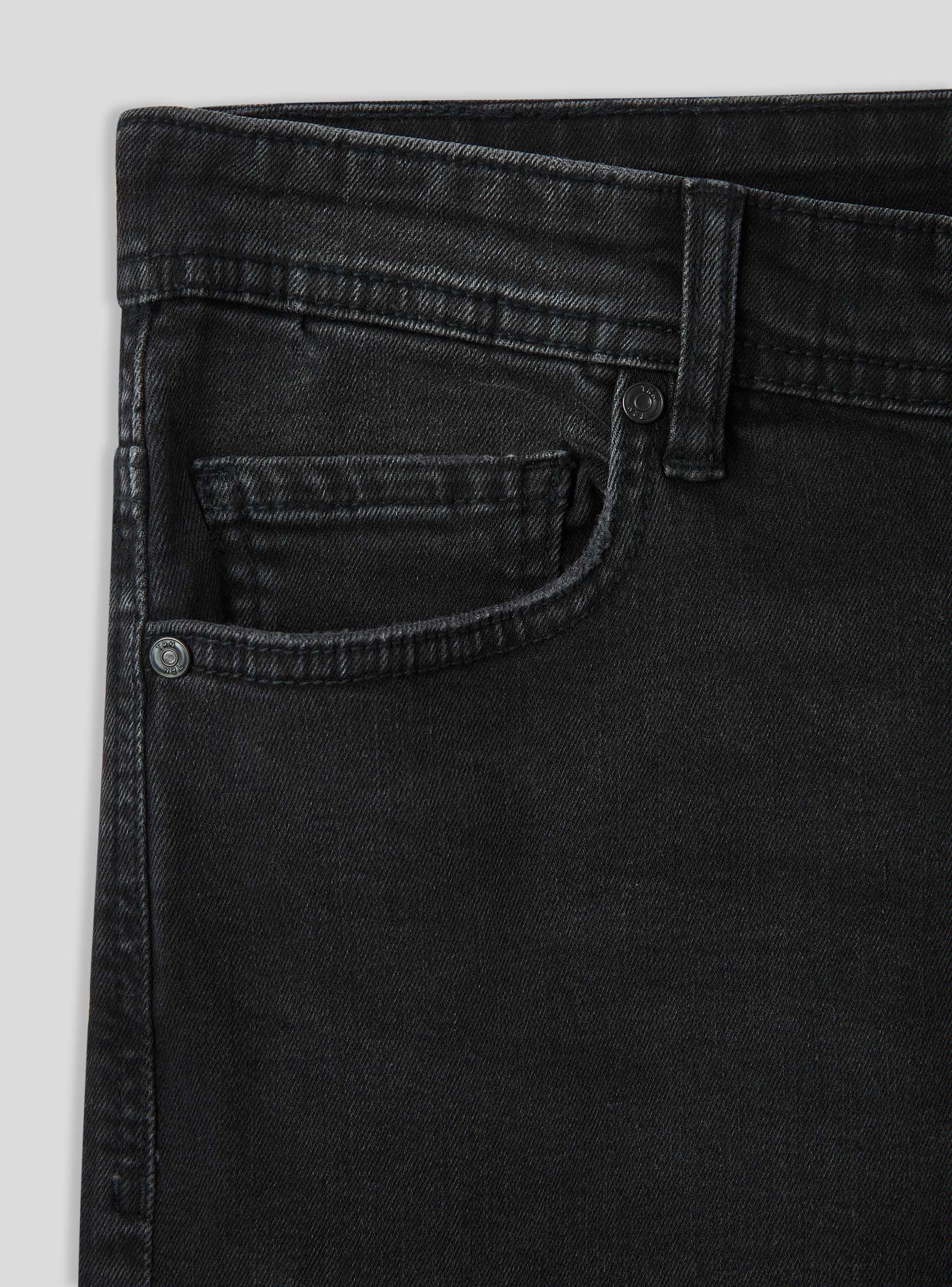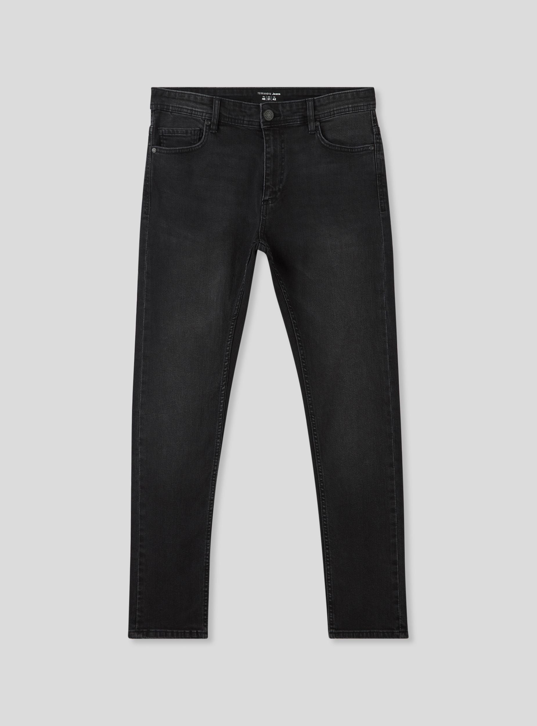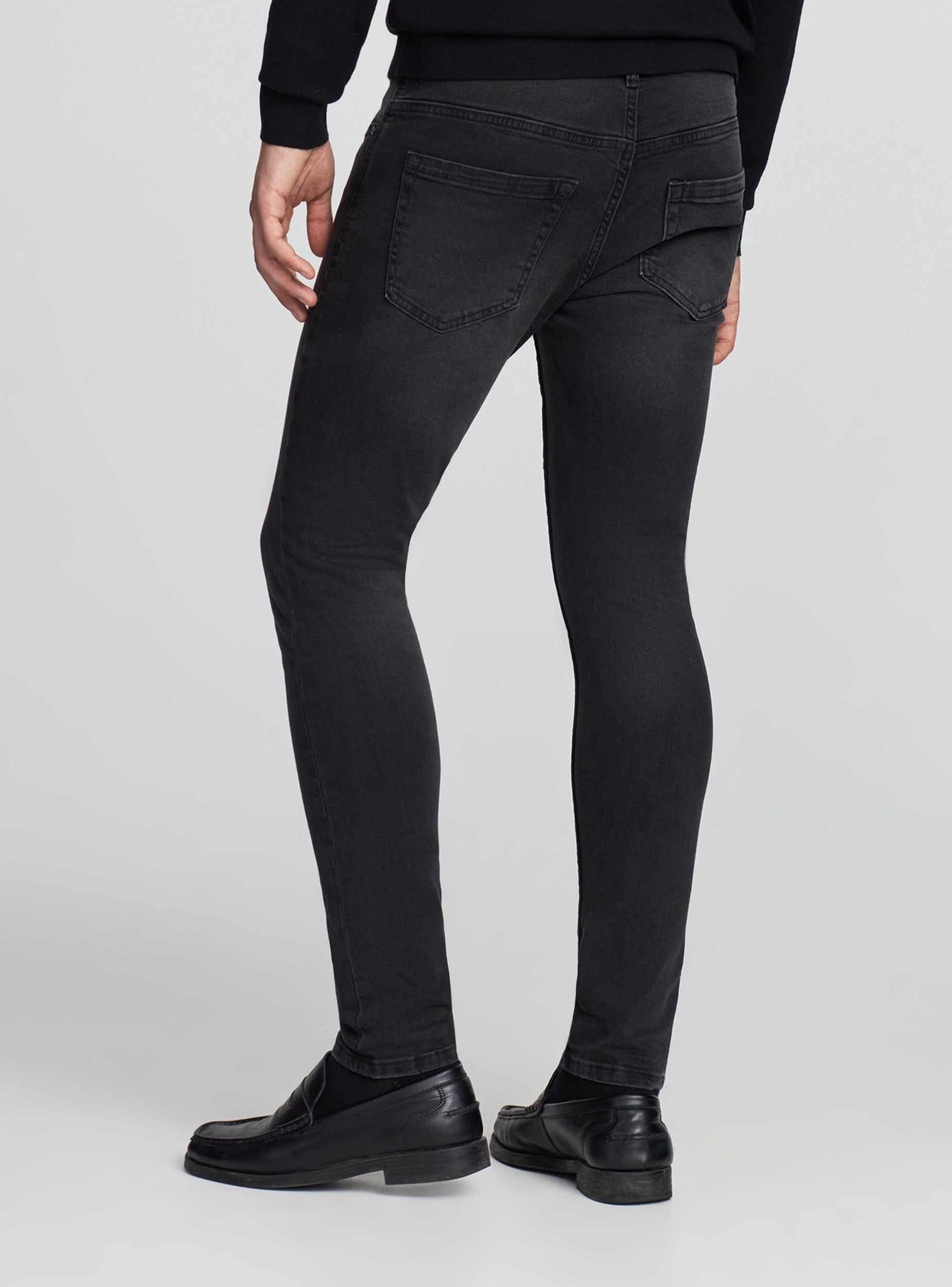 Herrenjeans im Skinny-Fit aus leicht dehnbarem schwarzem Baumwolldenim, der Komfort und Strapazierfähigkeit bietet. Sie verfügen über einen Reißverschluss und Knopf sowie fünf praktische Taschen. Die Passform ist bequem und eignet sich sowohl für den alltäglichen Alltag als auch für halbformelle Anlässe. Ein unverzichtbares Kleidungsstück in der Garderobe eines jeden Mannes. Dieses Stück verfügt über eine leicht ausgewaschene Oberfläche für einen modernen, lebendigen Look.Details