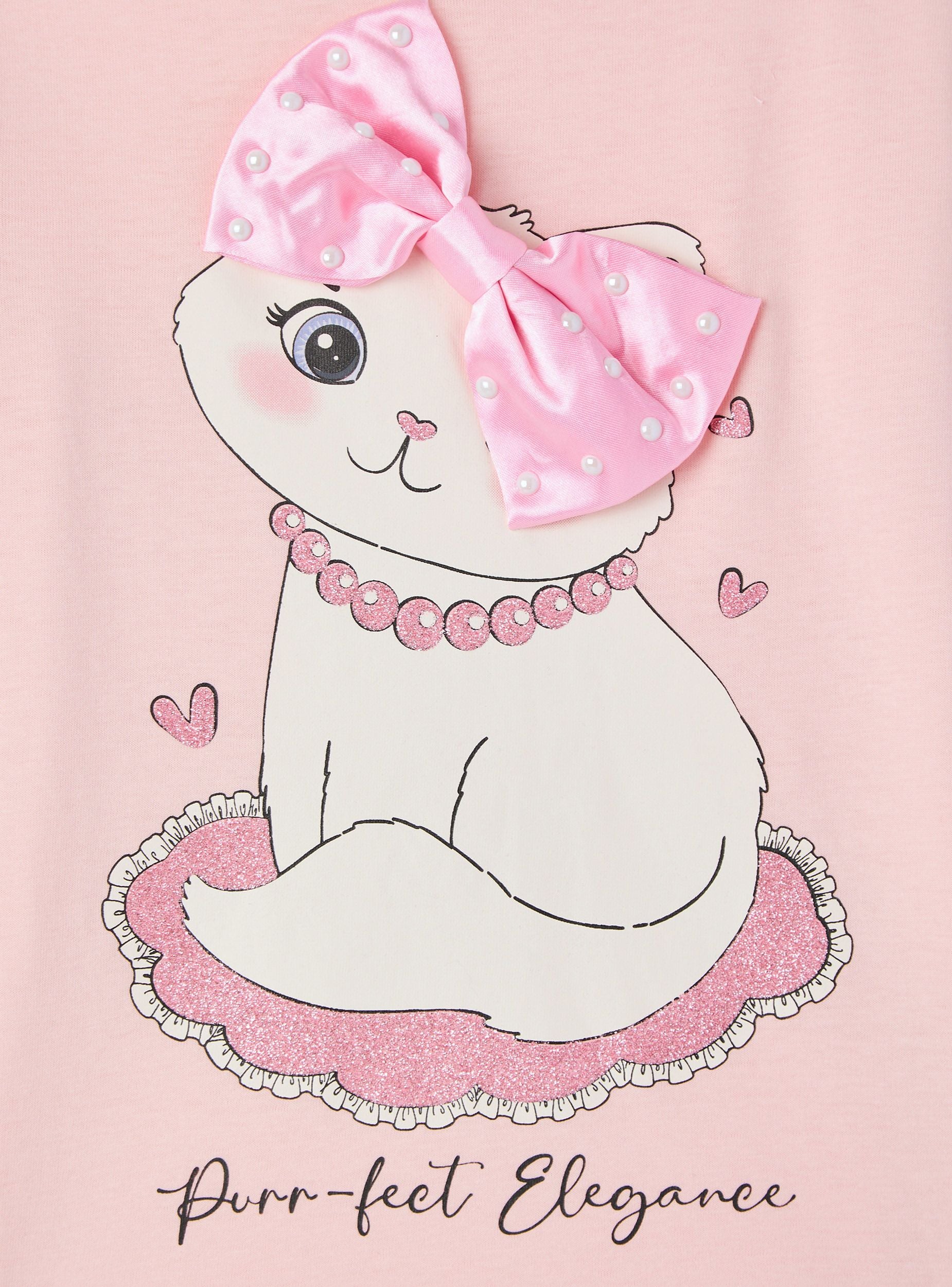 Langärmeliges Mädchen-T-Shirt, ideal für einen lässigen und bequemen Look. Es verfügt über ein Design mit einem Druck einer kleinen Katze und dekorativen Applikationen mit Schleifen und Perlen, die einen verspielten und originellen Akzent setzen. Perfekt kombinierbar mit Jeans oder Sporthosen für ein Alltagsoutfit. Die Passform ist bequem und eignet sich für schulische Aktivitäten oder Freizeitmomente.Details