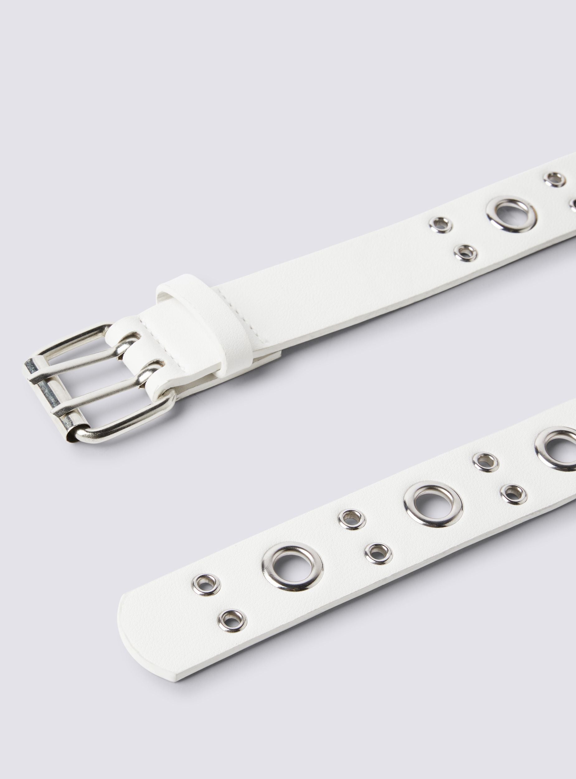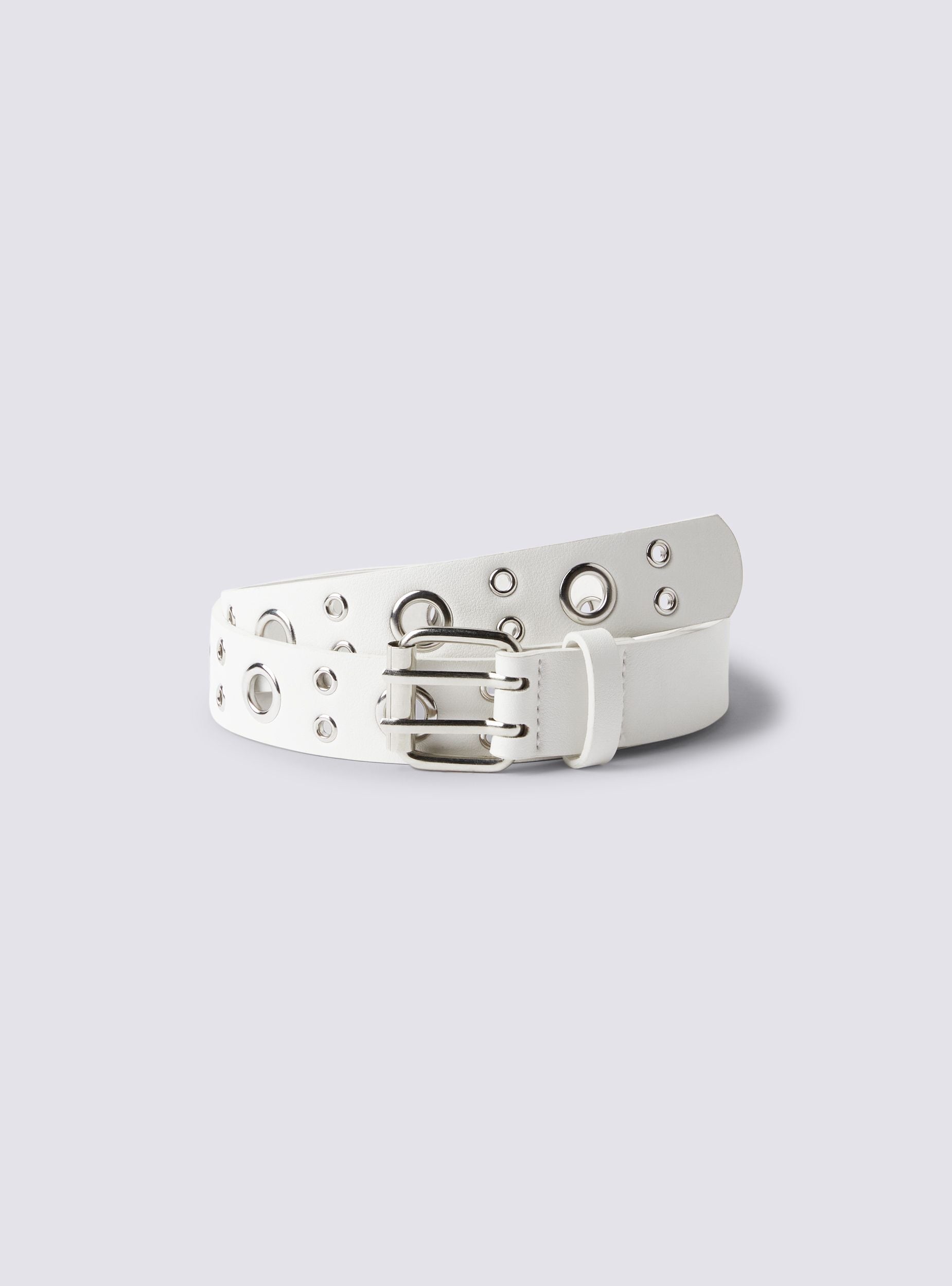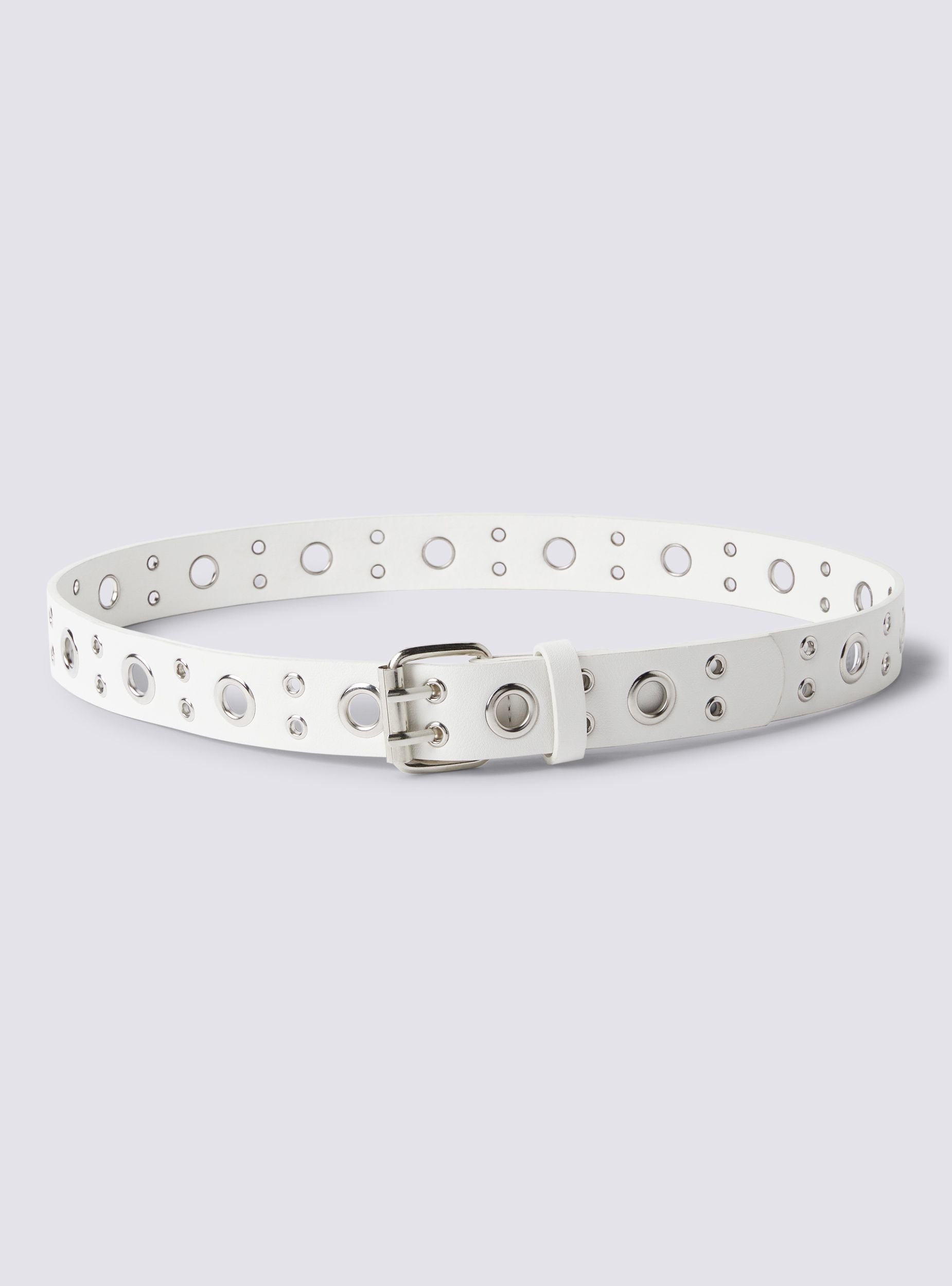 Damen-Gürtel mit einem markanten Design, bereichert durch dekorative Details wie Metallösen und kleine Nieten entlang der gesamten Länge. Ausgestattet mit einer verstellbaren Schnalle, ist er ideal, um jedem Look, sei es für lässige Outfits oder um anspruchsvollere Kombinationen zu vervollständigen, einen kühnen und originellen Akzent zu verleihen.Details