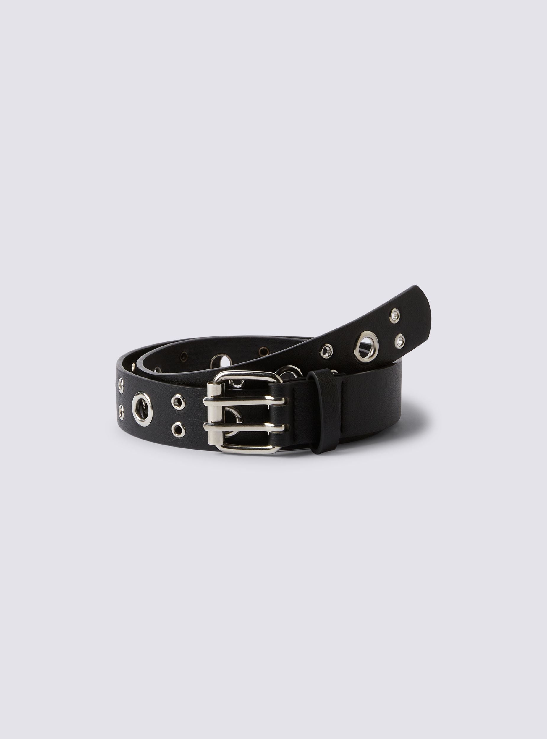 Damen-Gürtel mit einem markanten Design, verziert mit dekorativen Details wie Metallösen und kleinen Nieten entlang der gesamten Länge. Ausgestattet mit einer verstellbaren Schnalle, ist er ideal, um jedem Look, sei es für lässige Outfits oder um anspruchsvollere Kombinationen zu vervollständigen, einen kühnen und originellen Akzent zu verleihen.Details