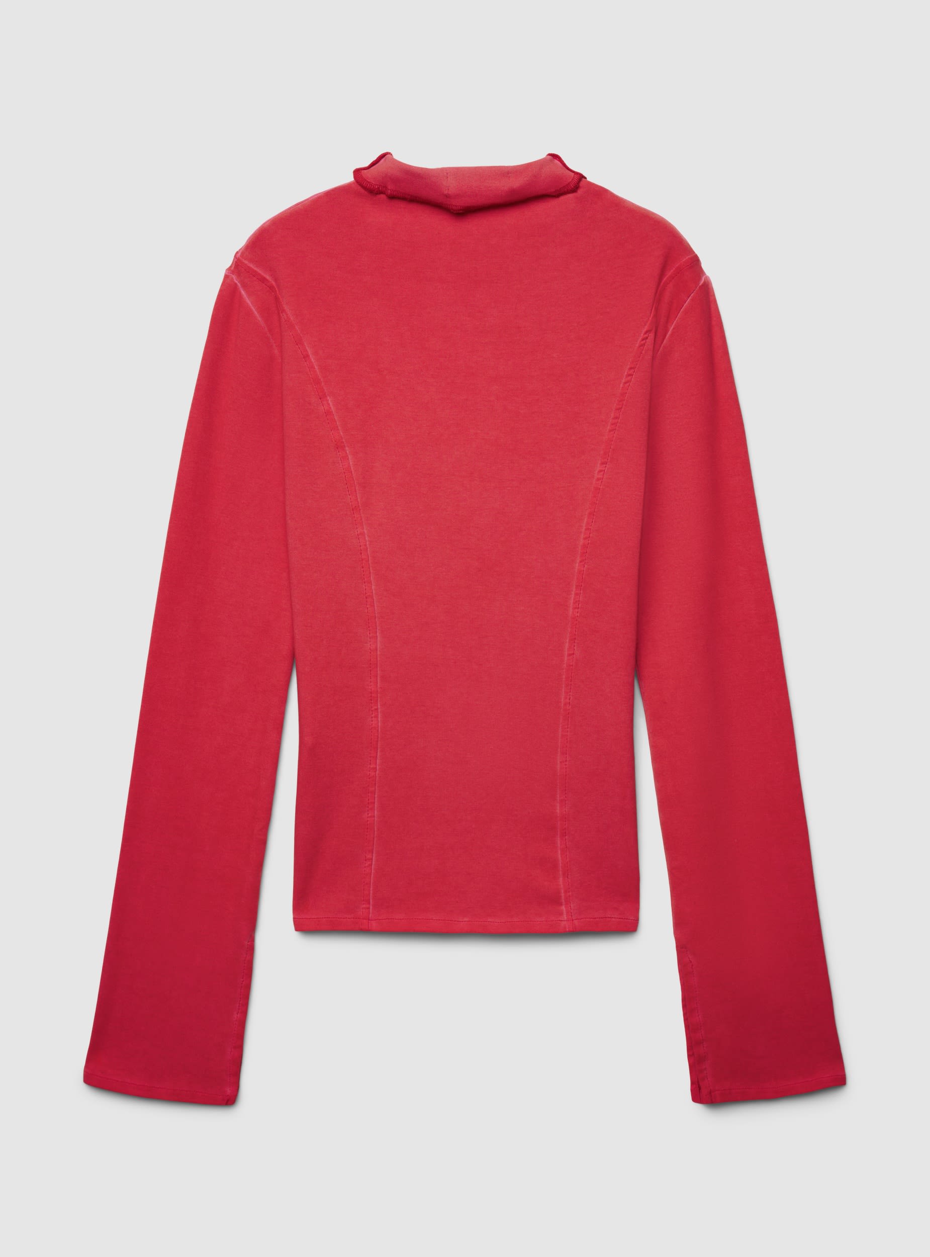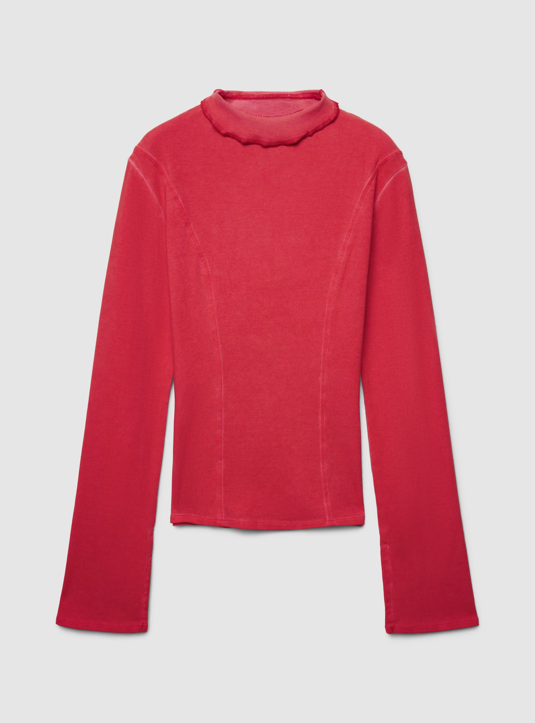 Langarm-Damenoberteil, ideal für den Alltag und perfekt unter Jacken oder Cardigans. Hoher Kragen mit gewelltem Saum im Volant-Stil, der eine feminine Note verleiht. Figurbetonte Schnittlinien auf der Vorderseite zur Betonung der Silhouette und gerader Saum. Mit Schlitzen am Ärmelabschluss. Regular Fit in Uni-Farbe. Kombinierbar mit Jeans, Midirocken oder maßgeschneiderten Hosen für vielseitige Looks vom Tag bis zum Abend. Dieses Kleidungsstück ist Teil des TRNPOPLAB-Projekts, das in Zusammenarbeit mit der NABA Mailand entstanden ist. Fashion-Design-Studierende haben Kollektionen geschaffen, die von den angesagtesten Trends inspiriert sind. Und jetzt werden sie ihre Kreationen zum Leben erwecken und direkt in deine Hände gelangen!