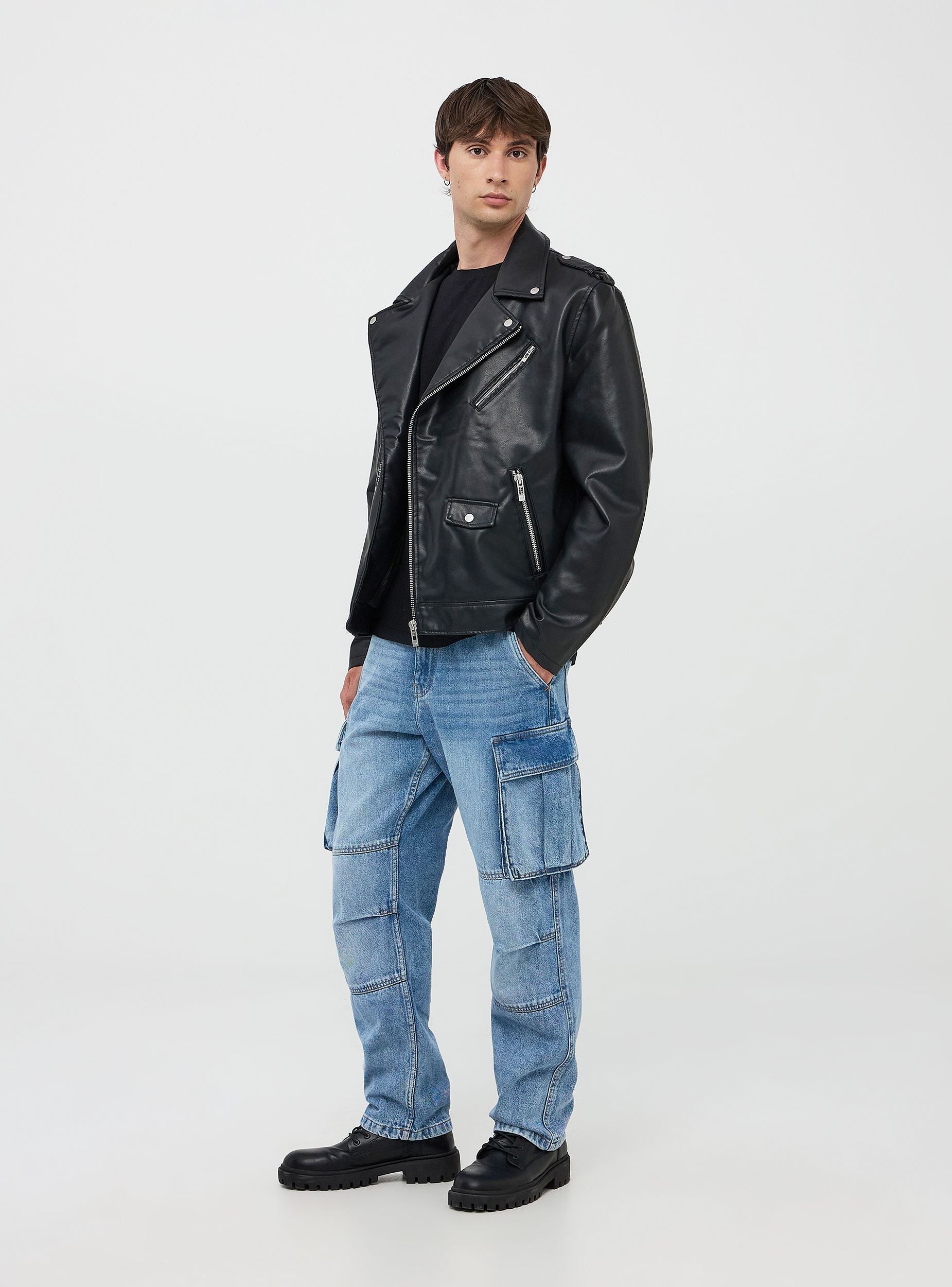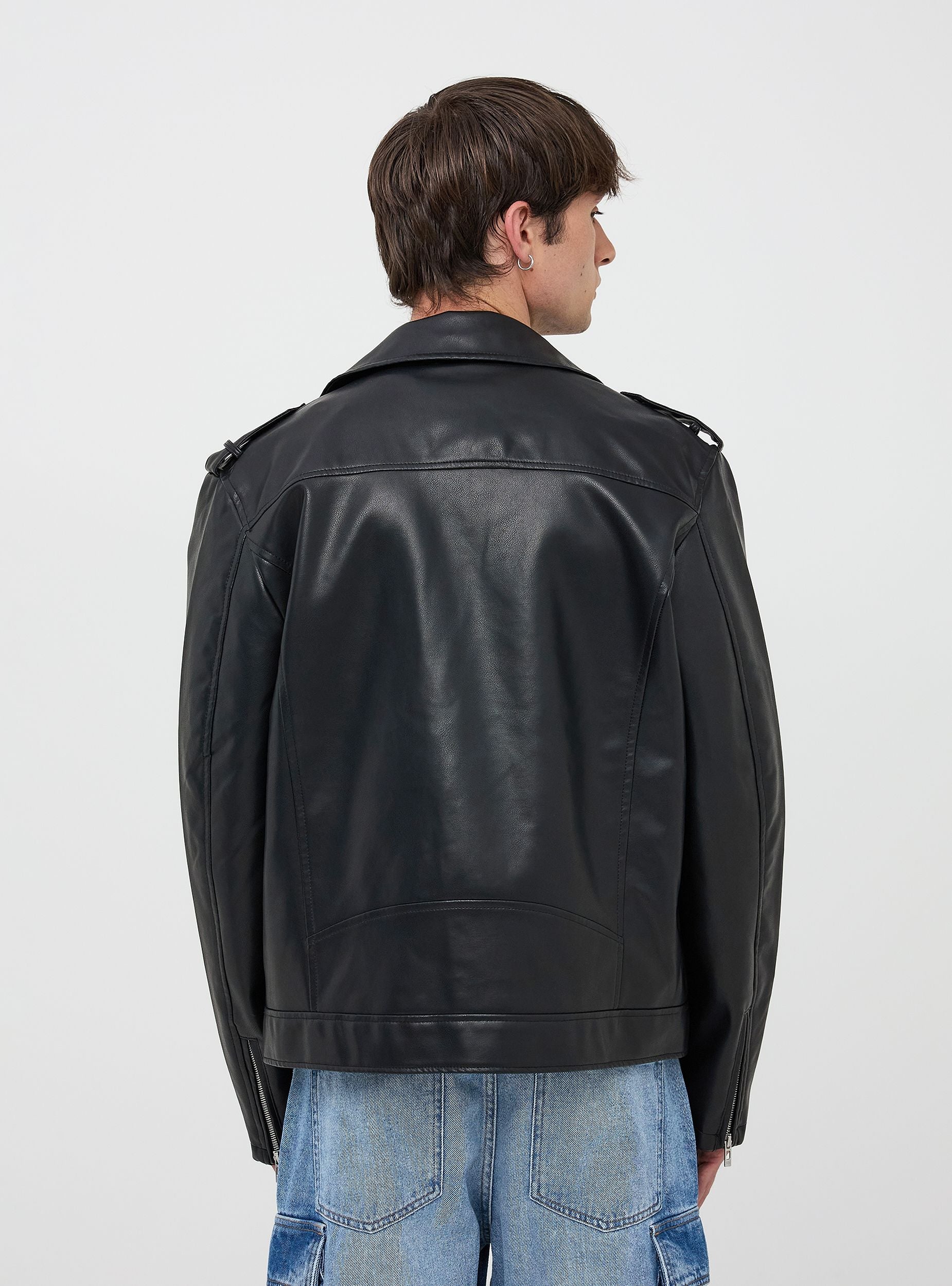 Herrenjacke im Lederlook, Modell Biker, ideal um deinem Kleiderschrank einen rockigen Stil zu verleihen. Das Design verfügt über einen asymmetrischen Reißverschluss, einen Kragen mit dekorativen Metallknöpfen und mehrere Reißverschlusstaschen für einen modernen und funktionalen Look. Die Ärmel sind mit Reißverschlüssen an den Bündchen verziert, um ein zusätzliches stilvolles Detail zu bieten. Perfekt für lässige und abendliche Anlässe, ist diese Jacke aus Kunstleder ideal zu Jeans oder Hosen zu tragen, oder über einem Sweatshirt für ein sportlicheres Outfit. Wähle diese must-have Herrenjacke, ein vielseitiges und modisches Kleidungsstück, das deinem Stil Charakter verleiht.Details