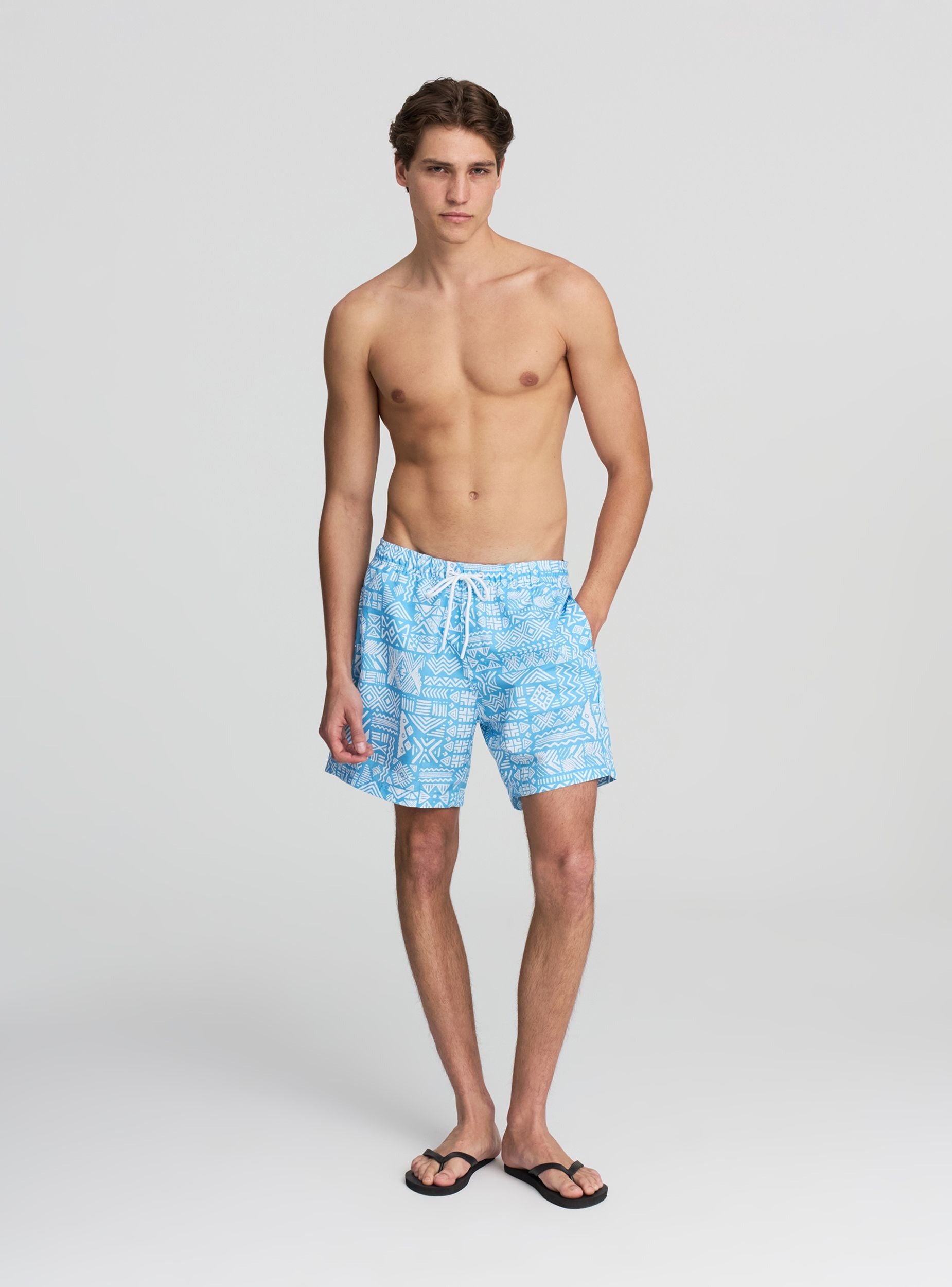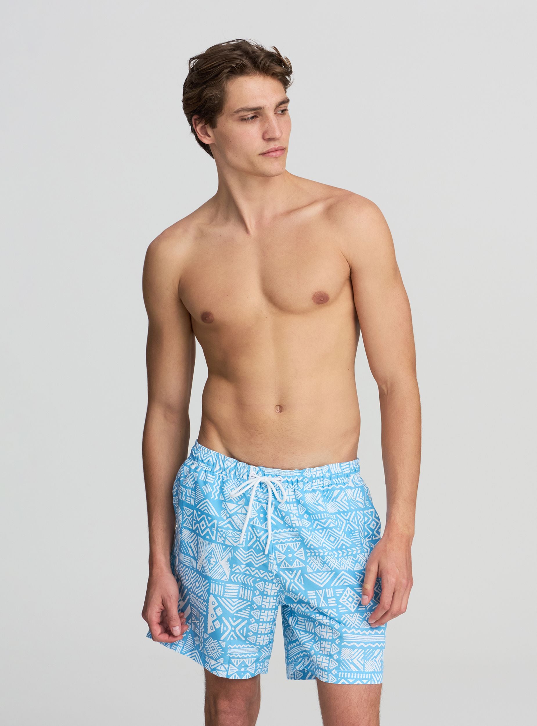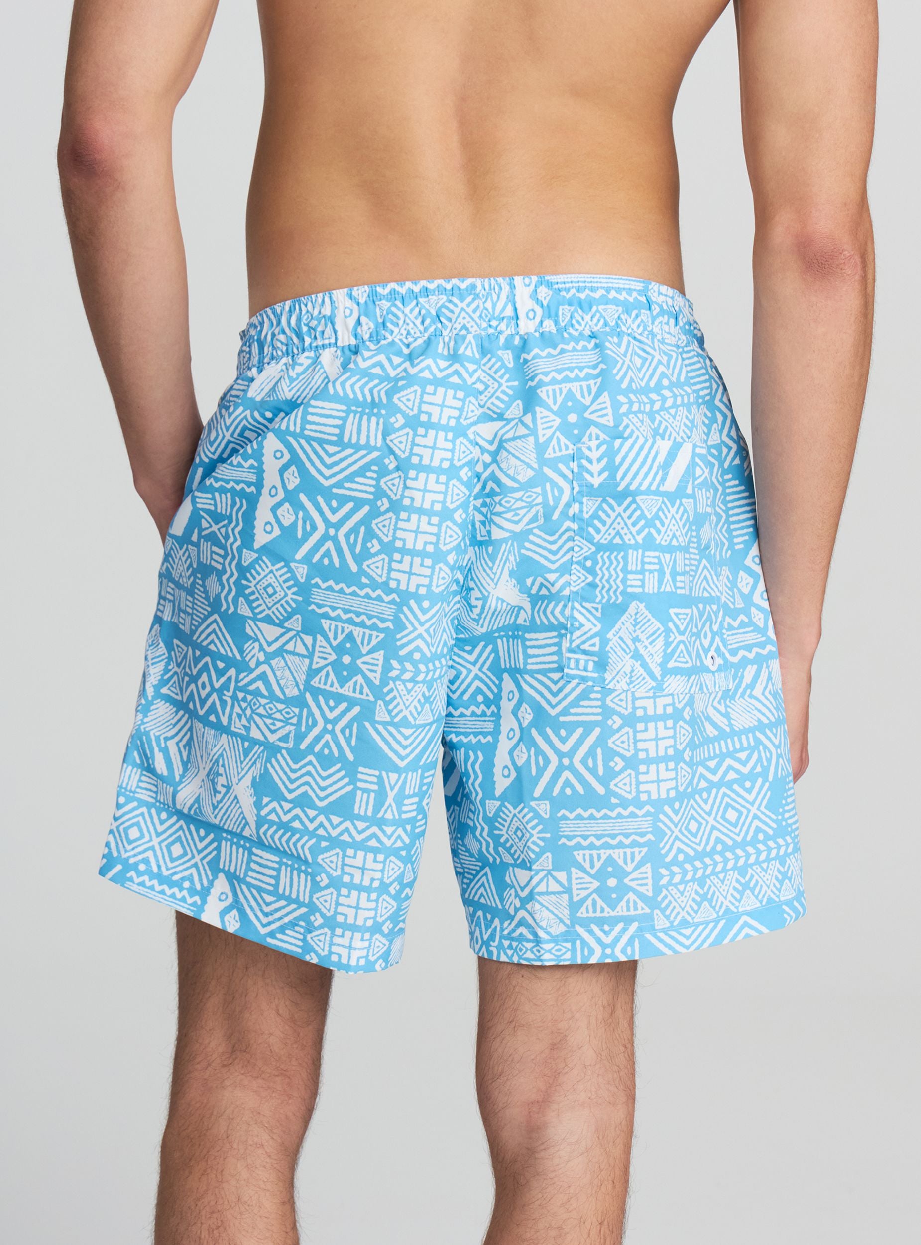 Herren-Badehose mit originellem Design, diese Bermudas mit ethnischem Muster sind ideal für einen markanten Look am Strand oder im Schwimmbad. Der verstellbare Kordelzug sorgt für eine perfekte Passform, während die Seitentaschen Praktikabilität bieten. Die hintere Tasche mit Klettverschluss fügt ein funktionales Detail hinzu. Perfekt kombinierbar mit einem T-Shirt und Flip-Flops für einen stilvollen Sommer.