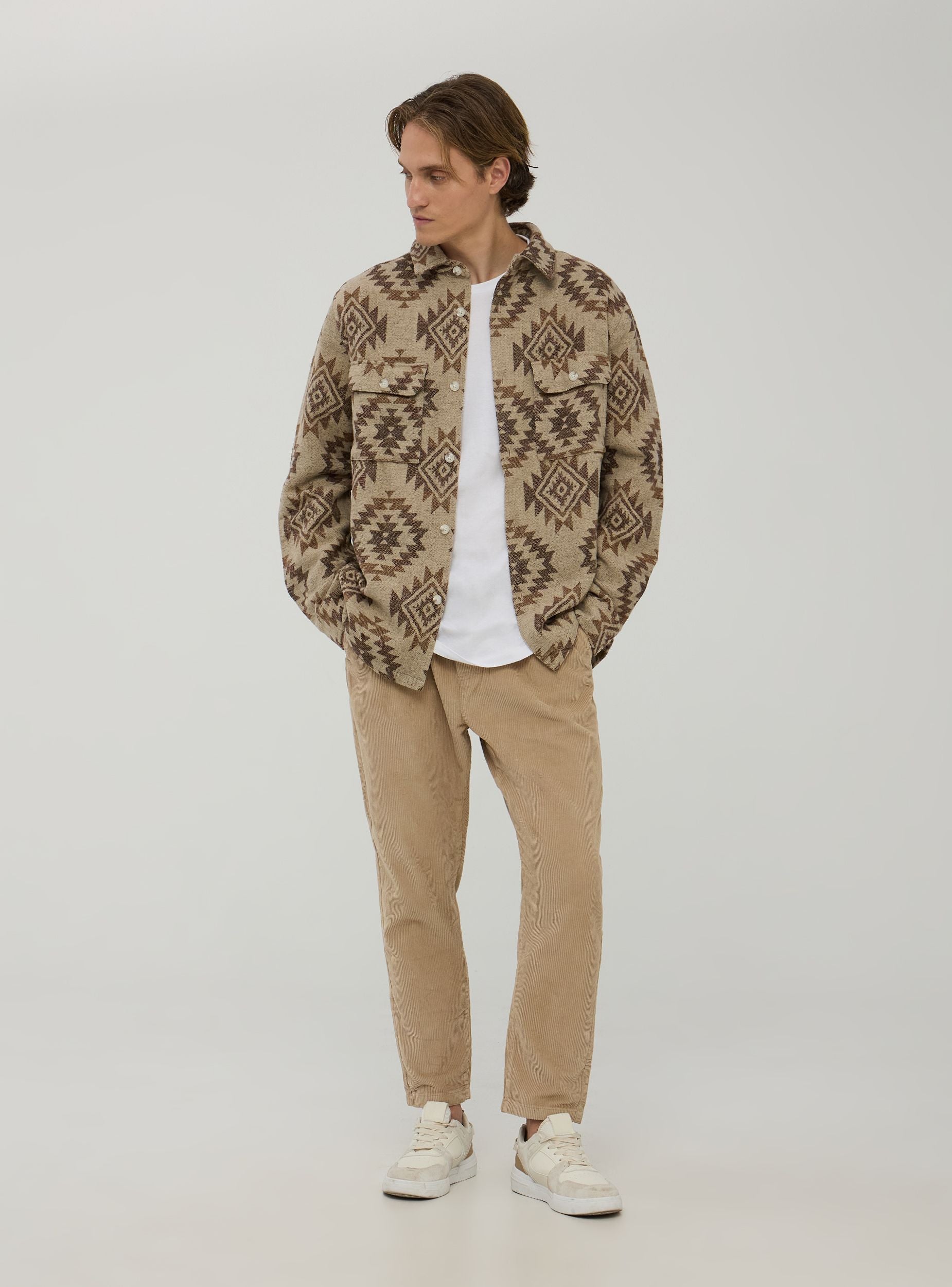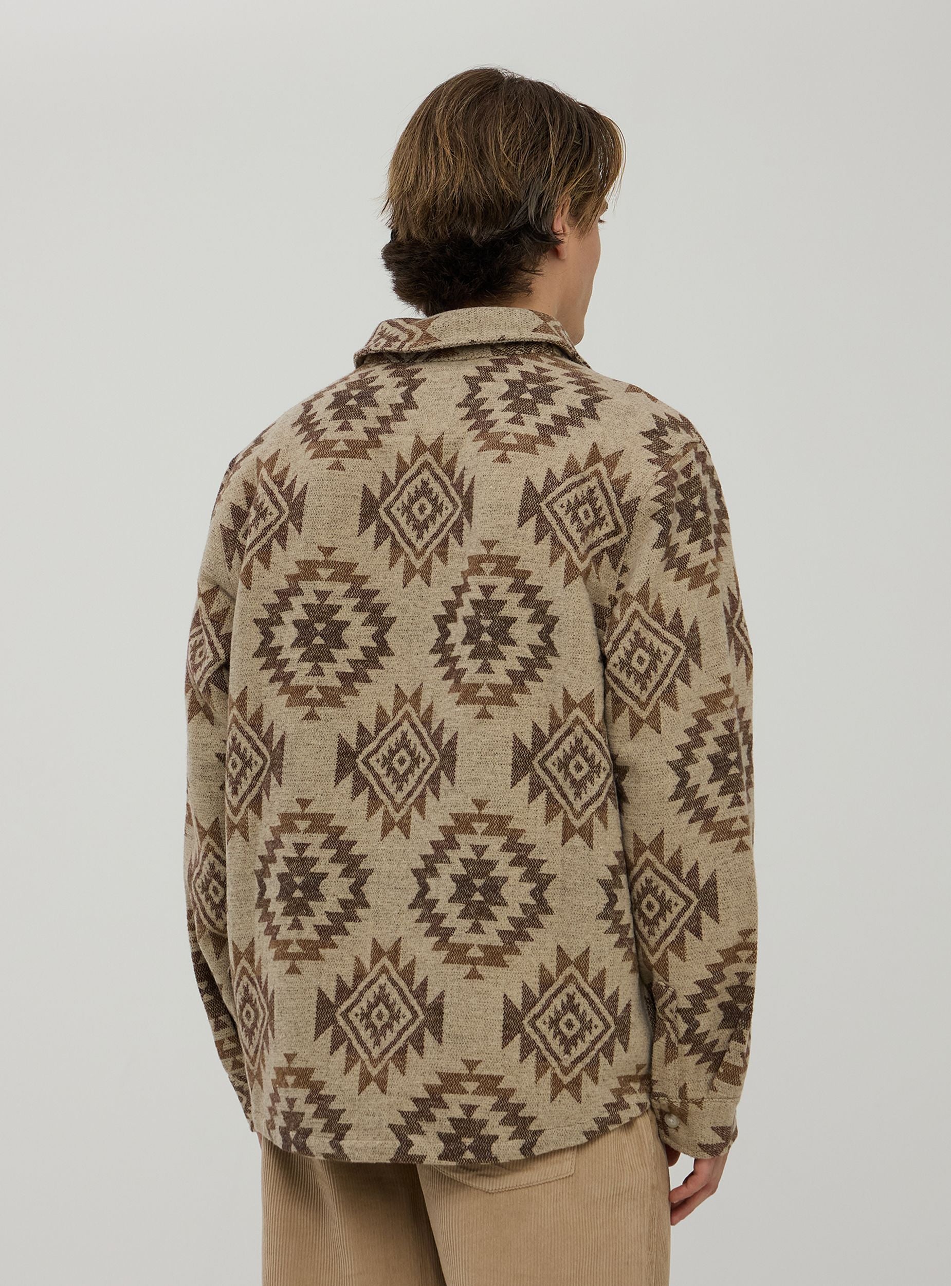 Herren Flanell Shacket mit ethnischem Muster. Es hat einen klassischen Kragen und eine vordere Knopfleiste. Das Hemd verfügt über zwei Brusttaschen mit Klappe, die ebenfalls mit Knöpfen geschlossen sind. Die langen Ärmel enden mit Manschetten, die mit Knöpfen geschlossen werden. Dieses Hemd ist ideal für einen lässigen Look.Details