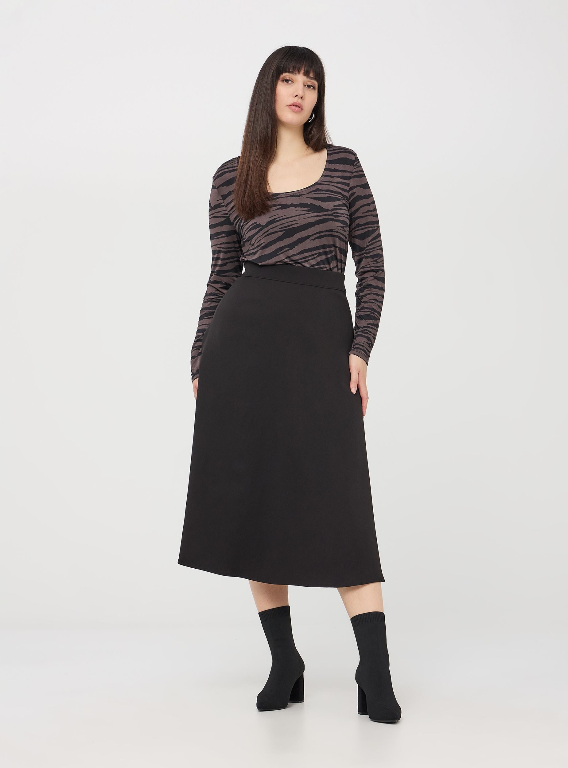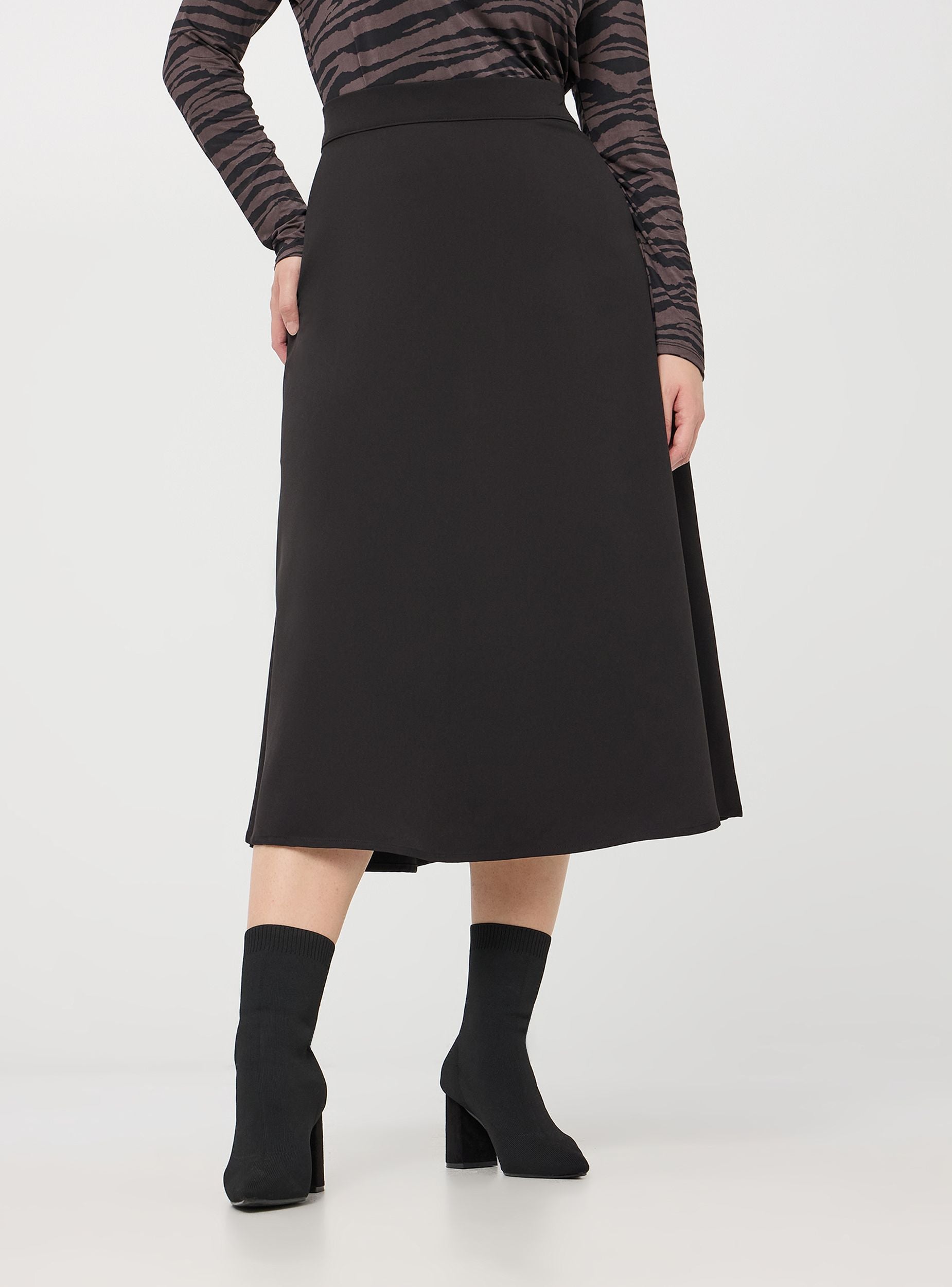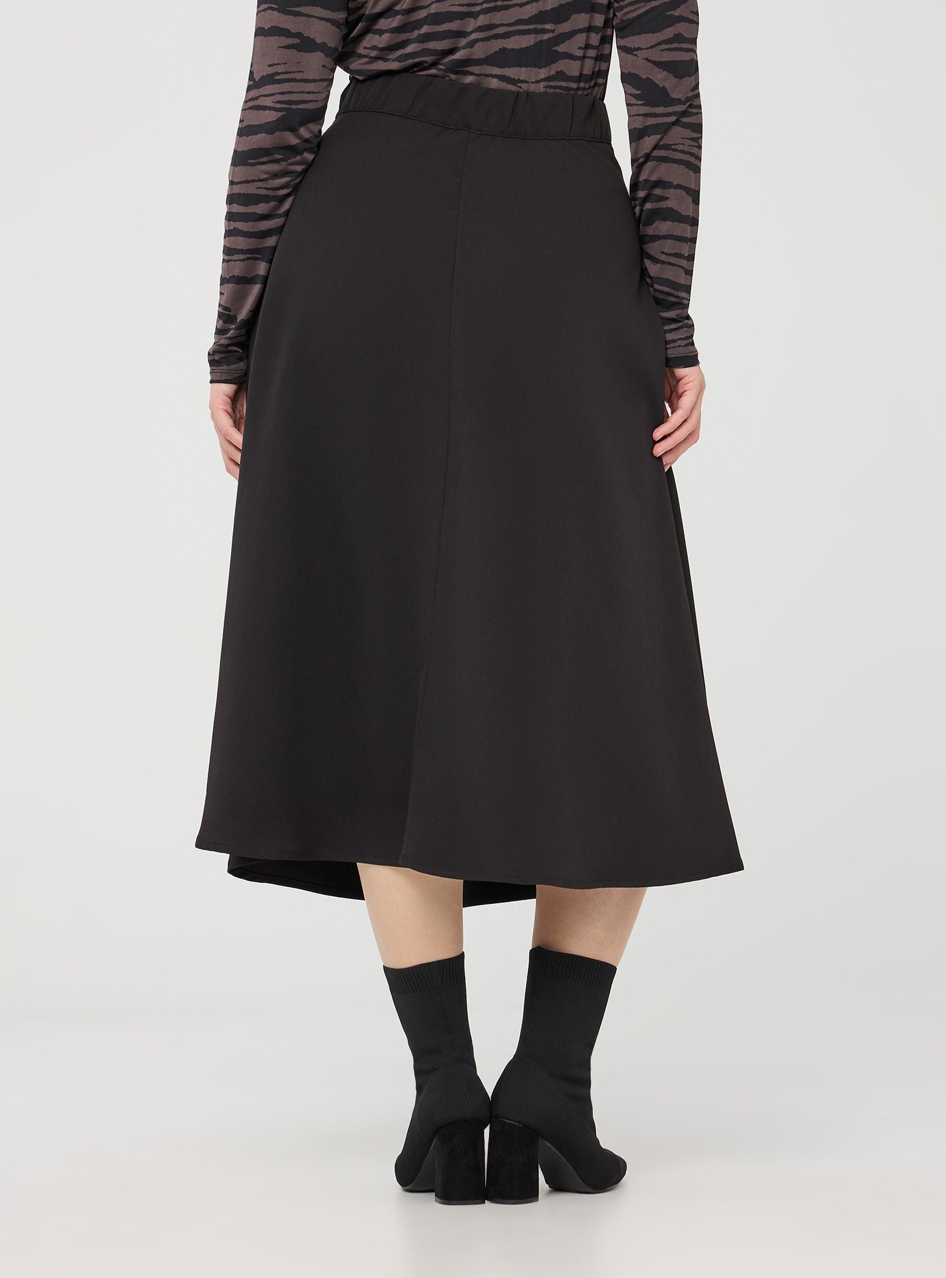Damenrock ausgestellt, gekennzeichnet durch eine weite und fließende Linie, die Komfort und Bewegungsfreiheit bietet. Die Taille ist elastisch für eine bequeme und anpassungsfähige Passform. Der Rock verfügt über einen seitlichen unsichtbaren Reißverschluss, der einen sauberen und eleganten Look garantiert. Sorgt für eine elegante Passform.Details