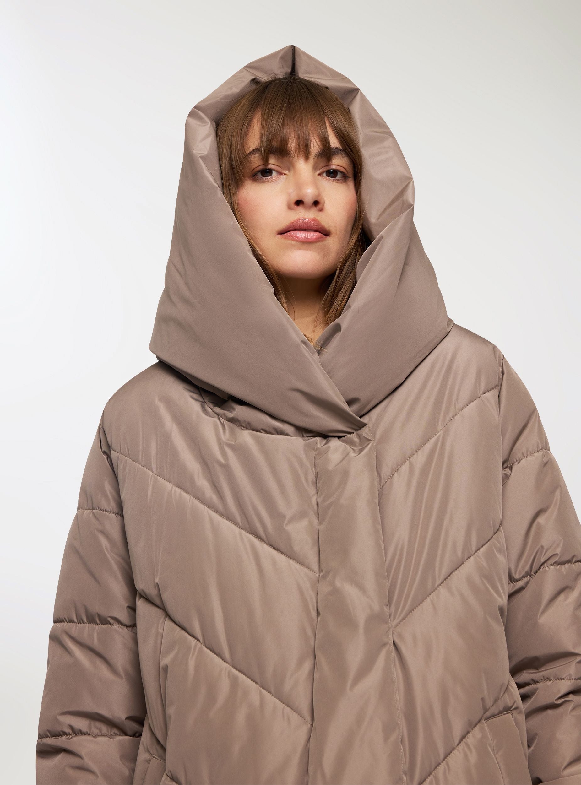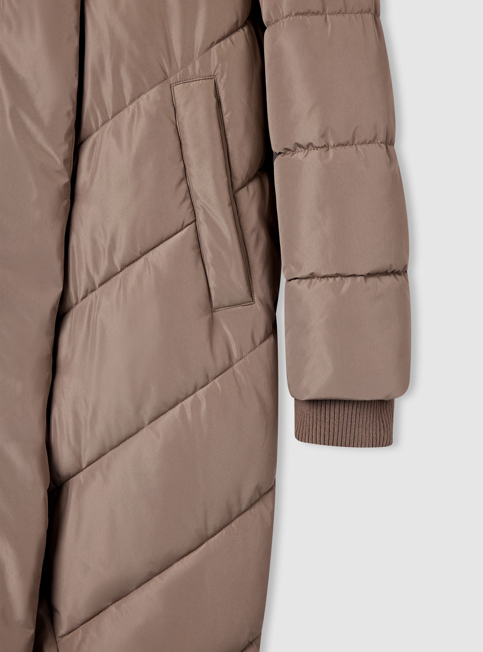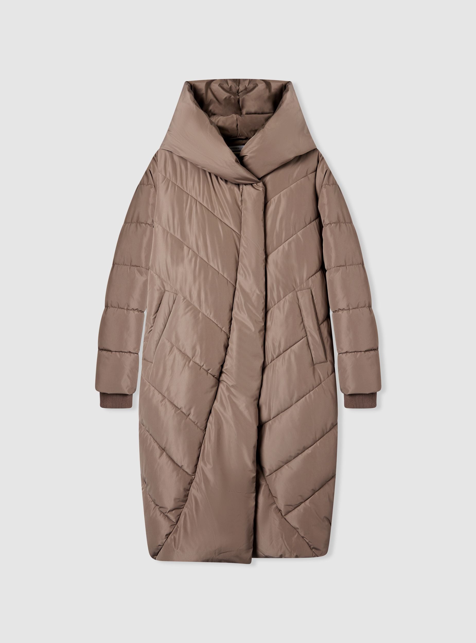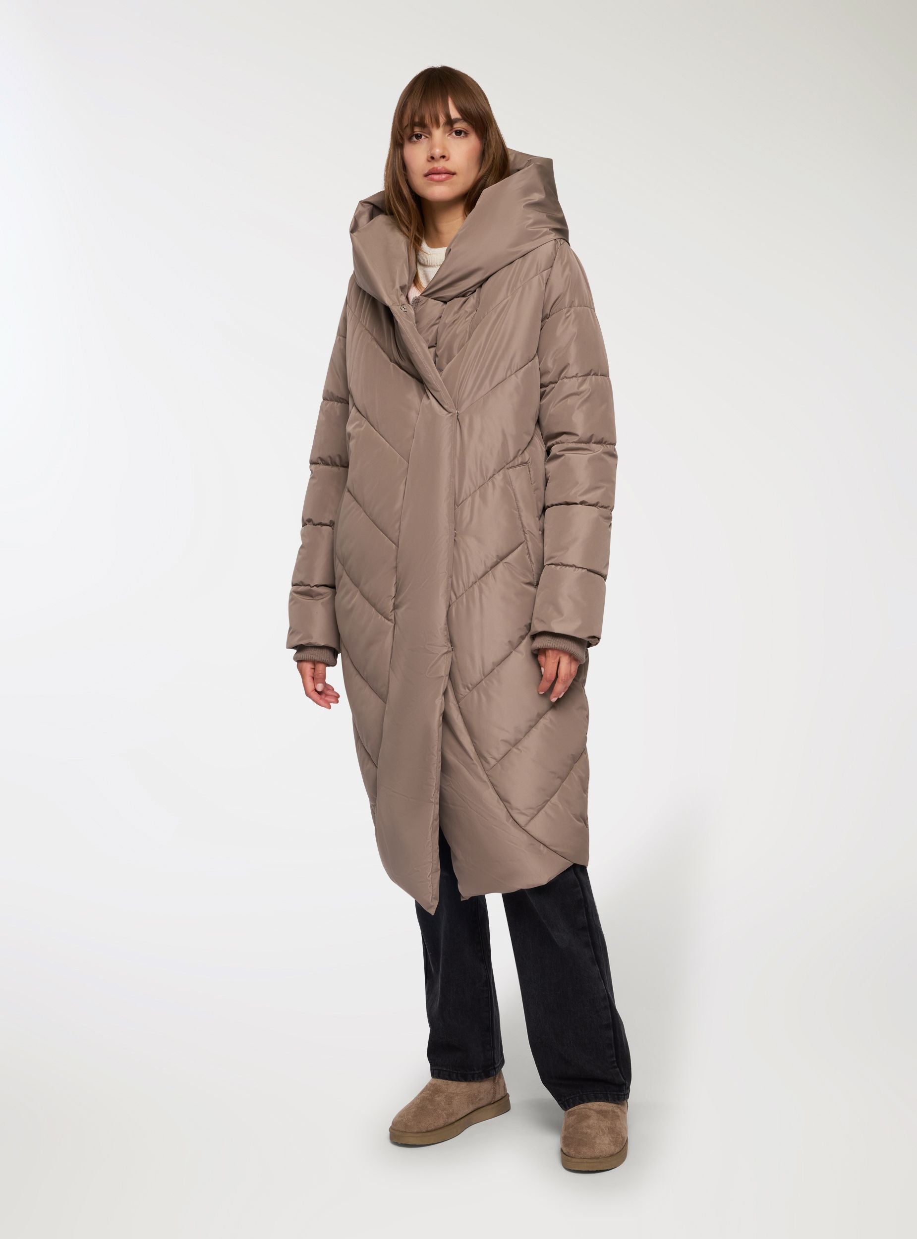 Damenlange, gepolsterte Jacke, perfekt für die kalten Monate, um Komfort und Stil zu vereinen. Das gesteppte Design schmeichelt der Silhouette, während die integrierte Kapuze zusätzlichen Schutz gegen Wind und Regen bietet. Die langen Ärmel mit inneren Bündchen sorgen für eine bessere Wärmehaltung. Ausgestattet mit praktischen Seitentaschen, einem Reißverschluss und Druckknöpfen vereint diese Jacke Funktionalität und sorgfältig gestaltete Details. Ideal für den täglichen Gebrauch in der Stadt oder bei Spaziergängen im Freien, lässt sie sich leicht mit Leggings, Jeans oder Sweatpants für einen urbanen und zeitgemäßen Look kombinieren.