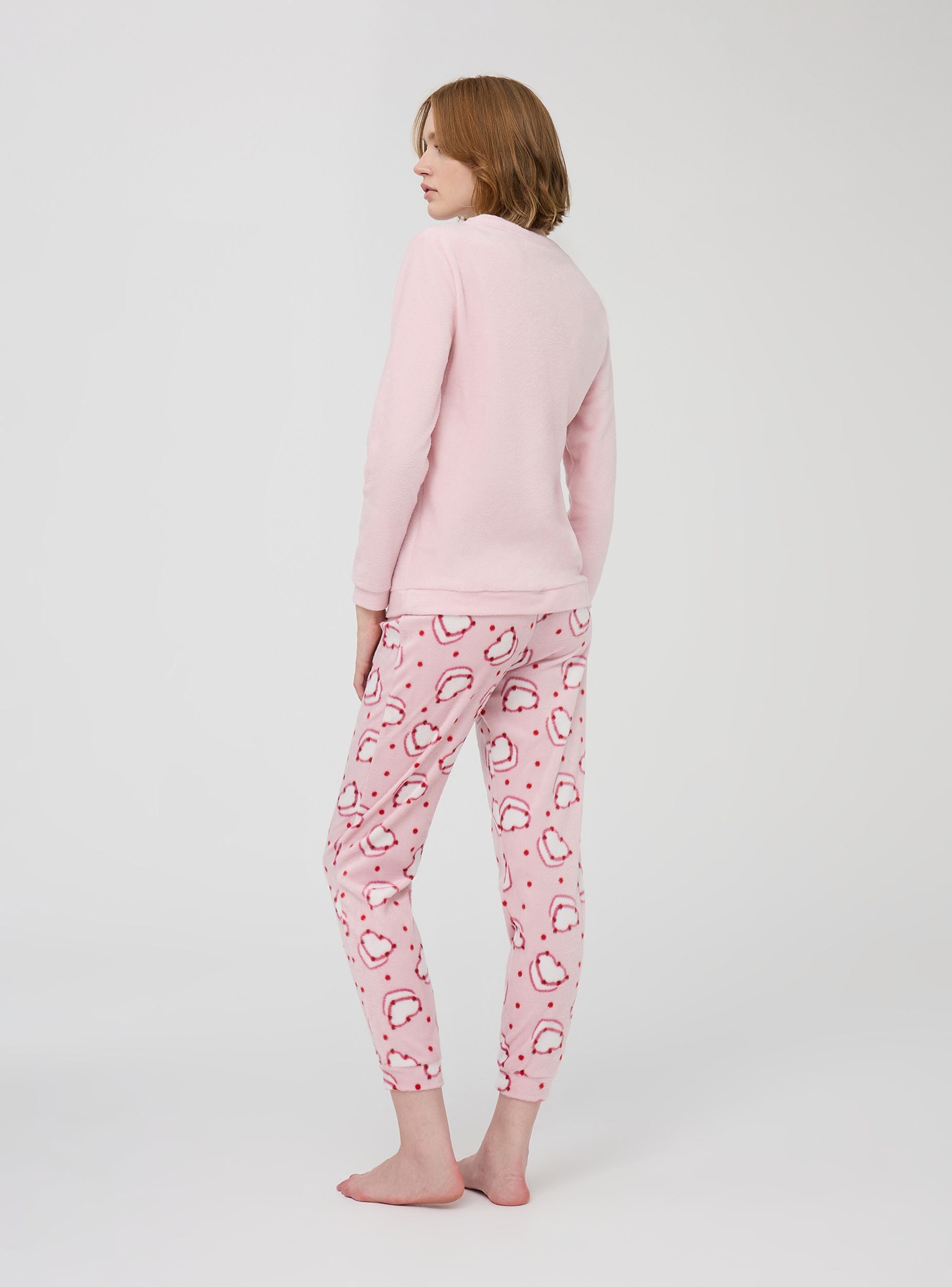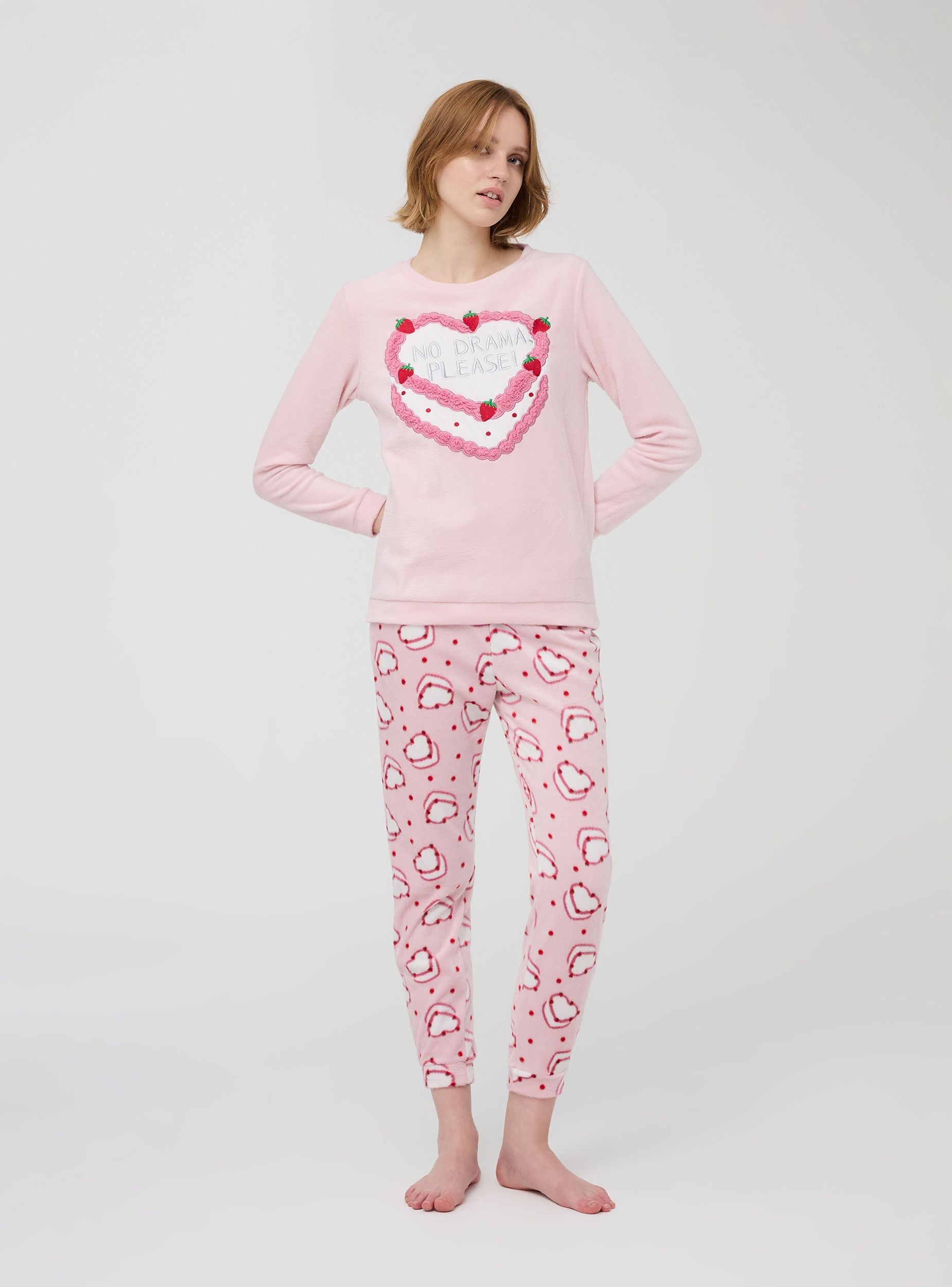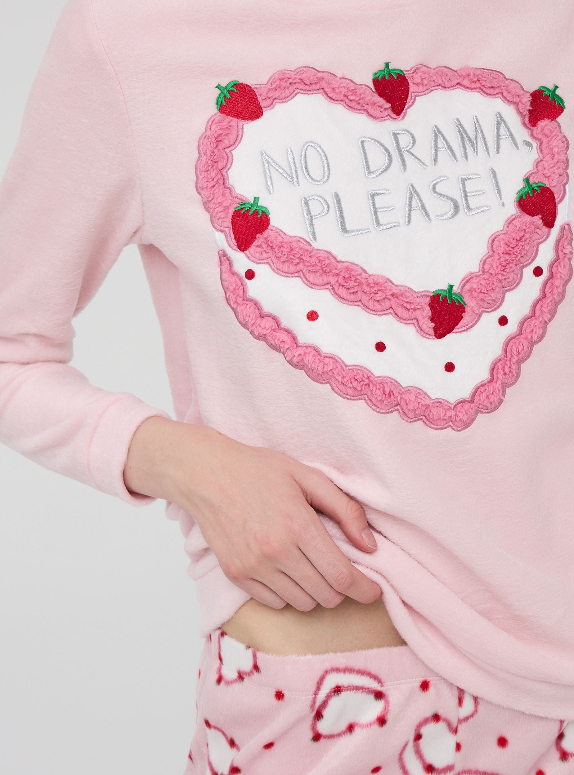Damen-Pyjama bestehend aus einem Langarmshirt und langen Hosen. Das Shirt ist mit einem herzförmigen Kuchen und dem Schriftzug "No drama, please!" mit Sherpa-Details dekoriert. Die Hosen haben ein passendes Allover-Muster. Der Stoff ist aus warmem Fleece, perfekt für kalte Winterabende.Details