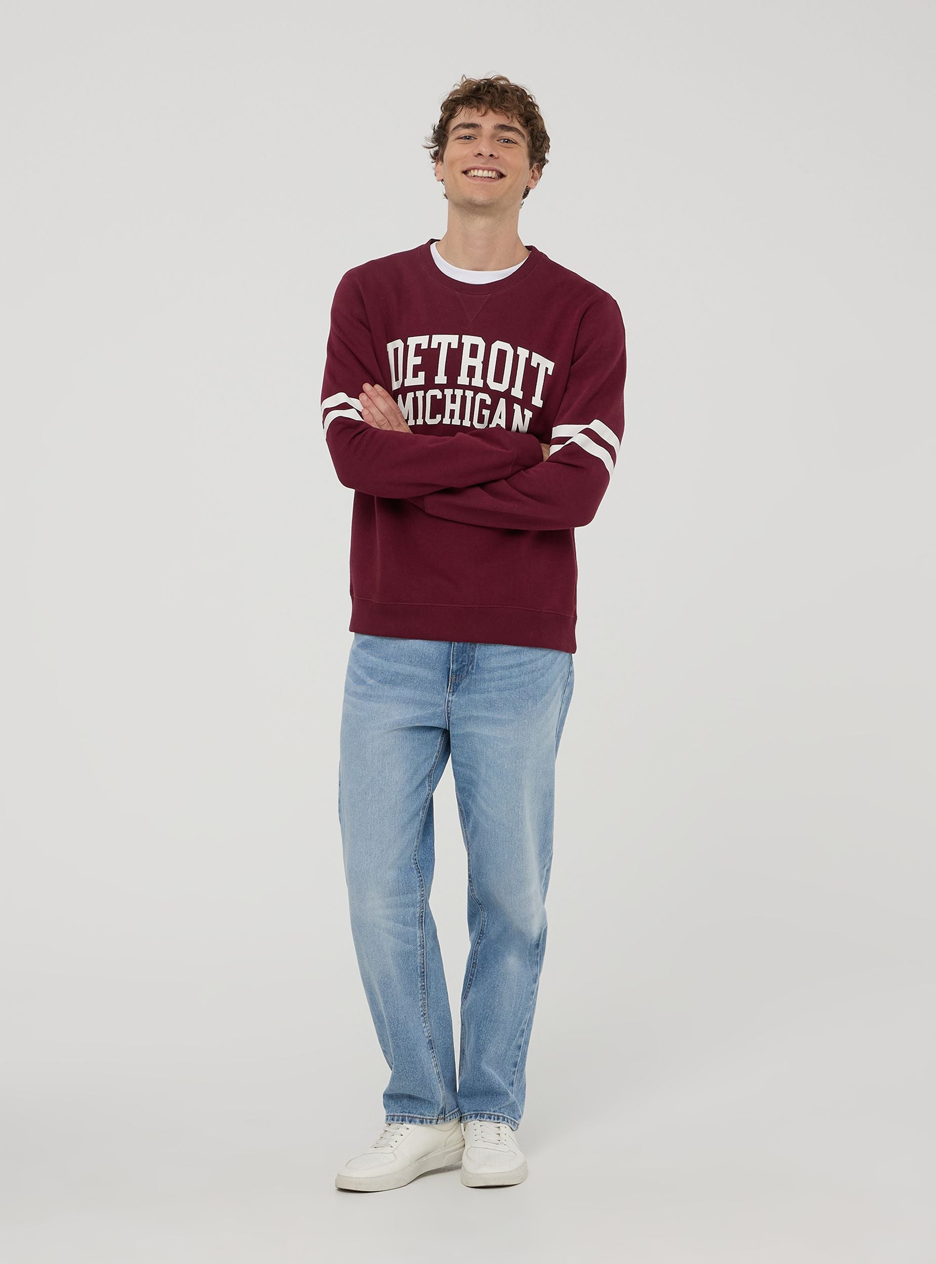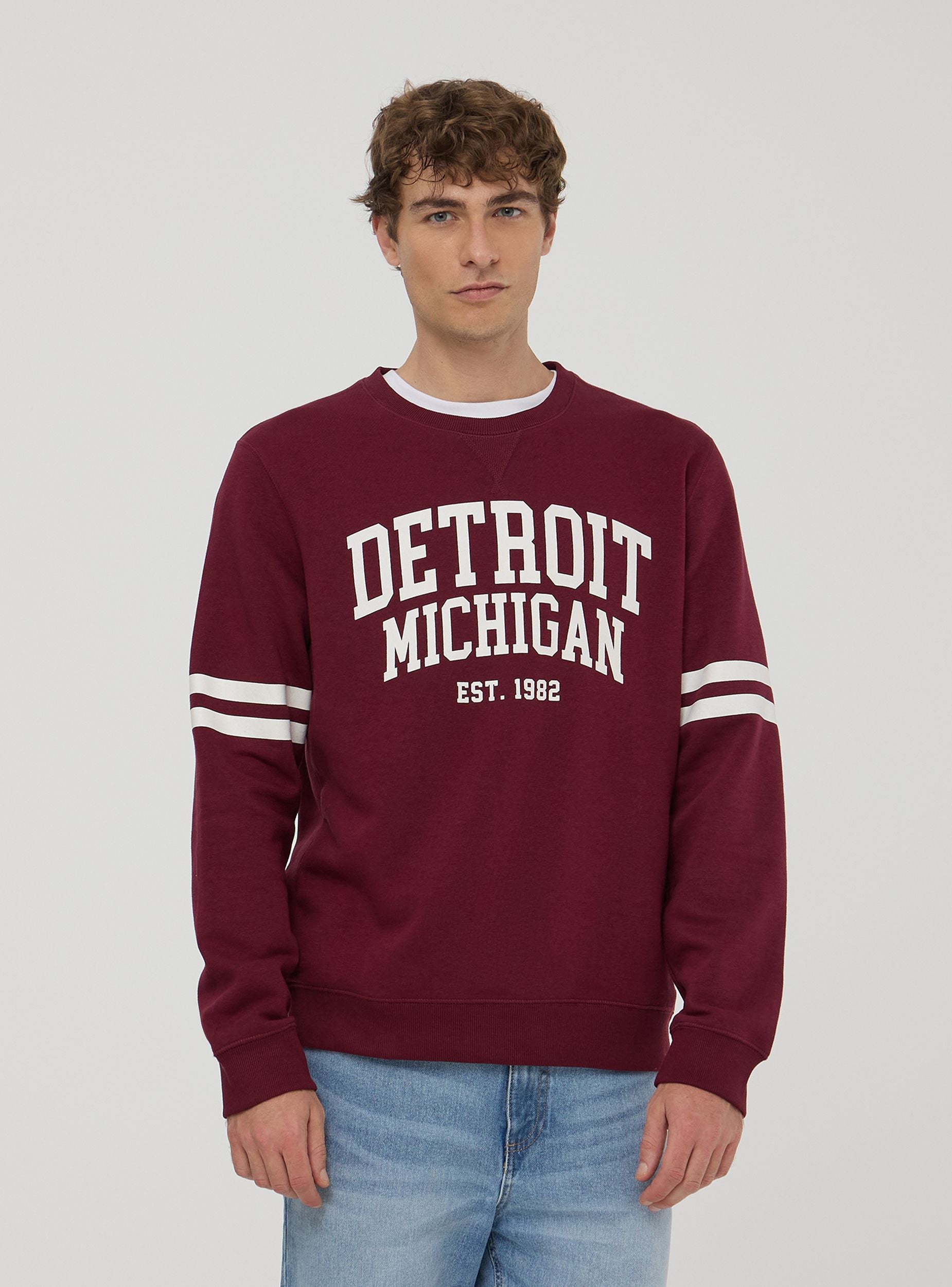 Men's long sleeve sweatshirt without a hood, made from heavy fabric enriched with a college-style front print and decorative bands on the sleeves. The casual and sporty design is completed with ribbed cuffs, hem and collar, ensuring a comfortable fit. This sweatshirt is ideal for adding a touch of casual style to your everyday wardrobe. It pairs easily with jeans or sports trousers for a versatile and trendy look.Details