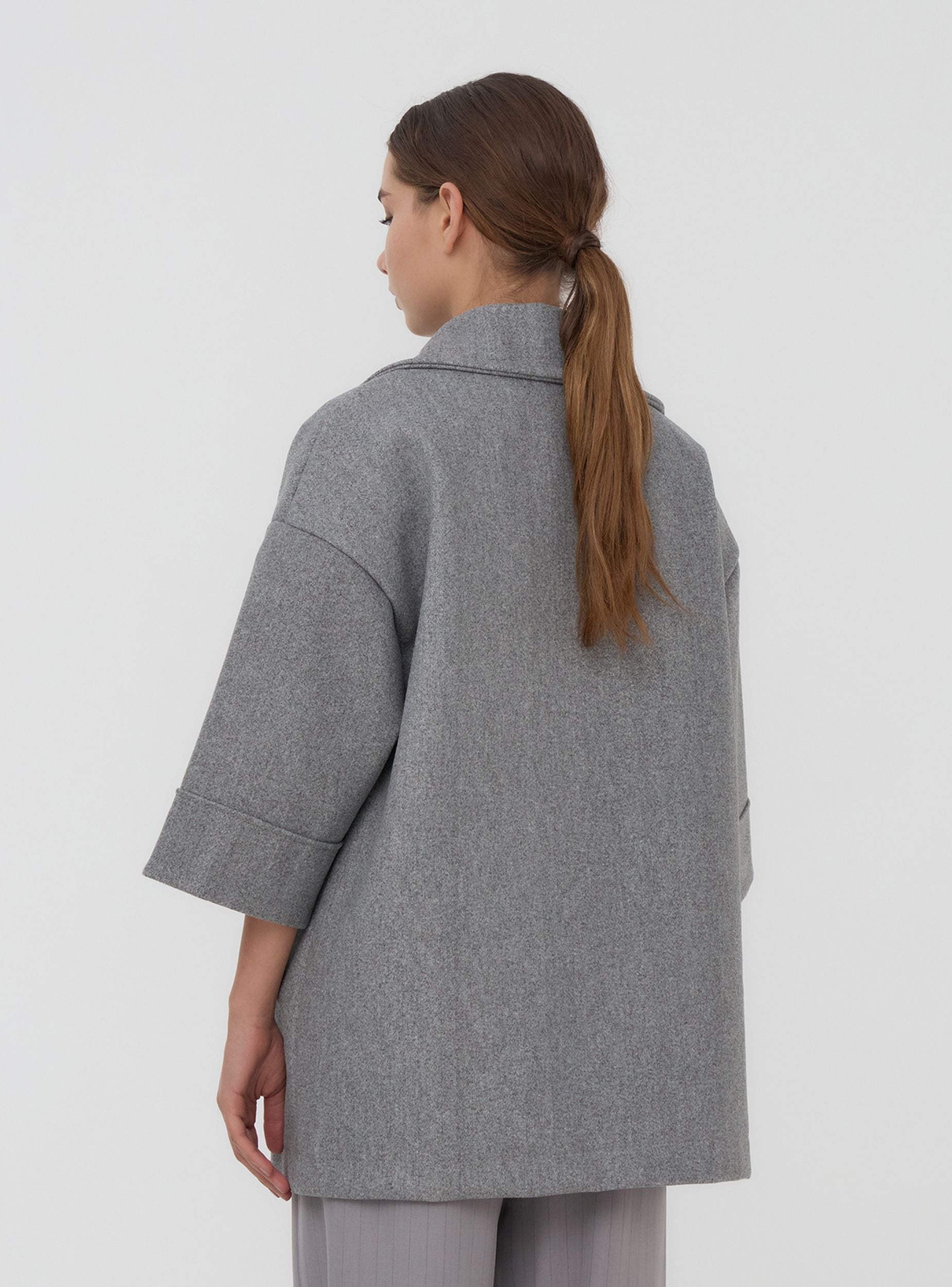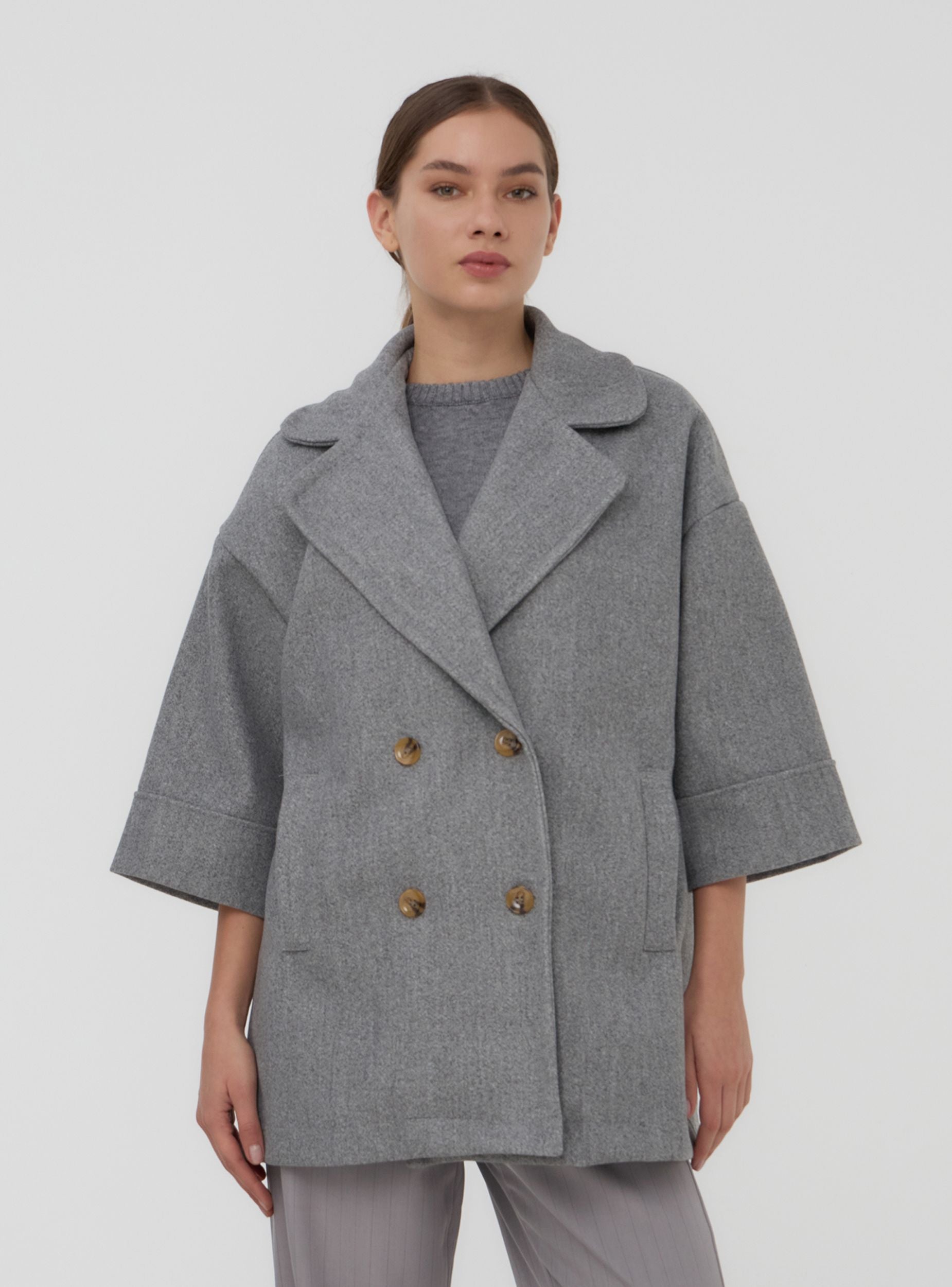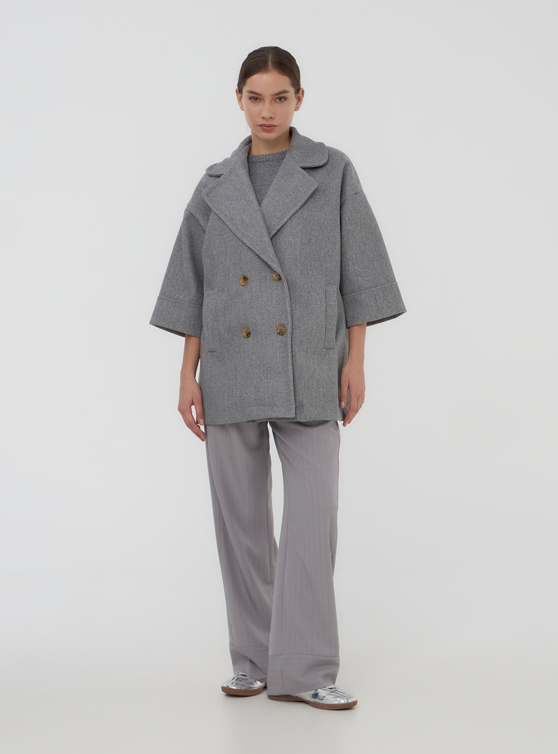 Women's oversized coat with a double-breasted design and buttons that add an elegant touch. The wide sleeves and soft silhouette provide comfort and contemporary style, perfect for tackling cooler days. A versatile and trendy piece, ideal for completing sophisticated or casual looks with a touch of personality.
