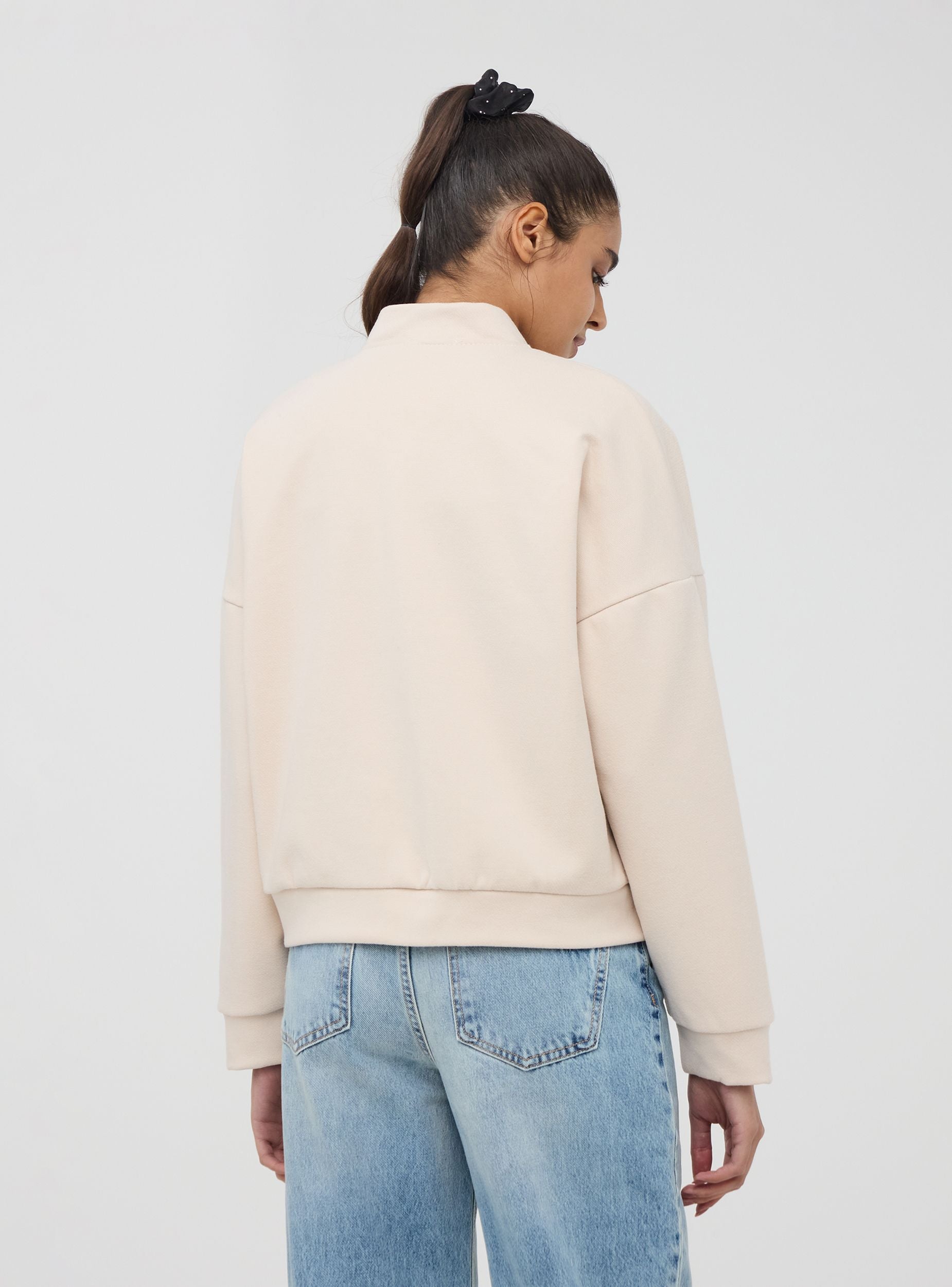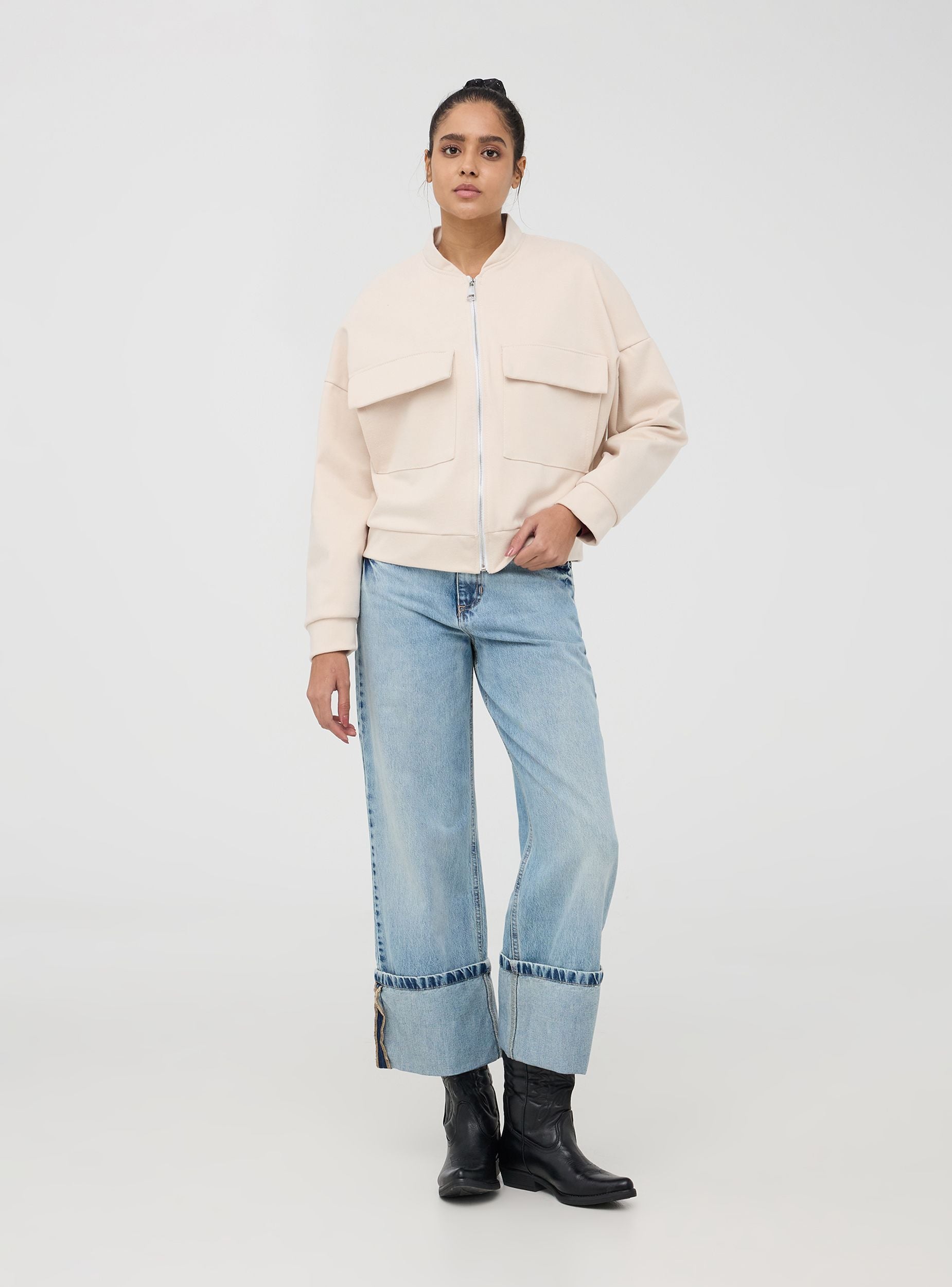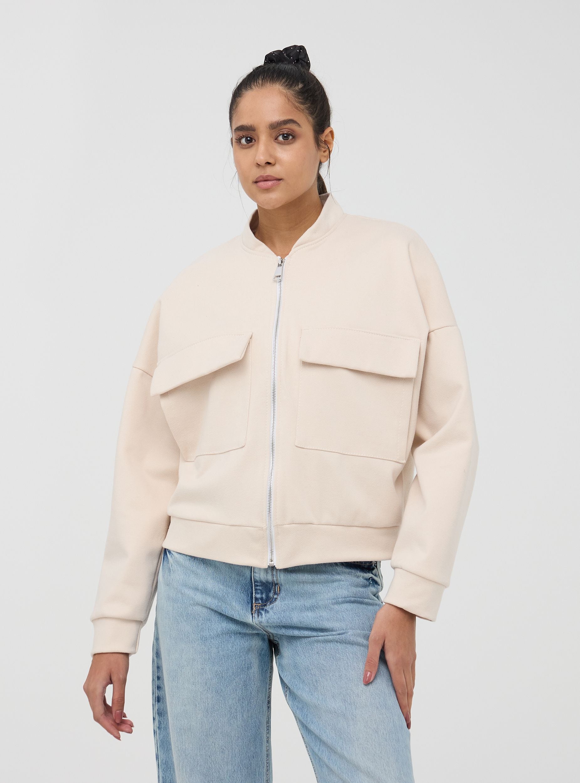 Women's bomber jacket in a solid colour, characterised by a soft appearance thanks to the velour fabric that adds a refined touch. It features a full-length zip front closure and two large flap pockets on the front, perfect for a casual yet functional look. The long sleeves and regular fit design make it ideal for everyday wear. A versatile piece, easy to match and suitable for various occasions, with a design that enhances simplicity and comfort.Details
