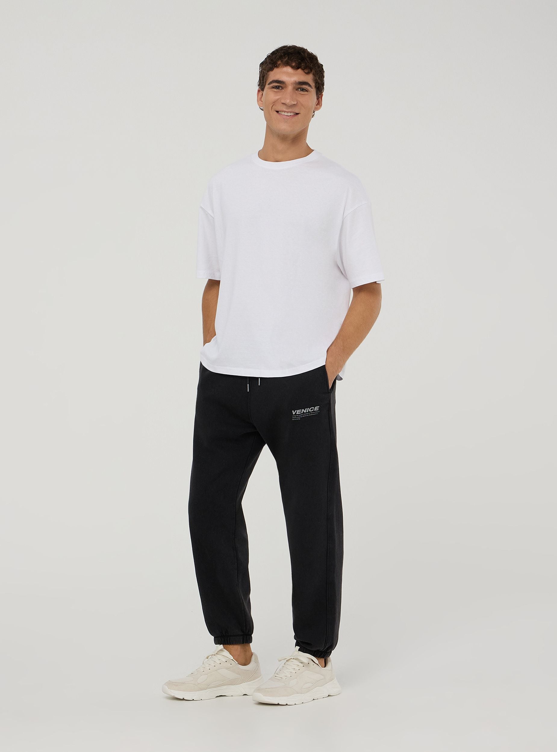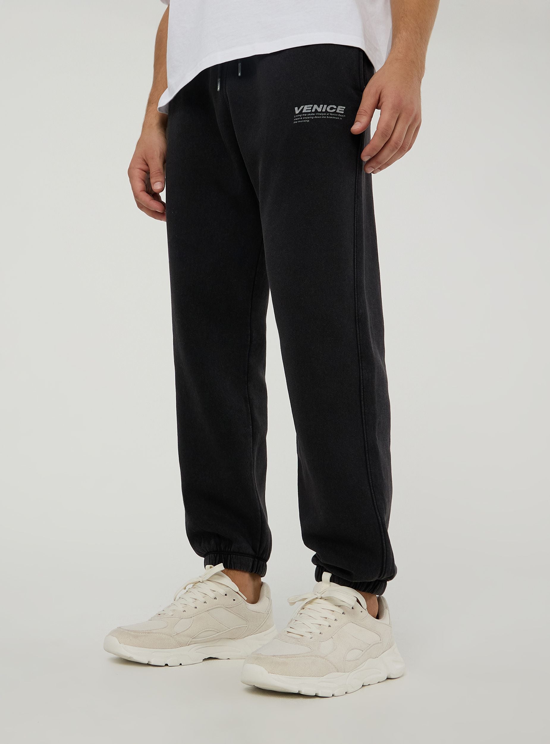 Men's jogger trousers made from acid wash effect fabric with a small writing on one leg. Equipped with a drawstring at the waist that allows for adjustable fit, elasticised waist and cuffs, two side pockets, and one back pocket. Comfortable and perfect for casual or sporty outfits.Details